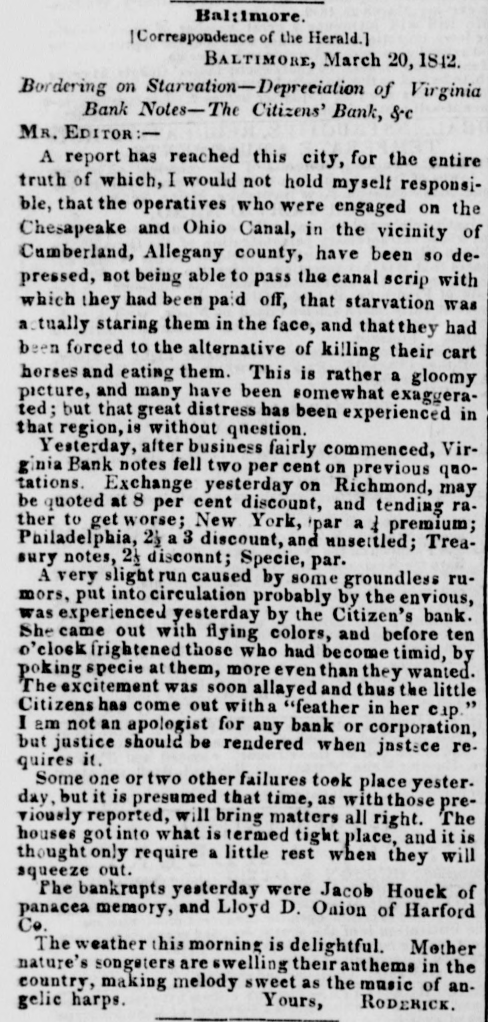 Baltimore. Correspondence of the Herald.] BALTIMORE, March 20, 1842. Bordering on Starvation-Depreciation of Virginia Bank Notes- The Citizens' Bank, &°C MR. EDITOR:A report has reached this city, for the entire truth of which, I would not hold myself responsible, that the operatives who were engaged on the Chesapeake and Ohio Canal, in the vicinity of Cumberland, Allegany county, have been so depressed, not being able to pass the canal scrip with which they had been paid off, that starvation was a tually staring them in the face, and that they had been forced to the alternative of killing their cart horses and eating them. This is rather a gloomy picture, and many have been somewhat exaggerated; but that great distress has been experienced in that region, is without question. Yesterday, after business fairly commenced, Virginia Bank notes fell two per cent on previous qnotations. Exchange yesterday on Richmond, may be quoted at 8 per cent discount, and tending rather to get worse; New York, par a t premium; Philadelphia, 24 a 3 discount, and unsettled; Treasury notes, 21 disconnt; Specie, par. A very slight run caused by some groundless rumors, put into circulation probably by the envious, was experienced yesterday by the Citizen's bank. She came out with flying colors, and before ten o'clock frightened those who had become timid, by poking specie at them, more even than they wanted. The excitement was soon allayed and thus the little Citizens has come out with a "feather in her cip." I am not an apolegist for any bank or corporation, but justice should be rendered when justace requires it. Some one or two other failures took place yester. day, but it is presumed that time, as with those previously reported, will bring matters all right. The houses gotinto what is termed tight place, and it is thought only require a little rest when they will squeeze out. Phe bankrupts yesterday were Jacob Houck of panacea memory, and Lloyd D. Onion of Harford Co. The weather this morning is delightful. Mother nature's songeters are swelling their anthems in the country, making melody sweet as the music of angelie harps. Yours, RODERICK.