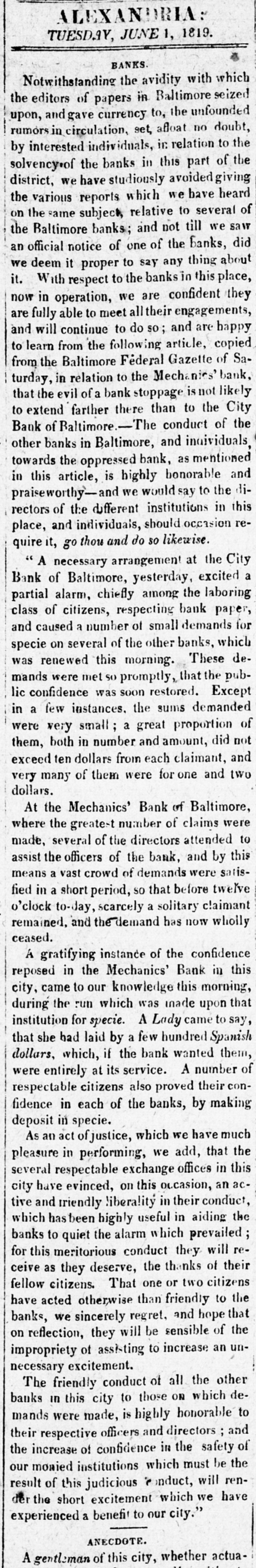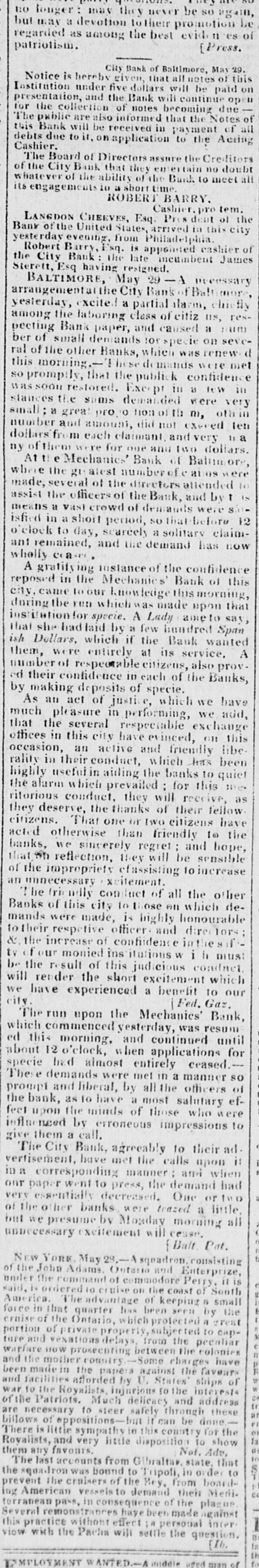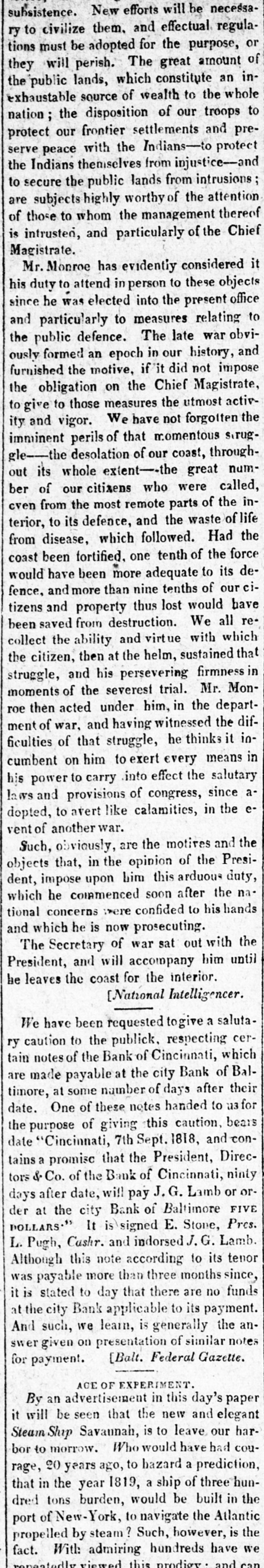 subsistence. New efforts will be necessary to civilize them. and effectual regulations must be adopted for the purpose, or they will perish. The great amount of the public lands, which constitute an inexhaustable source of wealth to the whole nation; the disposition of our troops to protect our frontier settlements and preserve peace with the Indians-to protect the Indians themselves from injustice-and to secure the public lands from intrusions ; are subjects highly worthy of the attention of those to whom the management thereof is intrusten, and particularly of the Chief Magistrate. Mr. Monroe has evidently considered it his duty to attend person to these objects since he was elected into the present office and particularly to measures relating to the public defence. The late war obviously formed an epoch in our history, and furnished the motive, if it did not impose the obligation on the Chief Magistrate, to give to those measures the utmost activity and vigor. We have not forgotten the imminent perils of that momentous struggle--the desolation of our coast, throughout its whole extent--the great number of our citizens who were called, even from the most remote parts of the interior, to its defence, and the waste of life from disease, which followed. Had the coast been fortified. one tenth of the force would have been more adequate to its defence, and more than nine tenths of our citizens and property thus lost would have been saved from destruction. We all recollect the ability and virtue with which the citizen, then at the helm, sustained that struggle, and his persevering firmness in moments of the severest trial. Mr. Monroe then acted under him, in the department of war, and having witnessed the difficulties of that struggle, he thinks it incumbent on him to exert every means in his power to carry into effect the salutary laws and provisions of congress, since adopted, to avert like calamities, in the event of another war. Such, obviously, are the motives and the objects that, in the opinion of the President, impose upon him this arduous duty, which he collmmenced soon after the na tional concerns were confided to his hands and which he is now prosecuting. The Secretary of war sat out with the President, and will accompany him until he leaves the coast for the interior. [National Intelligencer. We have been requested togive a salutary caution to the publick, respecting certain notes of the Bank of Cincinnati, which are made payable at the city Bank of Baltimore, at some number of days after their date. One of these notes handed to for the purpose of giving this caution, bears date "Cincinnati, 7th Sept. 1818, and contains a promisc that the President, Directors & Co. of the Bank of Cincinnati, ninty days after date, will pay J.G. Lamb or order at the city Bank of Baltimore FIVE DOLLARS." It is signed E. Stone, Pres. L. Pugh, Cashr. and indorsed Lamb. Although this note according to its tenor was payable more than three months since, it is stated to day that there are no funds at the city Bank applicable to its payment. And such, we learn, is generally the answer given on presentation of similar notes for payment. [Balt. Federal Gazette. ACE OF EXPERIMENT. By an advertisement in this day's paper it will be seen that the new and elegant Steam Ship Savaunah, is to leave our harbor to morrow. Who would have had courage, 20 years ago, to hazard a prediction, that in the year 1819, a ship of three hundred tons burden, would be built in the port of New-York, to navigate the Atlantic propelled by steam? Such, however, is the fact. With admiring hundreds have we repeatedly viewed this prodiov. and can
