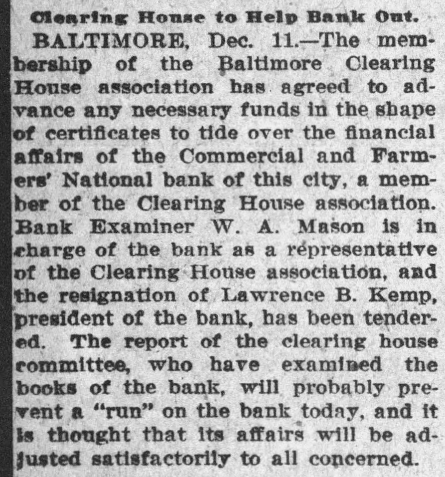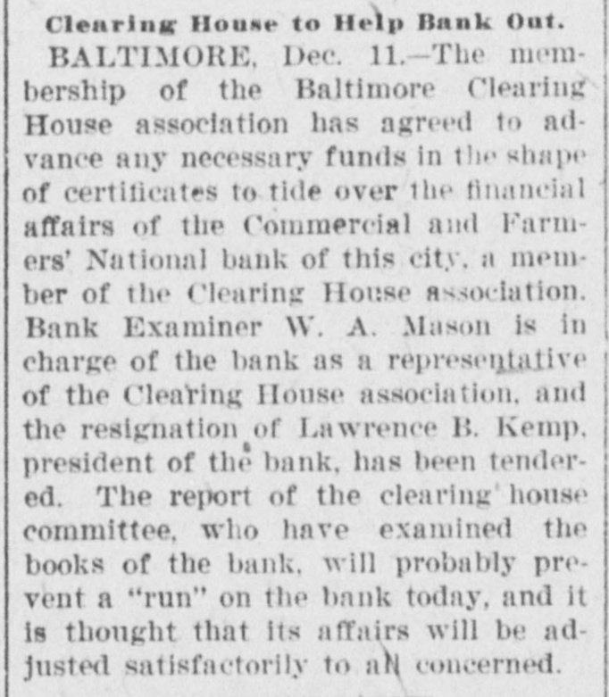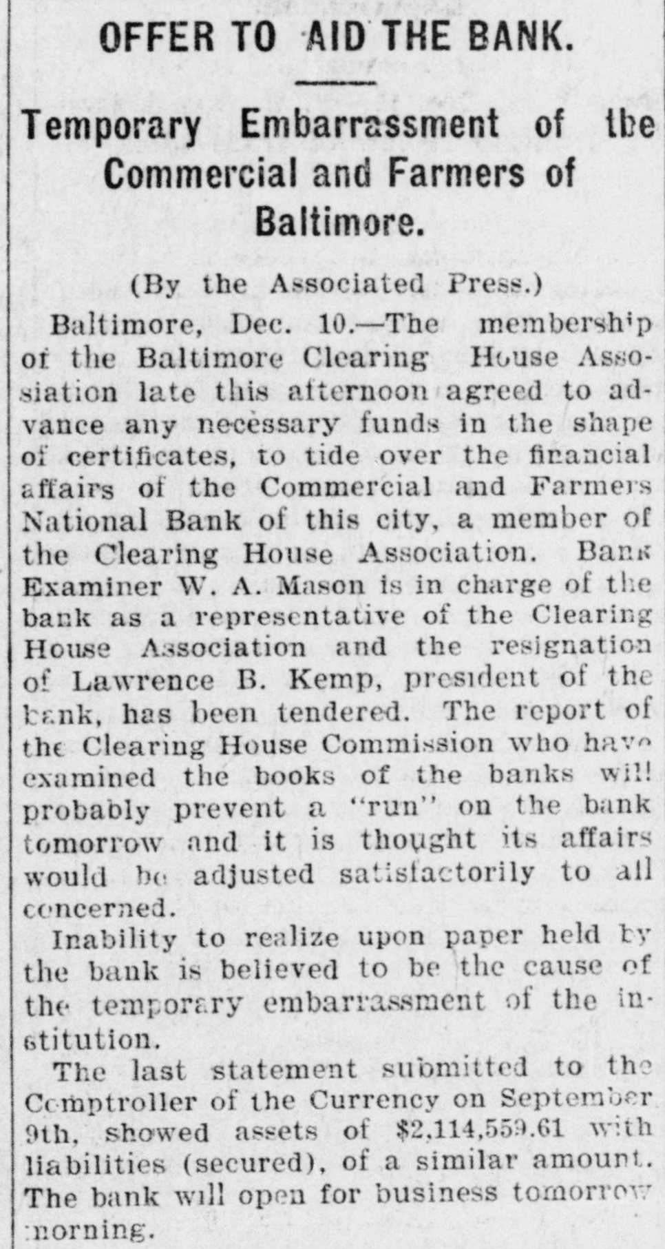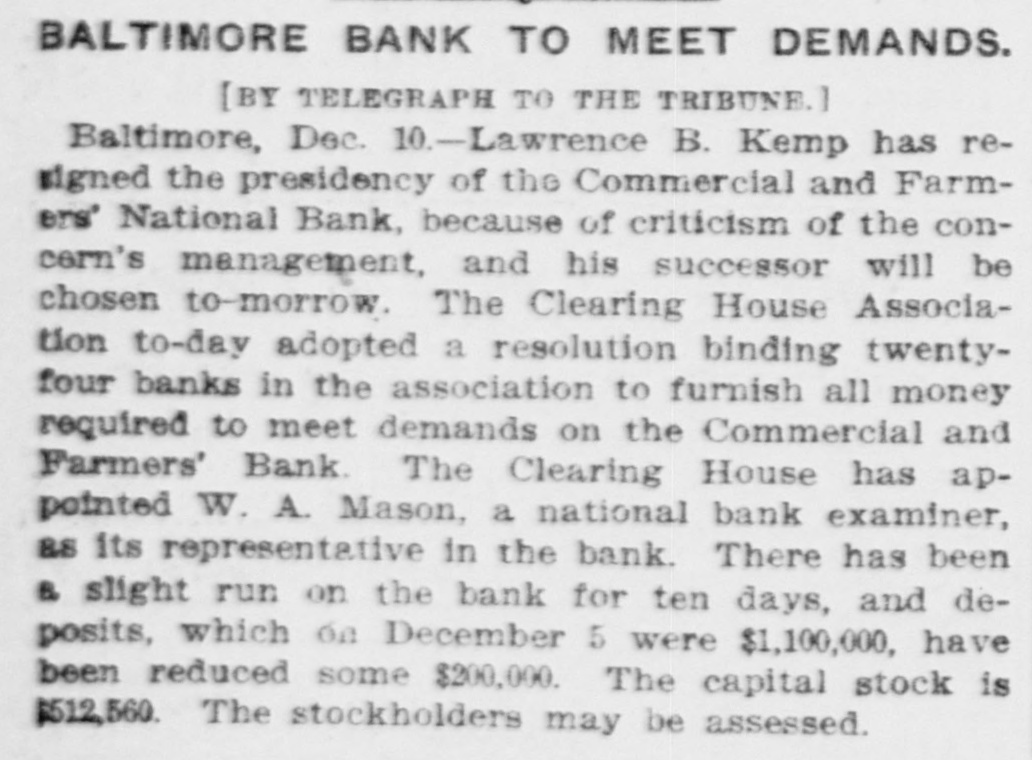 BALTIMORE BANK TO MEET DEMANDS. [BY TELEGRAPH TO THE TRIBUNE.] Baltimore, Dec. 10.-Lawrence B. Kemp has resigned the presidency of the Commercial and Farmers' National Bank, because of criticism of the concern's management, and his successor will be chosen to-morrow. The Clearing House Association to-day adopted a resolution binding twentyfour banks in the association to furnish all money required to meet demands on the Commercial and Farmers' Bank. The Clearing House has appointed W. A. Mason, a national bank examiner, as its representative in the bank. There has been & slight run on the bank for ten days, and deposits, which on December 5 were $1,100,000, have been reduced some $200,000. The capital stock is $512,560. The stockholders may be assessed.