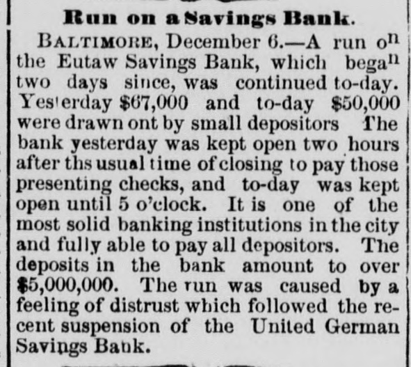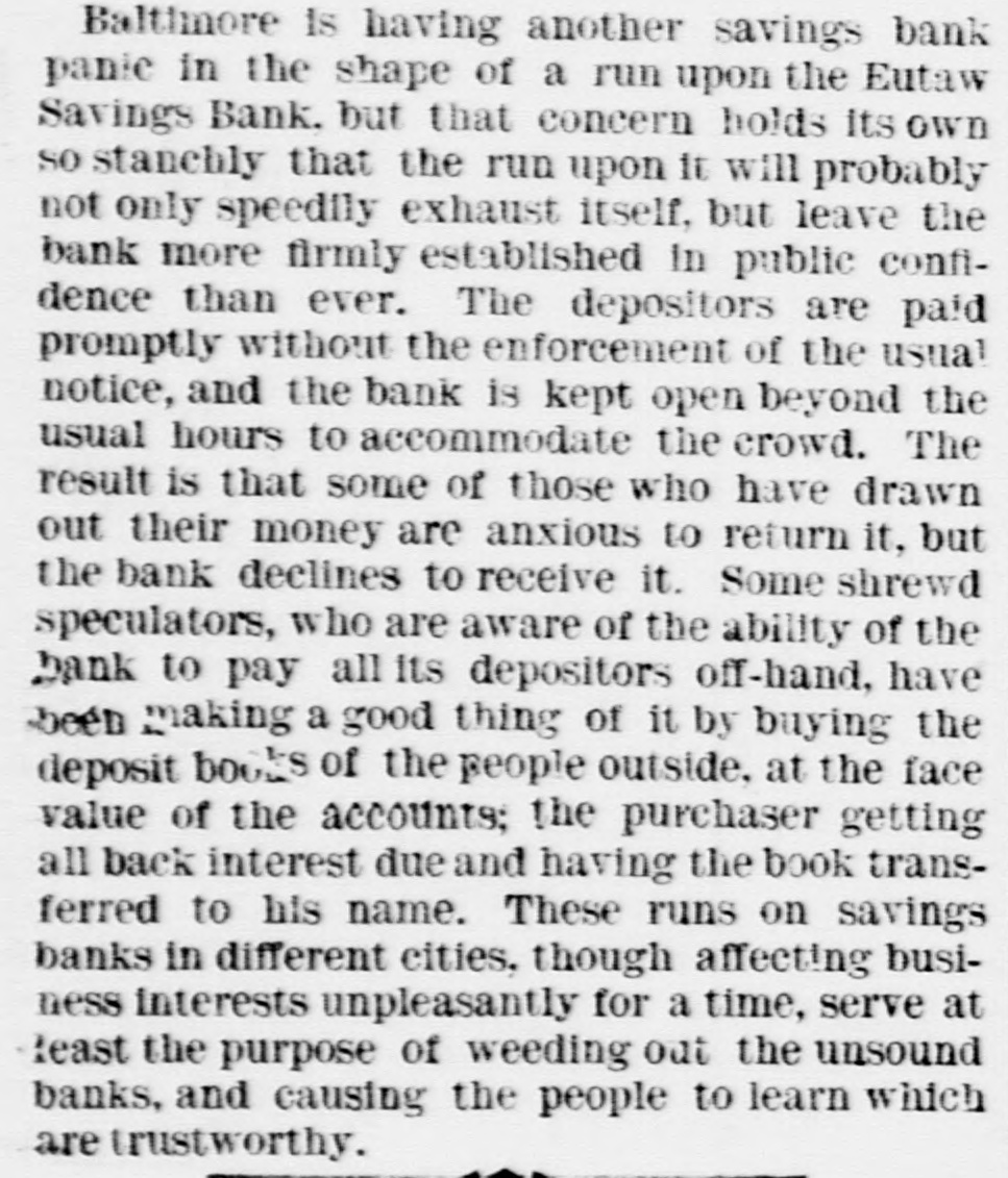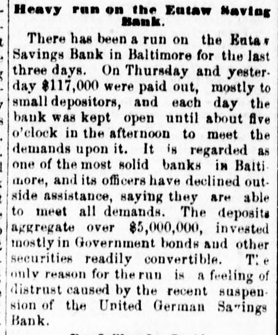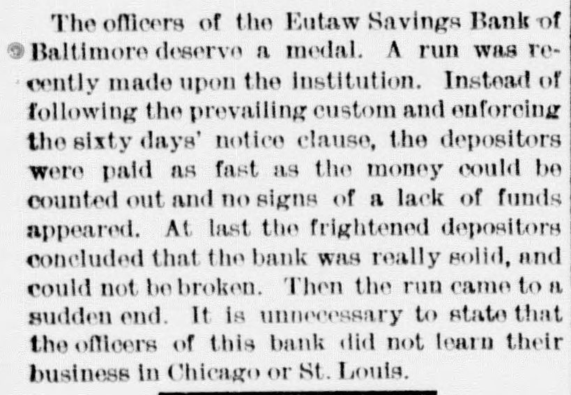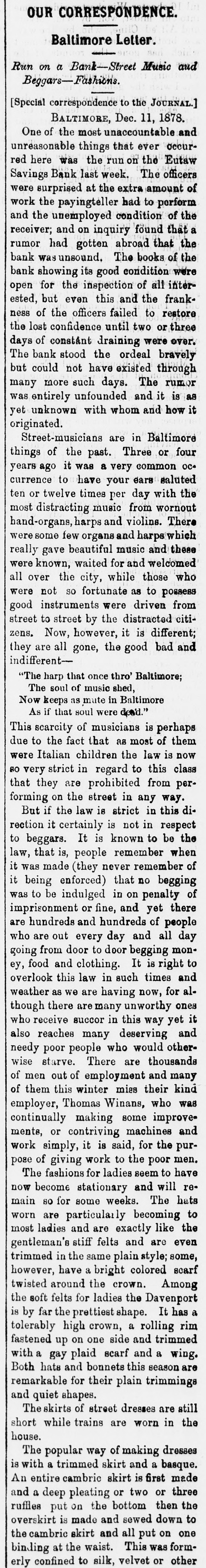 OUR CORRESPONDENCE. Baltimore Letter. Run on a Bank-Street Music and Beggars-Fashions. [Special correspondence to the JOURNAL.] BALTIMORE, Dec. 11, 1878. One of the most unaccountable and unreasonable things that ever occurred here was the run on the Eutaw Savings Bank last week. The officers were at extra of work surprised the payingteller the had to amount perform and the on a receiver; the unemployed and inquiry condition found that of rumor had gotten abroad that the bank was unsound. The books of the bank showing its good condition were open for the inspection of all interested, but even this and the frankness of the officers failed to restore the lost confidence until two or three days of constant draining were over. The bank stood the ordeal bravely but could not have existed through many more such days. The rumor was entirely unfounded and it is as yet unknown with whom and how it originated. Street-musicians are in Baltimore things of the past. Three or four was a common OC+ currence to ears years ago it have your very saluted ten or twelve times per day with the most distracting music from wornout weresome hand-organs, few beautiful harps organs and and music violins. harps which and There these really gave were known, waited for and welcomed all over the city, while those who were not so fortunate as to possess good instruments were driven from street to street by the distracted citizens. Now, however, it is different; they are all gone, the good bad and indifferent"The harp that once thro' Baltimore; The soul of music shed, Now keeps as mute in Baltimore As if that soul were don'd." This scarcity of musicians is perhaps due to the fact that as most of them were Italian children the law is now 80 very strict in regard to this class that are peron forming they the prohibited street in any from way. is direction it not respect But if the certainly law is strict in in this be to beggars. It is known to the law, that is, people remember when it was made (they never remember of it no was to on of being be enforced) indulged in that penalty begging imprisonment or fine, and yet there are hundreds and hundreds of people who are out every day and all day going from door to door begging money, food and clothing. It is right to overlook this law in such times and weather as we are having now, for although there are many unworthy ones who receive succor in this way yet it also needy reaches poor people many who deserving would other- and wise starve. There are thousands of men out of employment and many of them this winter miss their kind was some continually employer, Thomas making Winans, who improve= ments, or contriving machines and work simply, it is said, for the purpose of giving work to the poor men. The fashions for ladies seem to have now become stationary and will remain SO for some weeks. The hats worn are particularly becoming to most ladies and are exactly like the gentleman's stiff felts and are even trimmed in the same plain style; some, however, have a bright colored scarf twisted around the crown. Among the soft felts for ladies the Davenport is by far the prettiest shape. It has a tolerably high crown, a rolling rim on one with a a fastened gay up plaid scarf side and and trimmed wing. Both hats and bonnets this season are remarkable for their plain trimmings and quiet shapes. The skirts of street dresses are still short while trains are worn in the house. The popular way of making dresses is with a trimmed skirt and a basque. An entire cambric skirt is first made and a deep pleating or two or three ruffles put on the bottom then the overskirt is made and sewed down to the on one at was binding cambric the skirt waist. and all This put formerly confined to silk, velvet or other