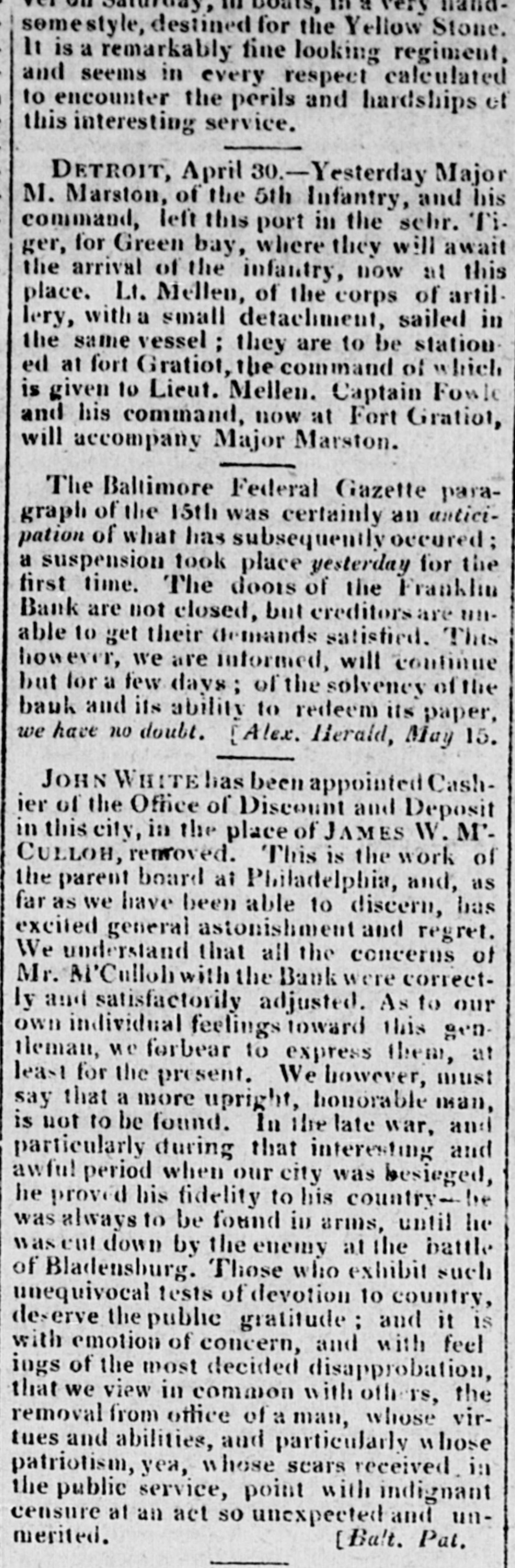 somestyle, destined for the Yellow Stone. It is a remarkably fine looking regiment, and seems in every respect calculated to encounter the perils and hardships of this interesting service. DETROIT, April 30.-Yesterday Major M. Marston, of the 5th Infantry, and his command, left this port in the schr. Tiger, for Green bay, where they will await the arrival of the infantry, now at this place. Lt. Mellen, of the corps of artil lery, with a small detachment, sailed in the same vessel; they are to be station ed at fort Gratiot, the command of which is given to Lieut. Mellen. Captain Fowle and his command, now at Fort Gratioi, will accompany Major Marston. The Baltimore Federal Gazette paragraph of the 15th was certainly an anticipation of what has subsequently occured; a suspension took place yesterday for the first time. The doors of the Franklin Bank are not closed, but creditors are IIIIable to get their demands satisfied. This however, we are informed, will continue but for a few days; of the solvency of the bauk and its ability to redeem its paper, we have no doubt. Alex. Herald, May 15. JOHN WHITE has been appointed Cashier of the Office of Discount and Deposit in this city, in the place of JAMES W. M'CULLOH, removed. This is the work of the parent board ai Philadelphia, and, as far as we have been able to discern, has excited general astonishment and regret. We understand that all the concerns of Mr. M'Culloh with the Bank were correctly and satisfactorily adjusted. As to our own individual feelings toward this gentleman, we forbear to express them, at least for the present. We however, must say that a more upright, honorable man, is not to be found. In the late war, and particularly during that interesting and lawful period when our city was besieged, he proved his fidelity to his country-lie was always to be found in arms, until he was cut down by the enemy at the battle of Bladensburg. Those who exhibit such unequivocal tests of devotion 10 country, deserve the public gratitude ; and it is with emotion of concern, and with feel ings of the most decided disapprobation, that we view in common with others, the removal from office of a man, whose virtues and abilities, and particularly whose patriotism, yea, whose scars received in the public service, point with indignant censure at an act so unexpected and unmerited. [Balt. Pat.