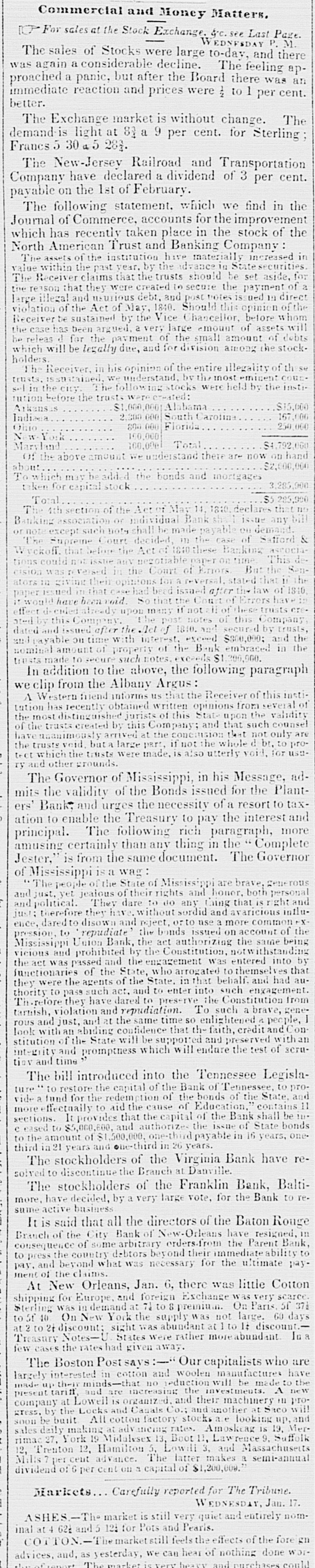 Stock Exchange Ec. Last Page. The sales of Stocks were large WEDNESDAY to-day, and P. M. was again a considerable decline. The feeling there proached a panic, but after the Board there apbetter. immediate reaction and prices were 1/2 to 1 per was cent. an The Exchange market is without change. The demand is light at 83 a 9 per cent. for Sterling Francs 30 a 5 283. The New-Jersey Railroad and Transportation Company have declared a dividend of 3 per cent. payable on the 1st of February. The following statement. which we find in the Journal of Commerce, accounts for the improvement which has recently taken place in the stock of the North American Trust and Banking Company: The assets of the institution have materially increased value within the past year. by the advance 10 State securities in The Receiver claims that the trusts should be set aside. for the reason that they were created in secure the payment of large illegal and usurious debt. and post notes is ued 19 direct a violation of the Act of May, 1840. Should this opinion of the Receiver be sustained by the Vice Chaecellor, before whom the case has been argued. a very large amount of assets will he releas d for the payment of the small amount of debts holders which will be legally due, and for division among the stock. The Receiver, in his opinion of the entire illegality of th trusts, sustained, We understand by the most eminent COUR se sel the city. Thefollowingstocks were held by the insti. aution before the trusts $15,000 Arkansas $1,000,000,Albama 167,000 2,300,000 Indiaga South Carolina 250,000 Florida 800 000 Ohio 100,000 New York Total $4,792,000 100.000 Maryland now of the above amount we understand there are on hand about $2,000,000 which may be added the bonds and mortgages 3,285,900 taken for capital stock Total $5 285,990 The 1th section of the Act Mar 14. 1810. declare that TID Banking association or individual Bank shall issue any bill or note exceptisach note shall be made payable on demand. & The Supreme Court decided. 11) the case of Safford Wvckoff. that before the Act of 1810 these Banking ASPOCE tions could not issue anv negotiable paper on time This Sencision was reversed in the Court of Errors But the ators in giving their opinions for reversal. stated that 11 the issued in that case had bead issued after the of 1840 itwould have been void other the Court of Errors effect already upon many if not ii of these trusts and by this Company. The post notes of this Company dated and issued after Act of 1810. and secured by trusts, and payable on time with interest. exceed $800,000; and the nominal amount of property of the Bank embraced in the trusts made to secure such notes exceeds $1,200,000. In addition to the above, the following paragraph we clip from the Albany Argus: A Western friend informs us that the Receiver of this institution has recently obtained written opinions from several of the most distinguished jurists of this State upon the validity of the trusts created by this Company; and that such counsel havennanimously arrived at the concession that only are the trusts void. but a large part, if not the whole di bt. to protect which the trusts were made. is also utterly void, for usery and other grounds. The Governor of Mississippi, in his Message, admits the validity of the Bonds issued for the Planters Bank, and urges the necessity of a resort to tax ation to enable the Treasury to pay the interest and principal. The following rich paragraph, more amusing certainly than any thing in the Complete Jester," is from the same document. The Governor of Mississippi is a wag: The people of the State of Mississippi are brave. generous and just, yet jealous of their rights and houer, both personal and Ipolitical. They dare to do any thing that is right and just; therefore they have. without sordid and avaricious intluence, dared disown and reject, or to use a more commonex pression, to repudiate the bonds issued on account of the Mississippi Union Bank, the act authorizing the same being vicious and prohibited by the Constitution, not twithstanding the act was passed and the engagement Was entered into by Junctionaries of the State, who arrogated to themselves that they were the agents of the State. in that behalf. and had authority to pass such act, and to enter into such engagement. Therefore they have dared to preserve the Constitution from tarnish, violation and repudiation. To such a brave, generous and just, and at the same time so enlightened a people, I look withan abiding confidence that the faith, crédit and Constitution of the State will be supported and preserved within integrity and promptness which will endure the test of scrutiov and time The bill introduced into the Tennessee Legislature to restore the capital of the Bank of Tennessee, to provide a fund for the redemption of the bonds of the State, and pre effectually to aid the cause of Education, " contains 11 sections. It provides that the capital of the Bank shall be !!!" creased to $5,000,600, and authorizes the issue of State bonds the amount of $1,500,000. one-third payable in 16 years, one. third in 21 years and one-third in 26 years. The stockholders of the Virginia Bank have resolved to discontinue the Brauch at Danville The stockholders of the Franklin Bank, Baltimore, have decided. by a very large vote, for the Bank to re. same active business It is said that all the directors of the Baton Rouge Branch the City Bank of New-Orleans have resigned, in consequence of some arbitrary orders/from the Parent Bank. to press the country debtors beyond their immediateabili to pay, and beyond what was necessary for the ultimate payment of the claims. At New Orleans, Jan. 6, there was little Cotton shipping for Europe, and foreign Exchange was very scarce Sterling was rdemand at to 8 premium. On Paris of 371 to 5f 10 On New York the supply was not large. 60 days discount sight was abundant at 1 to l: discount.a Treasury Notes- States were rather m