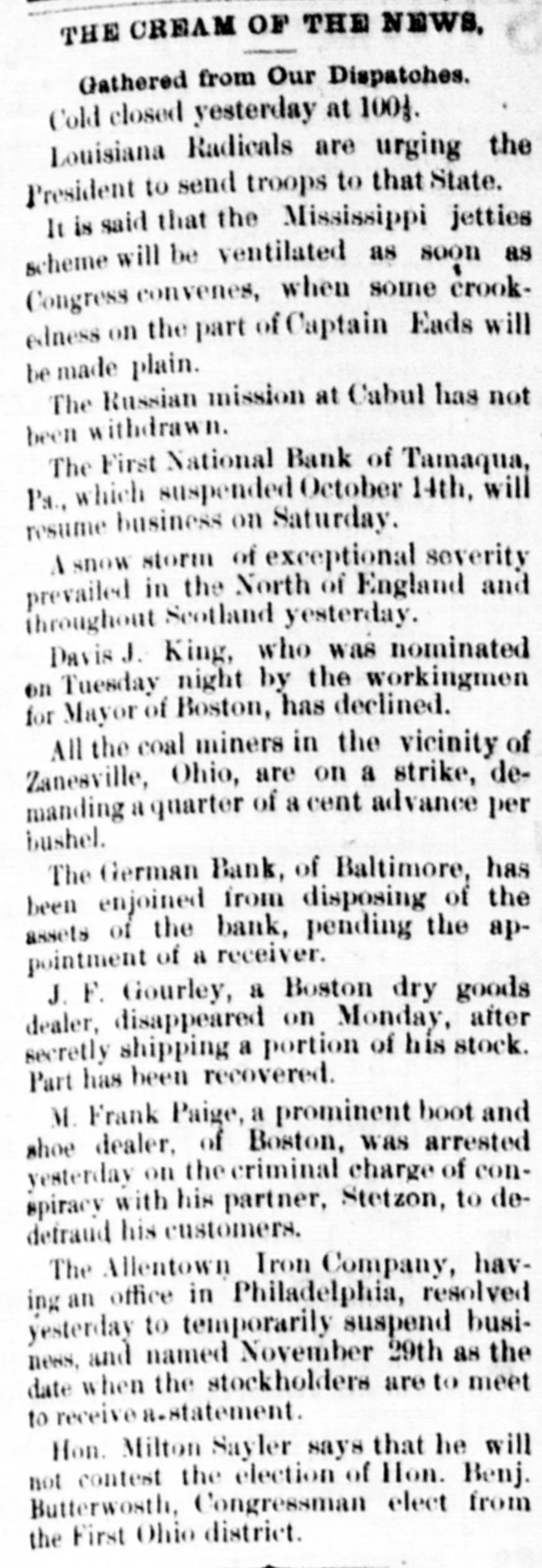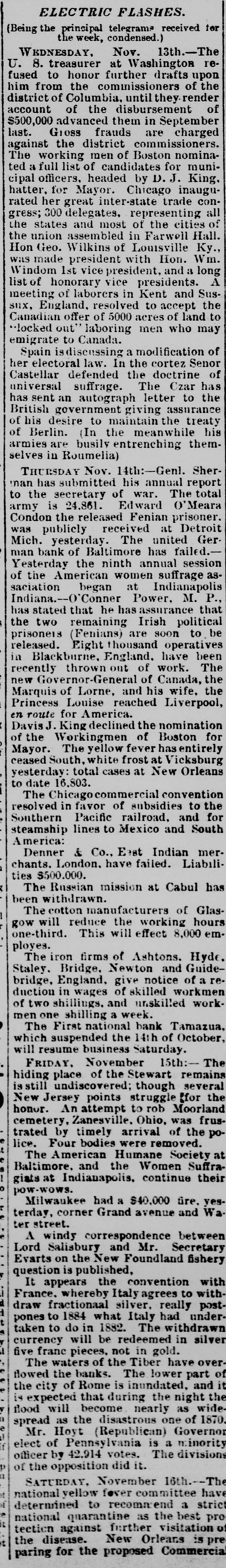 ELECTRIC FLASHES. received (Being the principal week, condensed.) telegram WEDNESDAY. the Nov. Washington 13th.-The re8. treasurer further at drafts upon the U. fused to honor commissioners render of him from Columbia, the until they.re of district of the disbursement September account advanced of them in are charged $500,000 last. Gross the district frauds commissioners. nominaagainst working men candidates of Boston for munited The a full list of by 1. J. King. officers. headed Chicago inaugucipal for Mayor. inter-state trade congress; hatter. rated her 300 great delegates. most representing of the cities all of assembled in the Wilkins of Hon. the Hon union states and Louisville Farwell Hall. Wm. Ky., long Geo. president with and a was made 1st vice president, presidents. A Windom of honorary vice in Kent and of laborers to accept out' sux, meeting list England. resolved 5000 acres of land Sus- the to offer of who may Canadian ..locked laboring men of emigrate to Canada. a modification Senor Spain electoral isdiscussing law. In the cortez doctrine of the Castellar her defended the The Czar has giving universal an suffrage. autograph letter assurance to has sent British government maintain the treaty desire to meanwhile Berlin. busily entrenching selves in Roumelia) of of armies his are (In the them- his SherTHURSDAY Nov. 14th:-Genl. his annual report has submitted war. The total 24.861. to nan the secretary of Edward prisoner. O'Meara army Condon is the released received Fenian at Detroit Gerunited was Mich. publicly yesterday. Baltimore The has failed.man bank of ninth annual session asYesterday the women suffrage at of saciation the American began Power, Indianapolis M. P., o Conner assurance that the has Indiana.- stated two that remaining he has are Irish soon political to be prisoneis Eight (Fenians) thousand have operatives been released. Blackburne. England. of work. The thrown out of Canada, his of reached recently new in Marquis Governor Louise Lorne, General and Liverpool, wife, the the Princess DavisJ. route King for America. declined of the nomination Boston for of the Workingmen The yellow frost fever at has entirely Vicksburg yesterday: ceased Mayor. South, total white cases at New Orleans date 16.803. convention to The Chicagoco commercial of subsidies to the for resolved in favor railroad, and South Southern steamship lines Pacific to Mexico and merIndian chants. America: Denner London. & Co., have East failed. LiabiliThe Raggian ties $500.000. mission at Cabul has Glasbeen The withdrawn. cotton manufacturers the working of hours emone-third. gow will reduce This will effect 8,000 ployes. firms of Ashtons. and Guide- Hyde. Bridge, notice of a Staley. The iron England, Newton give rein wages unskilled two shillings. ) duction bridge, of and of week. skilled Tamazua, workmen workmenone shilling a bank The First national the 14th of October The which resume suspended business Saturday. 15th:FRIDAY, the will place November of Stewart though remains several hiding undiscovered; struggle for the is still Jersey points to rob Moorland honor. New An attempt Ohio. was the frus- potimely arrival cemetery, trated by Zanesville, were removed. of at lice. Four bodies Humane Society The American and the Women Suffra- their giats at Baltimore. Indianapolis. continue DOW-WOWS. had a $40,000 fire. and Wa yesterday, Milwaukee corner Grand avenue A winds and Mr. ter street. correspondence Secretary between on the New Foundland v Lord Evarts Salisbury fishery with question is published.com the withIt appears whereby Italy agrees to postFrance. silver. really draw pones to fractionaal 1884 what 1832. Italy The had withdrawn under- silver taken to do will in be redeemed gold. in currency five franc pieces. the not Tiber in have over- of flowed The waters of The lower part it the city the of banks. Rome that during is inundated. the night as and wide- the is expected become nearly of 1870. flood will the disastrous one Governor spread Hoyt as (Republican) minority by 42.914 it. elect Mr. of Pennsylvania votes. is The a divisions officer opposition did of SATURDAY. the November fever committee 16th.--The strict have national yellow a to as the determined quarantine recommend visitation best pro of national further is pre tection against New Orlears Commercial paring the disease. for the proposed