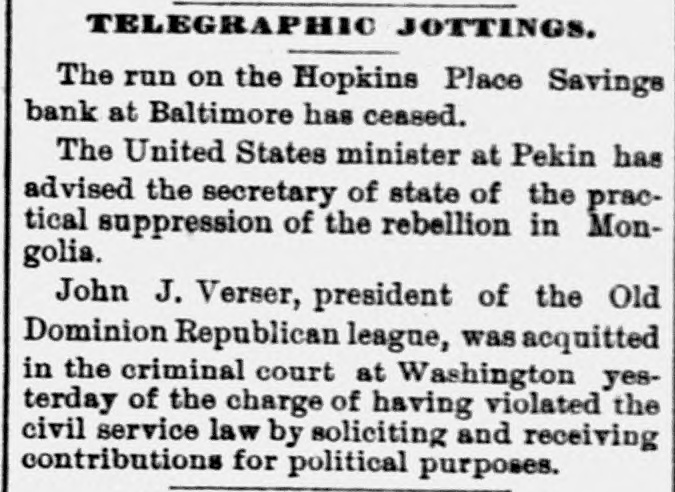 AFFAIRS OF CONSEQUENCE. FOREIGN. Rev. Mr. Spurgeon is still critically ill. Dr. Alfred Carpenter, the well known English physician, is dead. He was the author of many medical works. The French government will ask the general assembly a credit of $700,000 to enable France to participate in the Chicago Columbian exposition. The United States minister to France, Hon. Whitelaw Reid, denies that negotiations were being carried on in Paris for reduction in the United States duties on French silks and wines in return for reciprocal advantages in the French duties. HOME. Virginia owns 1,500,000 acres of oyster lands. There are over a thousand cases of grip at Aurora, Ill. A two days' run was made on the Hop kins Place Savings bank, in Baltimore, but the bank stoodit. Solomon Hanks, a cousin of Abraham Lincoln, died at his home, 15 miles east of Wapakonetta, O., at the age of 92 years. The Ohio house of represeutatives has appointed a committee to investigate the allegations of bribery in the sena. torial contest in that state. Senator Sherman has written a letter. All of the 400 employes of Brooke Iron company, at Birdsboro, Pa., continued working at the recent reduction in their wages of about 10 per cent. except thenail feeders, who struck. A suit was filed for $185,500 against the executors of the estate of the late Senator Plumb. of Kansas. It is claimed that Senator Plumb subscribed $115,000 to the capital stock of a railroad scheme in Virginia which he never paid.