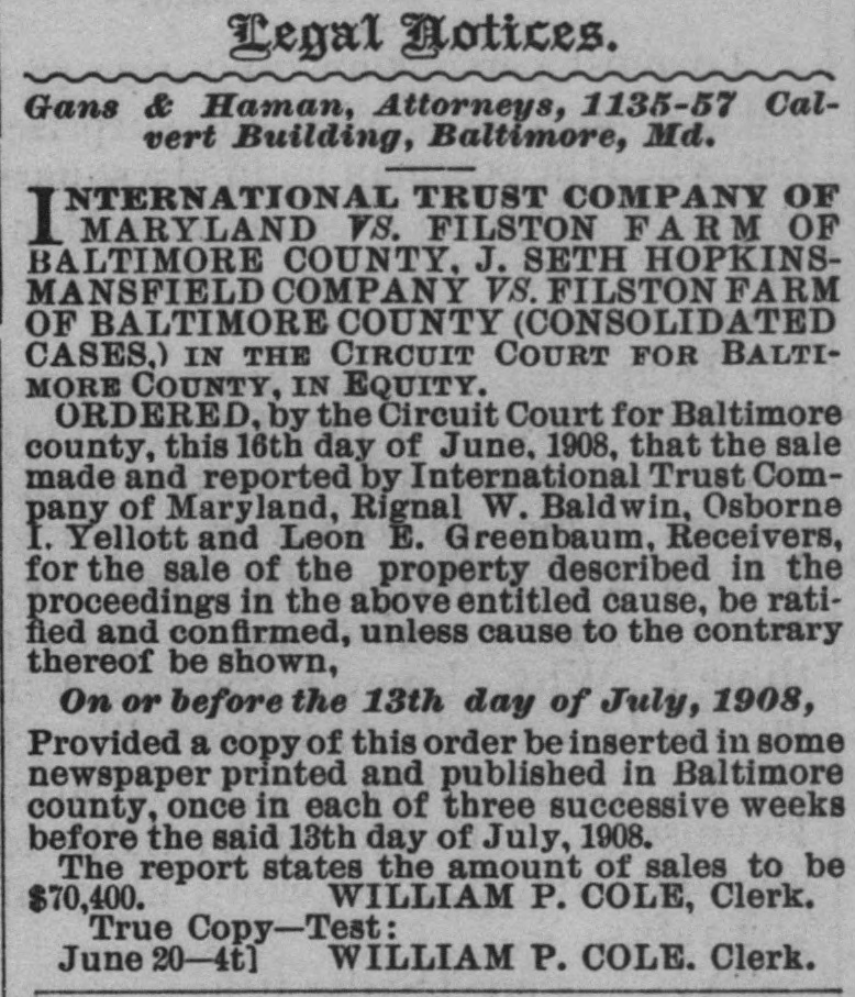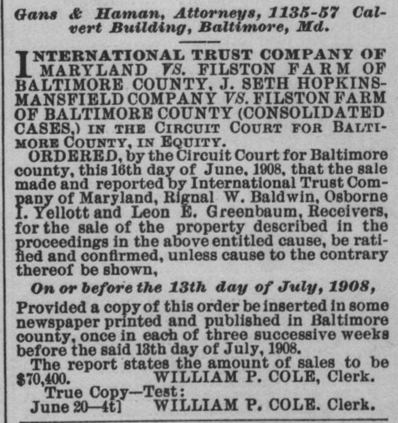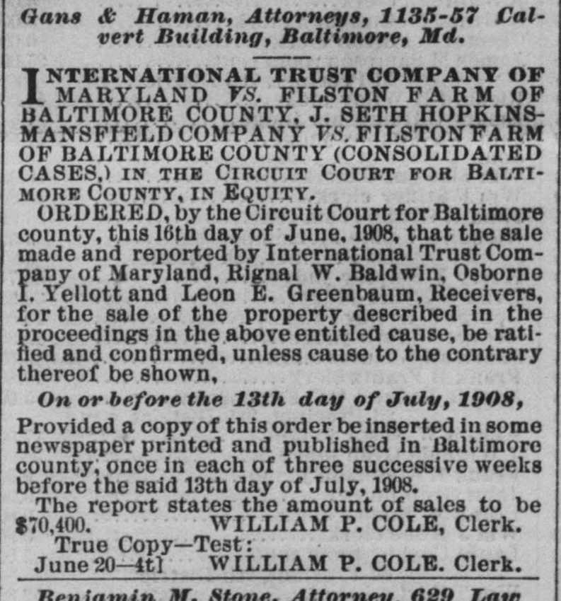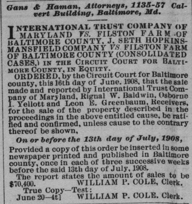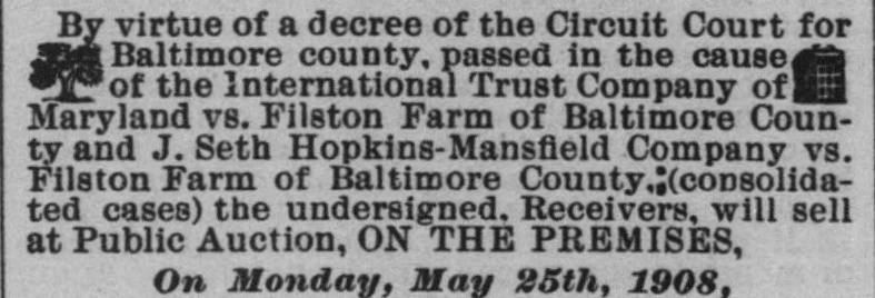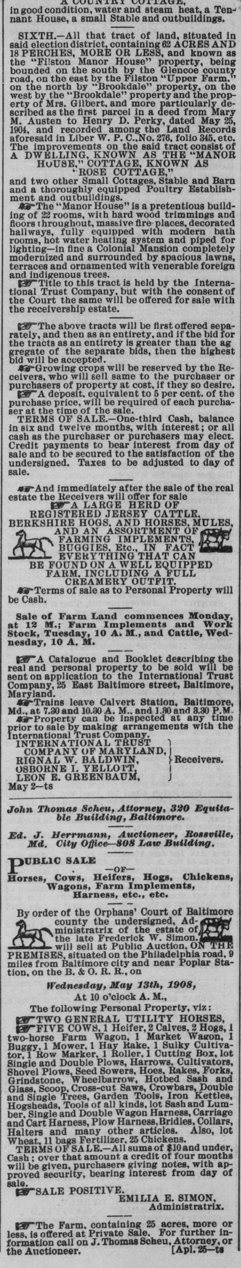 in good condition, water and steam heat, a Tennant House, a small Stable and outbuildings. SIXTH.-All that tract of land, situated in said election district, containing 62 ACRES AND 18 PERCHES, MORE OR LESS, and known as the "Filston Manor House" property, being bounded on the south by the Glencoe county road, on the east by the Filston "Upper Farm. on the north by "Brookdale" property, on the west by the "Brookdale" property and the property of Mrs. Gilbert, and more particularly described as the first parcel in a deed from Mary M. Austen to Henry D. Perky, dated May 25, 1904, and recorded among the Land Records aforesaid in Liber W. P. No. 276, folio 345, etc. The improvements on the said tract consist of A DWELLING, KNOWN AS THE "MANOR HOUSE,' COTTAGE, KNOWN AS ROSE COTTAGE," and two other Small Cottages, Stable and Barn and a thoroughly equipped Poultry Establishment and outbuildings. The "Manor House" is a pretentious building of 22 rooms, with hard wood trimmings and floors throughout, massive fire places, decorated hallways, fully equipped with modern bath rooms, hot water heating system and piped for lighting-in fine a Colonial Mansion completely modernized and surrounded by spacious lawns, terraces and ornamented with venerable foreign and indigenous trees. Title to this tract is held by the International Trust Company, but with the consent of the Court the same will be offered for sale with the receivership estate. The above tracts will be first offered separately, and then as an entirety, and if the bid for the tracts as an entirety is greater than the ag gregate of the separate bids, then the highest bid will be accepted. Growing crops will be reserved by the Receivers, who will sell same to the purchaser or purchasers of property at cost, if they so desire. A deposit. equivalent to 5 per cent. of the purchase price, will be required of each purchaser at the time of the sale. TERMS OF ALE-One-third Cash, balance in six and twelve months, with interest; or all cash as the purchaser or purchasers may elect. Credit payments to bear interest from day of sale and to be secured to the satisfaction of the undersigned. Taxes to be adjusted to day of sale. And immediately after the sale of the real estate the Receivers will offer for sale A LARGE HERD OF REGISTERED JERSEY CATTLE. BERKSHIRE HOGS. AND HORSES, MULES, AND AN ASSORTMENT OF FARMING IMPLEMENTS, BUGGIES, Etc., IN FACT AM EVERYTHING THAT CAN BE FOUND ON A WELL EQUIPPED FARM. INCLUDING A FULL CREAMERY OUTFIT. Terms of sale as to Personal Property will be Cash. Sale of Farm Land commences Monday, at 12 M.; Farm Implements and Work Stock, Tuesday, 10 A. M., and Cattle, Wednesday, 10 A. M. A Catalogue and Booklet describing the real and personal property to be sold will be sent on application to the International Trust Company, 25 East Baltimore street, Baltimore, Maryland. Trains leave Calvert Station, Baltimore, Md., at 7.30 and 10.30 A. M., and 1 .80 and 8.30 P.M. so Property can be inspected at any time prior to sale by making arrangements with the International Trust Company. INTERNATIONA TRUST COMPANY OF MARYLAND, Receivers. RIGNAL W. ALDWIN, OSBORNE I. YELLOTT, LEON E. GREENBAUM, May 2-ts John Thomas Scheu, Attorney, 320 Equitable Building, Baltimore. Ed. J. Herrmann, Auctioneer, Rossville, Md. City Office-808 Law Building. -OFPUBLIC SALE Horses, Cows, Heifers, Hogs, Chickens, Wagons, Farm Implements, Harness, etc., etc. By order of the Orphans' Court of Baltimore county the undersigned, Administratrix of the estate of the late Frederick W. Simon. will sell at Public Auction. ON THE PREMISES, situated on the Philadelphia road, 9 miles from Baltimore city and near Poplar Station, on the B. & O. R. R., on Wednesday, May 13th, 1908, At 10 o'clock A. M., The following Personal Property, viz: TWO GENERAL UTILITY HORSES, FIVE COWS. Heifer, 2 Calves, 2 Hogs, 1 1 two-horse Farm Wagon, 1 Market Wagon, Buggy, 1 Mower, 1 Hay Rake, 1 Sulky Cultivator, Row Marker, 1 Roller, 1 Cutting Box, lot Single and Double Plows, Harrows. Cultivators, Shovel Plows, Seed Sowers, Hoes, Rakes, Forks, Grindstone, Wheelbarrow, Hotbed Sash and Glass, Scoop, Cross-cut Saws, Crowbars, Double and Single Trees, Garden Tools, Iron Kettles, Hogsheads, Tools of all kinds, lot Sash and Lumber, Single and Double Wagon Harness, Carriage and Cart Harness, Plow Harness, Bridles, Collars, Halters and many other articles. Also, lot Wheat. 11 bags Fertilizer, 25 Chickens. TERMS OF SA LE.-All sums of $10and under, Cash over that amount a credit of four months will be given, purchasers giving notes, with approved security, bearing interest from day of sale. SALE POSITIVE. EMILIA E. SIMON, Administratrix. The Farm. containing 25 acres, more or less, is offered at Private Sale. For further information call on J. Thomas Scheu, Attorney, or [Apl. 25-ts the Auctioneer.