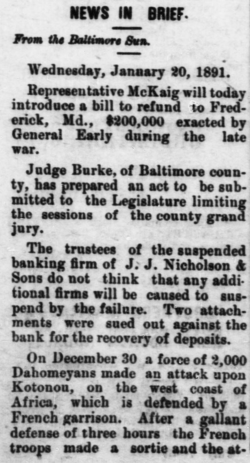 # NEWS IN BRIEF. From the Baltimore Sun. Wednesday, January 20, 1891. Representative McKaig will today introduce a bill to refund to Frederick, Md., $200,000 exacted by General Early during the late war. Judge Burke, of Baltimore county, has prepared an act to be submitted to the Legislature limiting the sessions of the county grand jury. The trustees of the suspended banking firm of J. J. Nicholson & Sons do not think that any additional firms will be caused to suspend by the failure. Two attachments were sued out against the bank for the recovery of deposits. On December 30 a force of 2,000 Dahomeyans made an attack upon Kotonou, on the west coast of Africa, which is defended by a French garrison. After a gallant defense of three hours the French troops made a sortie and the at-