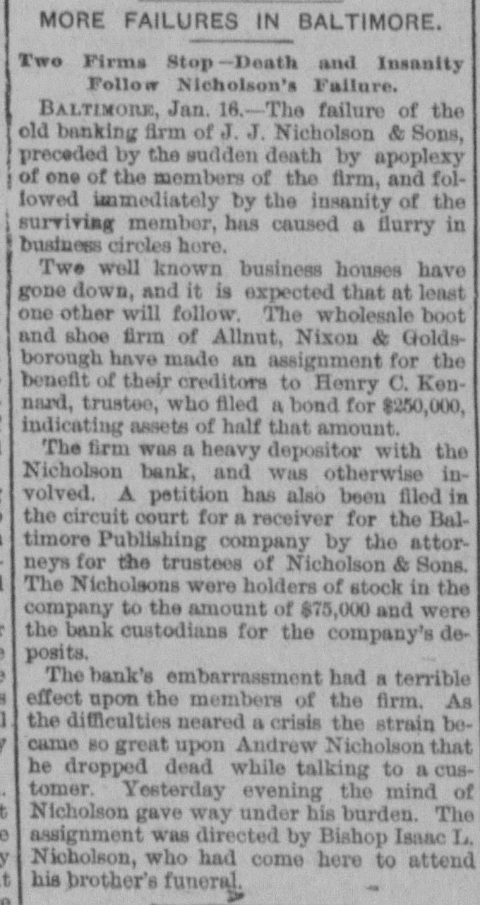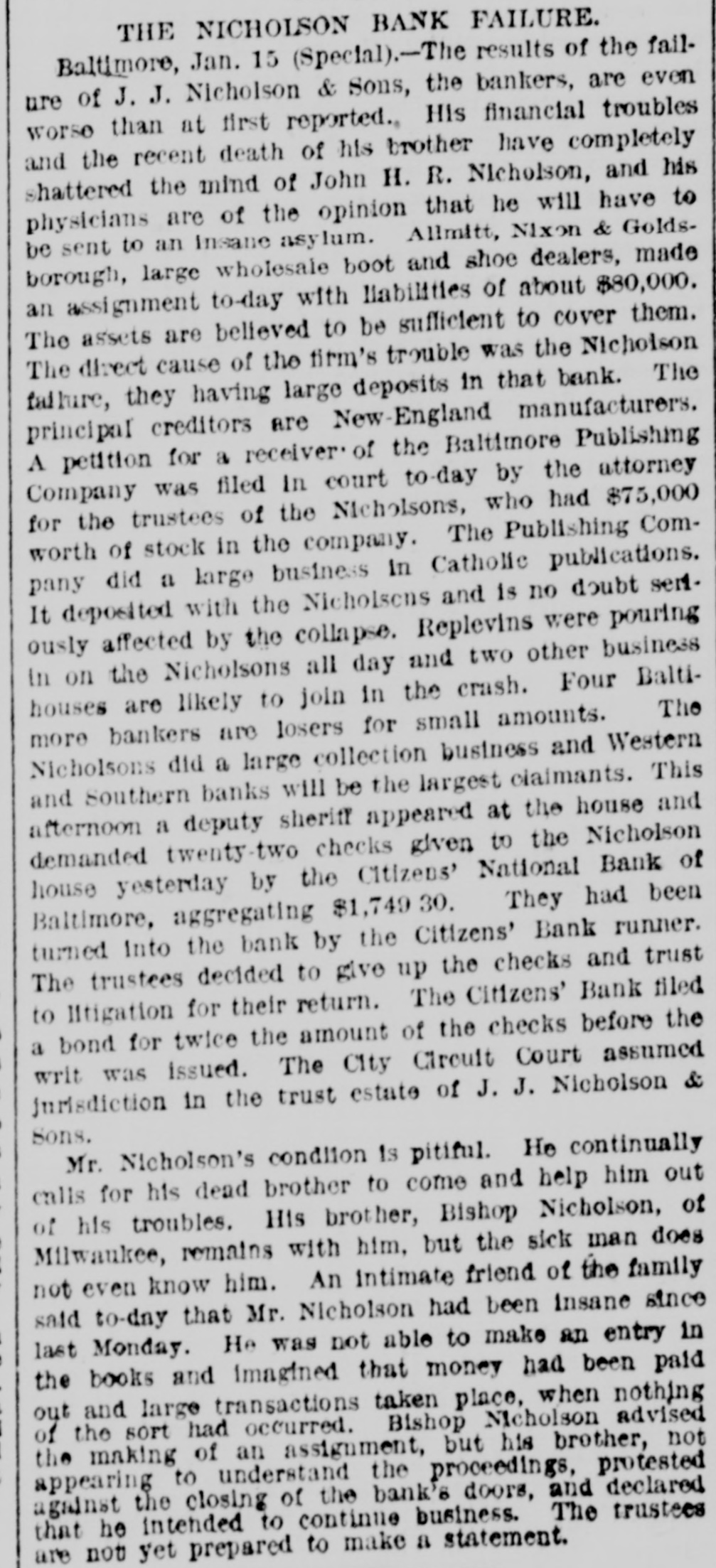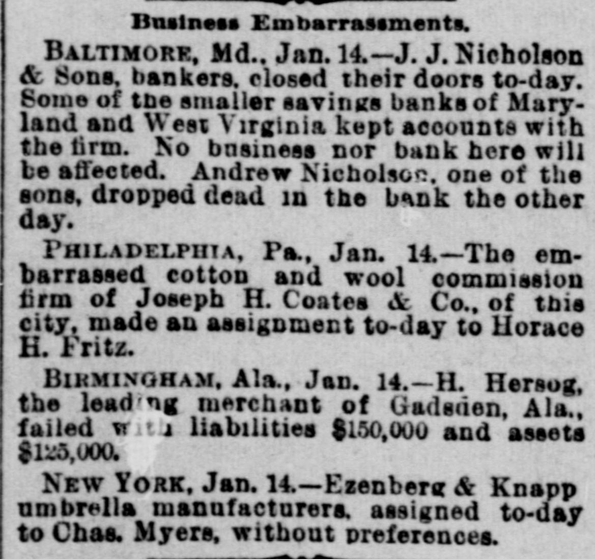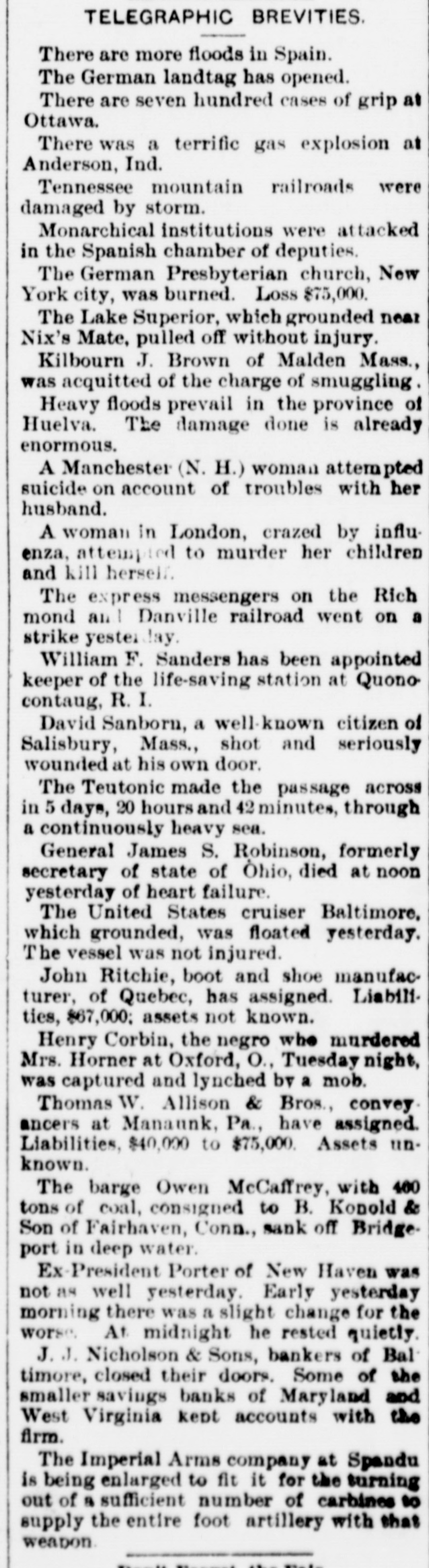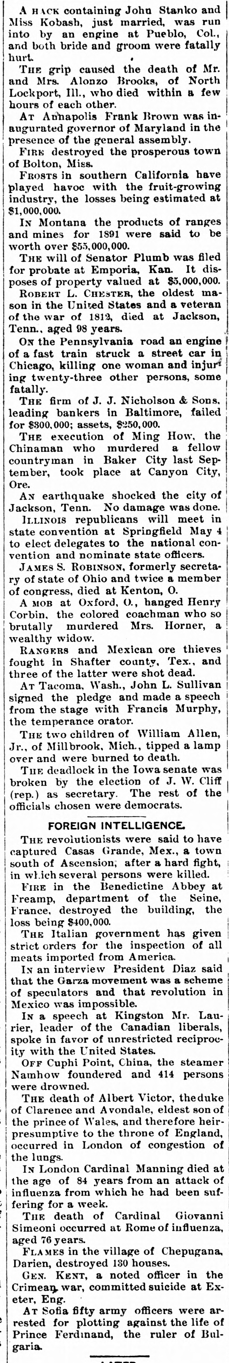 A HACK containing John Stanko and Miss Kobash, just married, was run into by an engine at Pueblo, Col., and both bride and groom were fatally hurt. THE grip caused the death of Mr. and Mrs. Alonzo Brooks, of North Lockport, Ill., who died within a few hours of each other. AT Aunapolis Frank Brown was inthe presence augurated of governor the general of Maryland assembly. in FIRE destroyed the prosperous town of Bolton, Miss. FROSTS in southern California have played havoc with the fruit-growing industry, the losses being estimated at $1,000,000. IN Montana the products of ranges and mines for 1891 were said to be worth over $55,000,000. THE will of Senator Plumb was filed for at of poses probate property Emporia, valued at Kan. $5,000,000. It disROBERT L. CHESTER, the oldest mason in the United States and a veteran of the war of 1812, died at Jackson, Tenn., aged 98 years. ON the Pennsylvania road an engine of a fast train struck a street car in Chicago, killing one woman and injur? ing twenty-three other persons, some fatally. THE firm of J. J. Nicholson & Sons. leading bankers in Baltimore, failed for $300,000; assets, $250,000. THE execution of Ming How, the Chinaman who murdered a fellow countryman in Baker City last September, took place at Canyon City, Ore. AN earthquake shocked the city of Jackson, Tenn. No damage was done. ILLINOIS republicans will meet in state convention at Springfield May 4 to elect delegates to the national convention and nominate state officers. JAMES S. ROBINSON, formerly secretary of state of Ohio and twice a member of congress, died at Kenton, O. A MOB at Oxford, O., hanged Henry Corbin. the colored coachman who so brutally murdered Mrs. Horner, a wealthy widow. RANGERS and Mexican ore thieves fought in Shafter county, Tex., and three of the latter were shot dead. AT Tacoma, Wash., John L. Sullivan signed the pledge and made a speech from the stage with Francis Murphy, the temperance orator. THE two children of William Allen, Jr., of Millbrook, Mich., tipped a lamp over and were burned to death. THE deadlock in the Iowa senate was broken by the election of J. W. Cliff (rep.) as secretary. The rest of the officials chosen were democrats. FOREIGN INTELLIGENCE. THE revolutionists were said to have captured Casas Grande, Mex., a town south of Ascension, after a hard fight, in which several persons were killed. FIRE in the Benedictine Abbey at Freamp, department of the Seine, France, destroyed the building, the loss being $400,000. THE Italian government has given strict orders for the inspection of all meats imported from America. IN an interview President Diaz said that the Garza movement was a scheme of speculators and that revolution in Mexico was impossible. IN a speech at Kingston Mr. Laurier, leader of the Canadian liberals, spoke in favor of unrestricted reciprocity with the United States. OFF Cuphi Point, China, the steamer Namhow foundered and 414 persons were drowned. THE death of Albert Victor, theduke of Clarence and Avondale, eldest son of the prince of Wales, and therefore heirpresumptive to the throne of England, occurred in London of congestion of the lungs. IN London Cardinal Manning died at the age of 84 years from an attack of influenza from which he had been suffering for a week. THE death of Cardinal Giovanni Simeoni occurred at Rome of influenza, aged 76 years. FLAMES in the village of Chepugana. Darien, destroyed 130 houses. GEN. KENT, a noted officer in the Crimean war, committed suicide at Exeter, Eng. AT Sofia fifty army officers were arrested for plotting against the life of Prince Ferdinand, the ruler of Bulgaria.