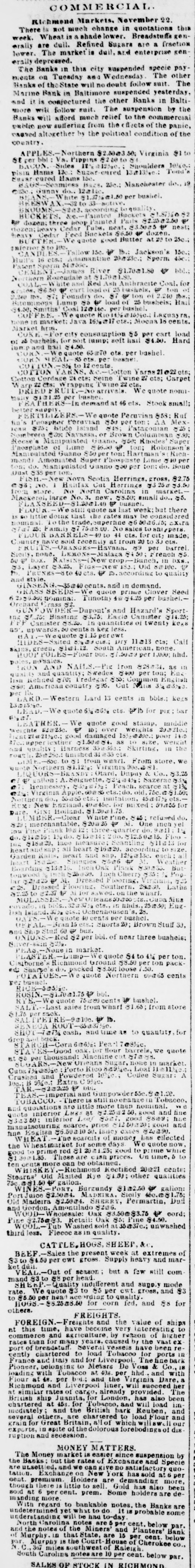 erally are dull. Refined Sugars are a fraction lower. The marketis duil, and enterprise gen erally depressed. The Banks in this city suspended specie pay. ments on Tuesday and Wednesday The other Banks of the State will no doubt follow suit. The Marine Bank in Baltimore suspended yesterday. and it is conjectured the other Banks in Baltimore will follow suit. The suspension by the Banks will afford much relief to the commercial public now suffering from the flects of the panic, caused altogether by the political condition of the country. APPLES.- Northern $2.50@3.50 Virginia $1 to St per bbl: Va. Pippins $26010 01 BACON. Sides Shoulders 1040.: pisin Hams 13c.: Sugar cured Tood's Hams 100. cured Cover -Seamiess Bags. 25c.: Manchester do., 19 Gunny do.: 12alic. hite per bushel. BEESW -32 to 33- active. BROOMS S203. according toquality BUCKETS. &e.-Painted Buckets 87360 52 - dozen; three ROOP Painted Pails $2.25 a 2.50 W dozen: heavy Cedar Tubs, neat. 50 as * nest; heavy Cedar Feed Buckets $6.50 W dozen. BU CTER. We quote good Butter at zu to 25c.; inferier CANDL to Tallow 150 W 15.: Jackson's 15c.; Hull's 16 ets.: Adminantine 20a23c.: Sporm 45c 540000. Sperm Patent CEMENT -James River $1.70am1.80 V bbl.; N thern Rosendale at White and Red Ash Anthracite Coal. for as. 86 50 # eart load of bushels. # ton 2.240 IDS 87; Foundry do. 87 $ ton 240 168.; Bitominous Lump 20 W load of 25 bushels: Hail $4.00 Smiths Coal 12@14c. per bushel. COFFEE. W quote 16%0.; Laguay ra, none in market: Java ets.; Moena 10 cents. Market hrm. COKE city consumption $5 per cart load o: 25 bushels. for soit lump; soft hail $4.50. Hard $4.50. hail and lung CORN quote 65 a 70 ets per bashel CORN ЧЕЛЬ 85 ets per busher TON to 12 cents COTTON YARNS, Cotton Yarms 1022 cts; Cotton Cordage 24 cts: Neine Twine 27 ets; Carpet cts: rapping Twine 22 ets. DRIED arrivals. We quote nomi busher per $101.25 mally In demand at 46 ets. Stock small; TILIZE We quote Peruvian 858: Ruf has Phospher Perovian $50 per ton AA Mex1088 $25; blide Istand WIS: Patagonian 825 Nombrero $30 Navassa. or Brown Columbian $30; Recse's Manipalated Guano, you: Rhodes Super Phosphate of Lime 46.50 $ ton; Robinson's Manipulated Guano Stoper ton: Hartman Richmond) Amonia Super Phosphate Lane 10 per ton; do. Manipulated Quano DOU per ton: do. Bone Dust 535 per FISH.- New Nova Scotia Herrings, gross, 82.75 000 NO. Hanfax Cut Herrings 13 25 a $3.50 from store No North Carolina in market. Mackerel, large No. new $8.50; small do., $5. FLA 200 # busnet FLOU a We still quote as last week: but there is $0 little doing that the rates may be considered nominal Tothe trade, Superhae 06 exira STaT 25: Family 75a8.00 No sales to pers. FLOO R BARR to 44 cts. for city inade; C mutry have sold recently at from 20 to 35 ets. FRU Havana. #9 per barrel Sicity, none. LEMONS- Malaga 50; French 85 DU D.X. New erop Bunch in DXS $3, Layer $3.25. FIGS-1 183.; Old 80 V PRU ses-ate 40 ets. V 10. according to quality style. and cents. and in demand. GRASS quote prime Clover Seed $2,50.50; nominal. Tunothy 4" $4.25 per bushel.Orchard GUN Dupont's and Hazard's Sport 106 of .76; Blasting $3.75 Eakie Canister $14.25; FFF Canister $8.20 In quantities of twenty kess as upwards, DU cents keg less. Wequote 0 15 per cwt HIDES- Salted Dry 11a13 ets; Call SKINS, $101.12 South American, none. HOOP POL tour DDI. . .50 $ per 1,000; hhd. nosales. poles, RUN AND NAILS Pig Iron as in qual and quantity Swedes $400 per ton; Enz lish Rehned $70; Fredegar $80; English S60: Amc country $95. Cut Valis 03/13 per LARD Western Lard 13 cents in bbls.; kegs 13:21:40 LEAD. We quote ets. WA for PIX bar 6%07 ATHER We quote good stamp. middle weights F 10; over weights 200210.; Fight 21%c.; good damaged poor 140 upper teather as 10 size weight and Harness 35a Skirting. in the 31 018 timished 25m25c roug -850 to from worrt. From store, we Quote Northern $1.12 Virginia 90c.0 ORS- Otard, Dupuy & Co., $3.25 $ callon Seignette, Sazerac hennessey Peach scarce 02% Virginia Apple our old 75c. $1.00; 35455 4544 ets.RUM New England 40 a 45e for mixed 512555 for Holland. Date MBER -Clear White Pine. SW: refused do. S29 merchantable, $200.25 to M. One men yet low 100 three do. 9all 1% 814mlo; $12.50.a15. Floo $18420, 1200 measure 16 for heart sap all heart $16 620. according Garden Rans, heart and sap. each Shingles 2006 # Weather Boarding $13.10 OAK But teawood Cherr Pop at $21425 # M. Dressed Flooring, ex. Dressed Flooring, Southern. 28.000. Laths to $2.37 P for sawed. on the whart. MOLASSES.- Mus eovado,in bids.. 32a375 ets., in hinds. 25 m 30; English ets.; Ochenne 28. quote 40 cents per bushel OF ets.: Shorts 20; Brown Stuff 30. bus. $ 60 Staff and ONIONS- Red $2 per bbl. of near three bushels; 8 skin 22% PEAS.-None in market PLASTER quote S4 to 4% per ton. Richmond Ground $8.50 per ton pack ed: Sharpe packed $8.50; loose 7.50. quote Northern cents per busnet. ROSIN. + bol. RYE.-We quote Surrements IF bushel. SALT.-- Last sales from wharf 81 60; from store $1.75 per sack. to. SAI SENECA ROOT SHOT Talk cash, and time is to quantity for drop 6064: Pearl 708%c. STA ES-Good OAK 101 Hour barrels, we quote at 00 per thousand: Machine cut STANS. Urieans Sugar, none in market. Cuba Porto Rico 84940. Load 10 Crushed and Powdered 10910.; Codee Sugar: A 100.; 9340.; Extra 9%0. R.-$2025 P DUL and Gunpowder5 TOBACCO. Thereis Tobacco, and quotations are little more than nominal. we quots interior Lugs at 50. good and fine $34350; inferior Soal. good 8809; has manufacturing scaree, price g and fine English 36.50 a 10 50. lane) cases $2,090. THEAT -The acaroity of money has effected the /heatmarket for some days We quotenow, good prime red 81 2021.25; good to time while These are ush prices. On time, 5 to ten more can be obtained. WHISKEY Richmond Rectified 20021 cents: Stearns' Old Maited Rye $1.00; other qualities 50 75c gallon. 3 WINES. Burgundy $102.50 # gallon: Juice $2.50m4. MADEIRA. 460.0$1.7 Old Madeira $2.50 04. SHERRY, Permartin