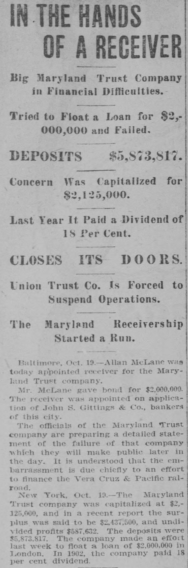 IN THE HANDS OF A RECEIVER Big Maryland Trust Company in Financial Difficulties. Tried to Float a Loan for $2,000,000 and Failed. DEPOSITS $5,873,817. Concern Was Capitalized for $2,125,000. Last Year It Paid a Dividend of 18 Per Cent. CLOSES ITS DOORS. Union Trust Co. Is Forced to Suspend Operations. The Receivership Maryland Started a Run. Baltimore, Oct. 19.-Allan McLane was today appointed receiver for the Maryland Trust company. Mr. McLane gave bond for $2,000,000. The receiver was appointed on application of John S. Gittings & Co., bankers of this city. The officials of the Maryland Trust company are preparing a detailed statement of the failure of that company which they will make public later in the day. It is understood that the embarrassment is due chiefly to an effort to finance the Vera Cruz & Pacific ralroad. New York, Oct. 19.-The Maryland Trust company was capitalized at $2,125,000, and in a recent report the surplus was said to be $2,437,500, and undivided profits $587,632. The deposits were $5,873,817. The company made an effort last week to float a loan of $2,000,000 in London. In 1902, the company paid 18 per cent dividend.