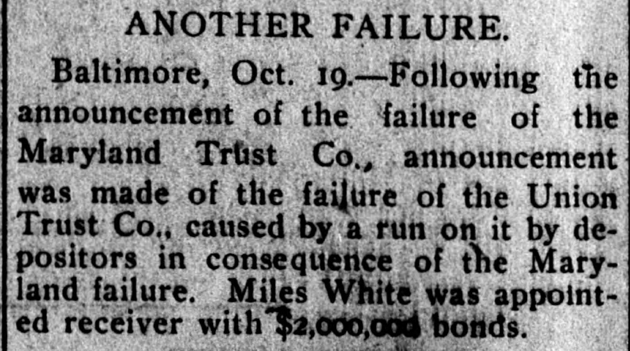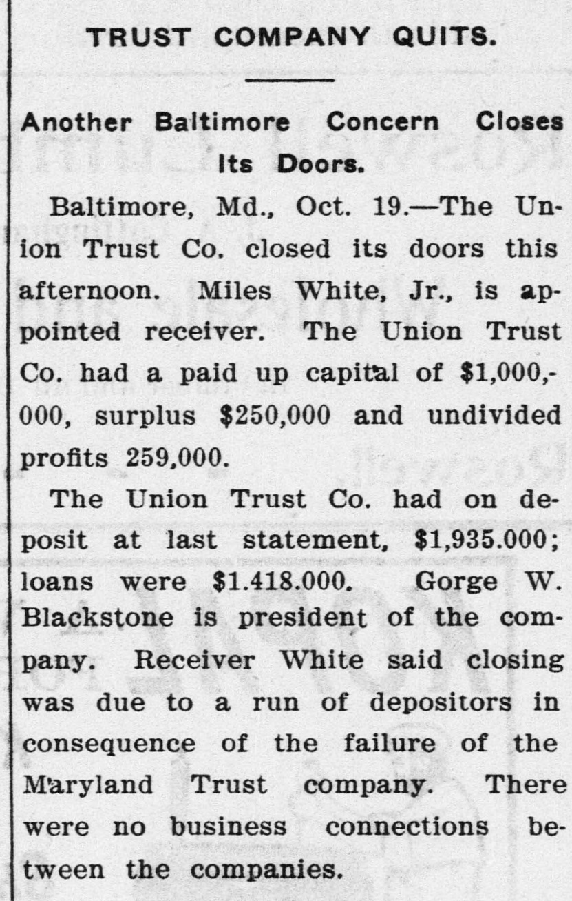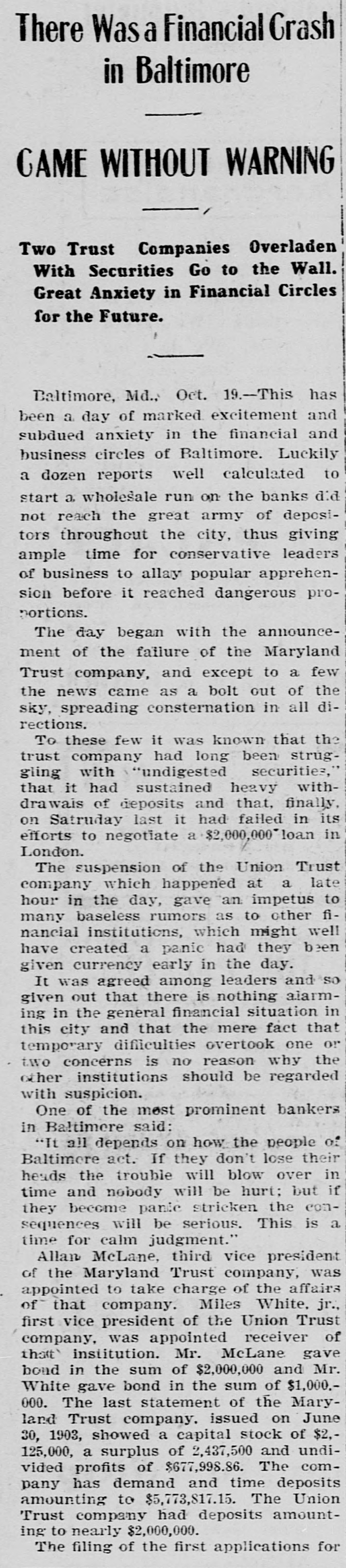 There Was a Financial Crash in Baltimore GAME WITHOUT WARNING Two Trust Companies Overladen With Securities Go to the Wall. Great Anxiety in Financial Circles for the Future. Baltimore, Md.. Oct. 19.-This has been a day of marked excitement and subdued anxiety in the financial and business circles of Baltimore. Luckily a dozen reports well calculated to start a wholesale run on the banks did not reach the great army of depositors throughout the city, thus giving ample time for conservative leaders of business to allay popular apprehension before it reached dangerous proportions. The day began with the announcement of the failure of the Maryland Trust company, and except to a few the news came as a bolt out of the sky, spreading consternation in all directions. To these few it was known that the trust company had long been struggling with "undigested securities," that it had sustained heavy withdrawais of deposits and that, finally, on Satruday last it had failed in its efforts to negotiate a $2,000,000 loan in London. The suspension of the Union Trust company which happened at a late hour in the day, gave an impetus to many baseless rumors as to other financial institutions, which might well have created a panic had they been given currency early in the day. It was agreed among leaders and so given out that there is nothing alarming in the general financial situation in this city and that the mere fact that temporary difficulties overtook one or two concerns is no reason why the other institutions should be regarded with suspicion. One of the most prominent bankers in Baltimere said: "It all depends on how the people of Baltimore act. If they don't lose their heads the trouble will blow over in time and nobody will be hurt; but if they become panic stricken the consequences will be serious. This is a time for calm judgment." Allan McLane, third vice president of the Maryland Trust company, was appointed to take charge of the affairs of that company. Miles White, jr., first vice president of the Union Trust company, was appointed receiver of that institution. Mr. McLane gave bond in the sum of $2,000,000 and Mr. White gave bond in the sum of $1,000.000. The last statement of the Maryland Trust company. issued on June 30, 1903, showed a capital stock of $2,125,000, a surplus of 2,437,500 and undivided profits of $677,998.86. The company has demand and time deposits amounting to $5,773,817.15. The Union Trust company had deposits amounting to nearly $2,000,000. The filing of the first applications for