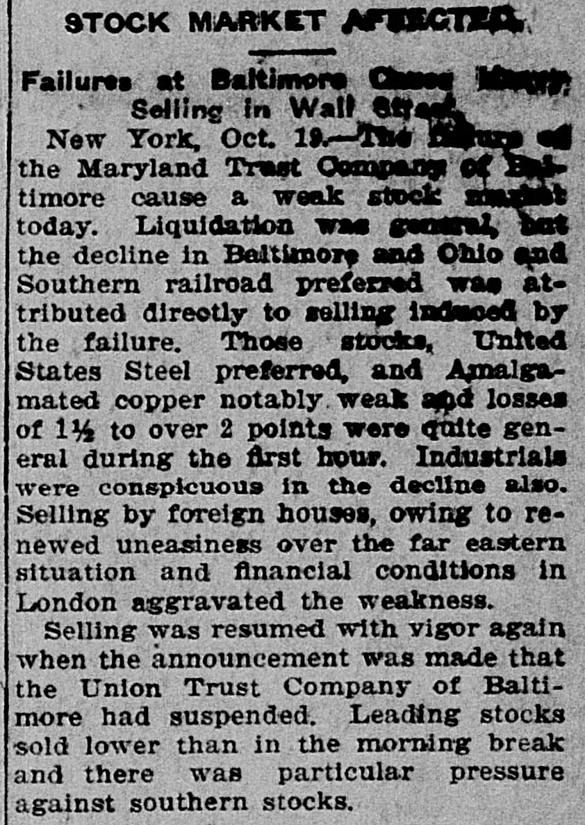 STOCK MARKET Failures at Baltimore Selling in Wall New York, Oct. 19.The the Maryland Trust Company timore cause a weak stock today. Liquidation was general the decline in Baltimore and Ohio and Southern railroad preferred was attributed directly to selling induced by the failure. Those stocks, United States Steel preferred, and Amalgamated copper notably weak and losses of 1 1/2 to over 2 points were quite general during the first hour. Industrials were conspicuous in the decline also. Selling by foreign houses, owing to renewed uneasiness over the far eastern situation and financial conditions in London aggravated the weakness. Selling was resumed with vigor again when the announcement was made that the Union Trust Company of Baltimore had suspended. Leading stocks sold lower than in the morning break and there was particular pressure against southern stocks.