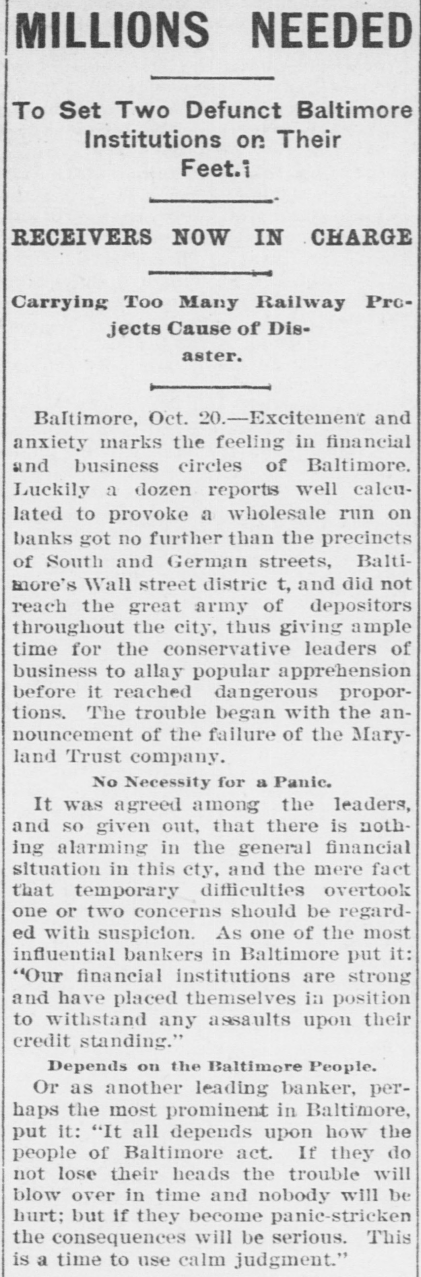 MILLIONS NEEDED To Set Two Defunct Baltimore Institutions on Their Feet.i RECEIVERS NOW IN CHARGE Carrying Too Many Railway Projects Cause of Disaster. Baltimore, Oct. 20.-Excitement and anxiety marks the feeling in financial and business circles of Baltimore, Luckily a dozen reports well calculated to provoke a wholesale run on banks got no further than the precincts of South and German streets, Baltimore's Wall street distric t, and did not reach the great army of depositors throughout the city, thus giving ample time for the conservative leaders of business to allay popular apprehension before it reached dangerous proportions, The trouble began with the announcement of the failure of the Maryland Trust company. No Necessity for a Panic. It was agreed among the leaders, and so given out, that there is nothing alarming in the general financial situation in this cty, and the mere fact that temporary difficulties overtook one or two concerns should be regarded with suspicion. As one of the most influential bankers in Baltimore put it: "Our financial institutions are strong and have placed themselves in position to withstand any assaults upon their credit standing." Depends on the Baltimore People. Or as another leading banker, perhaps the most prominent in Baltimore, put it: "It all depends upon how the people of Baltimore act. If they do not lose their heads the trouble will blow over in time and nobody will be hurt; but if they become panie-stricken the consequences will be serious. This is a time to use calm judgment."