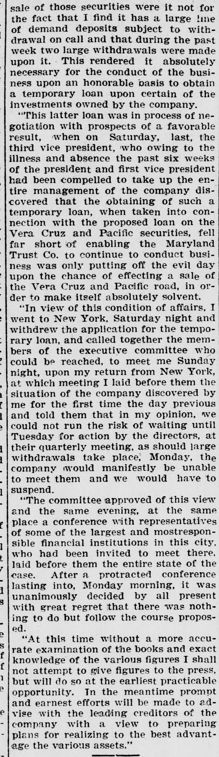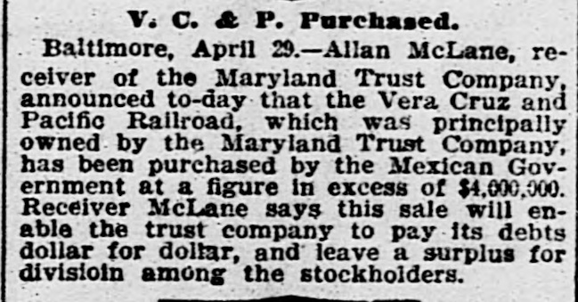 "This latter loan was in process of negotiation with prospects of a favorable result, when on Saturday, last, the third vice president, who owing to the illness and absence the past six weeks of the president and first vice president had been compelled to take up the entire management of the company discovered that the obtaining of such a temporary loan, when taken into connection with the proposed loan on the Vera Cruz and Pacific securities, fell far short of enabling the Maryland Trust Co. to continue to conduct business was only putting off the evil day upon the chance of effecting a sale of the Vera Cruz and Pacific road, in order to make itself absolutely solvent.