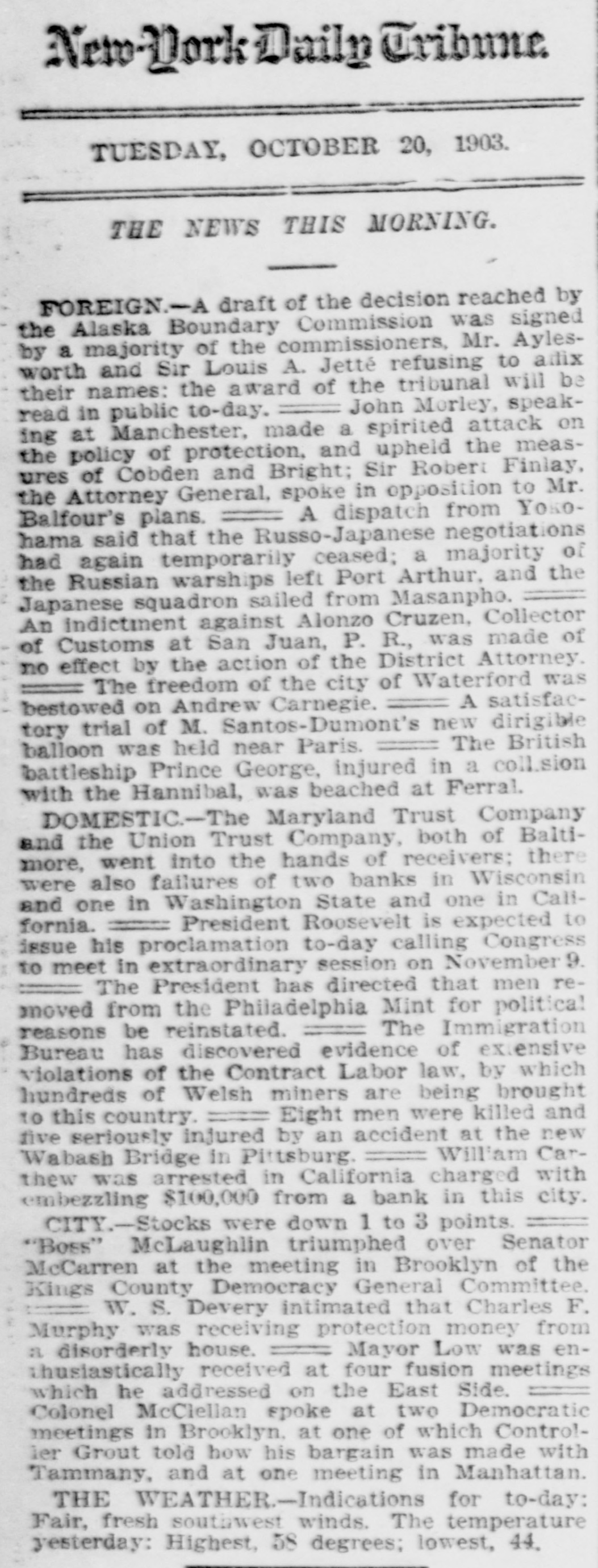 FOREIGN.-A draft of the decision reached by the Alaska Boundary Commission was signed by a majority of the commissioners, Mr. Aylesworth and Sir Louis A. Jetté refusing to adix their names: the award of the tribunal will be read in public to-day.