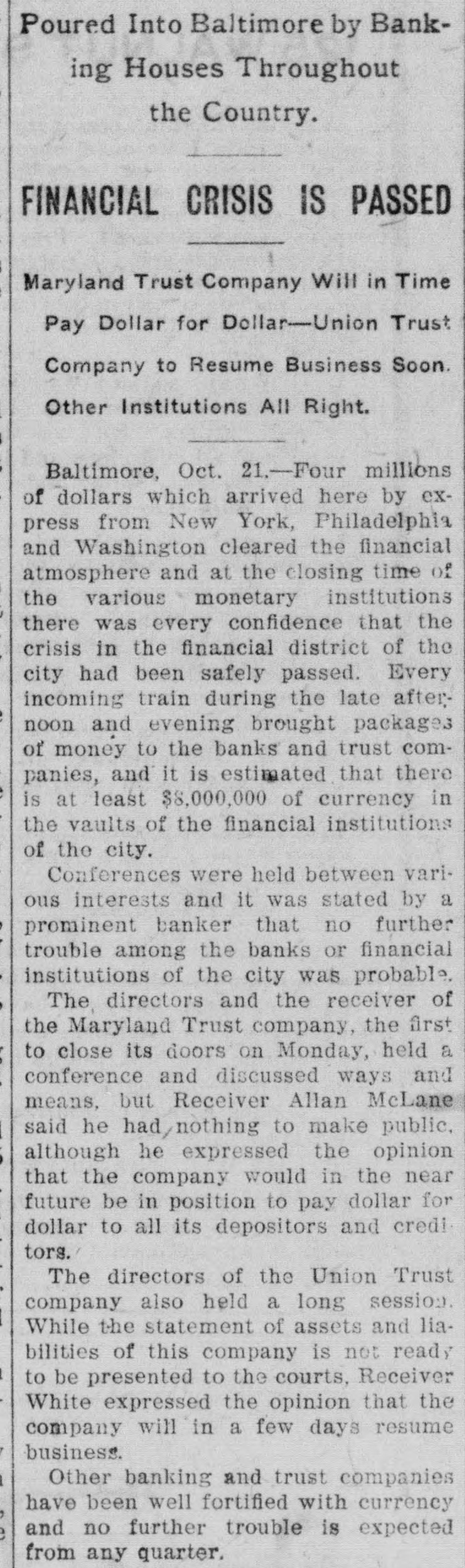 Poured Into Baltimore by Banking Houses Throughout the Country. FINANCIAL CRISIS IS PASSED Maryland Trust Company Will in Time Pay Dollar for Dollar-Union Trust Company to Resume Business Soon. Other Institutions All Right. Baltimore, Oct. 21.-Four millions of dollars which arrived here by express from New York, Philadelphia and Washington cleared the financial atmosphere and at the closing time of the various monetary institutions there was every confidence that the crisis in the financial district of the city had been safely passed. Every incoming train during the late afternoon and evening brought packages of money to the banks and trust companies, and it is estimated that there is at least $8,000,000 of currency in the vaults of the financial institutions of the city. Conferences were held between various interests and it was stated by a prominent banker that no further trouble among the banks or financial institutions of the city was probable. The directors and the receiver of the Maryland Trust company, the first to close its doors on Monday, held a conference and discussed ways and means, but Receiver Allan McLane said he nothing to make public, although he expressed the opinion that the company would in the near future be in position to pay dollar for dollar to all its depositors and creditors. The directors of the Union Trust company also held a long session. While the statement of assets and liabilities of this company is not ready to be presented to the courts, Receiver White expressed the opinion that the company will in a few days resume business. Other banking and trust companies have been well fortified with currency and no further trouble is expected from any quarter.