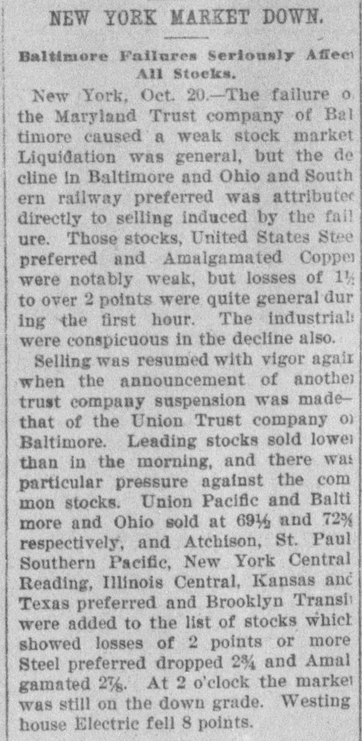 NEW YORK MARKET DOWN. Baltimore Failures Seriously Affect All Stocks. New York, Oct. 20.-The failure 0. the Maryland Trust company of Bal timore caused a weak stock market Liquidation was general, but the de cline in Baltimore and Ohio and South ern railway preferred was attributed directly to selling induced by the fail ure. Those stocks, United States Stee preferred and Amalgamated Copper were notably weak, but losses of 1½ to over 2 points were quite general dur ing the first hour. The industrials were conspicuous in the decline also. Selling was resumed with vigor agair when the announcement of another trust company suspension was madethat of the Union Trust company 0) Baltimore. Leading stocks sold lower than in the morning, and there was particular pressure against the com mon stocks. Union Pacific and Balti more and Ohio sold at 69½ and 72% respectively, and Atchison, St. Paul Southern Pacific, New York Central Reading, Illinois Central, Kansas and Texas preferred and Brooklyn Transit were added to the list of stocks which showed losses of 2 points or more Steel preferred dropped 28/4 and Amal gamated 2½. At 2 o'clock the market was still on the down grade. Westing house Electric fell 8 points.