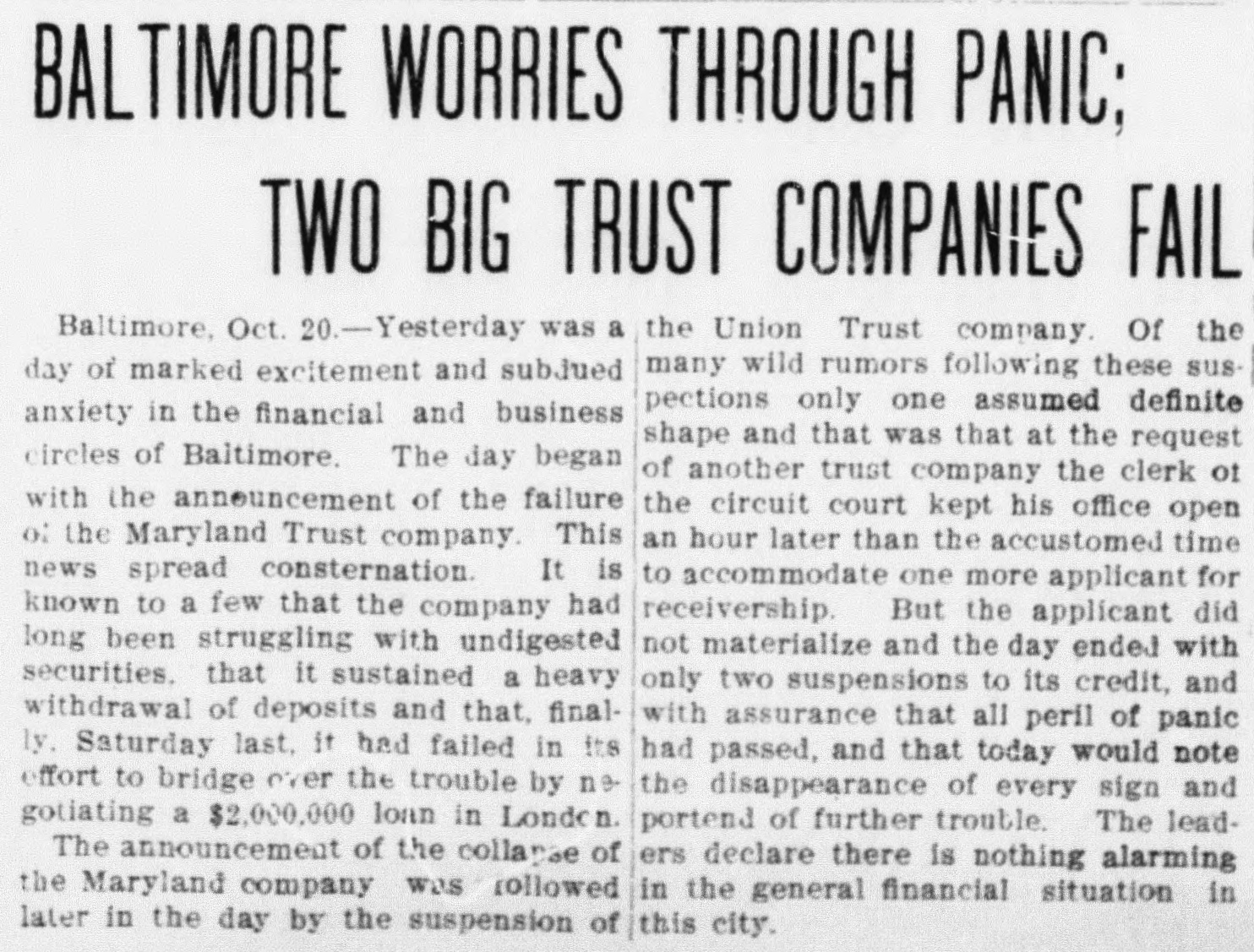 BALTIMORE WORRIES THROUGH PANIC; TWO BIG TRUST COMPANIES FAIL Baltimore, Oct. 20.-Yesterday was a the Union Trust company. Of the many wild rumors following these susday of marked excitement and subjued pections only one assumed definite anxiety in the financial and business shape and that was that at the request circles of Baltimore. The day began of another trust company the clerk ot with the announcement of the failure the circuit court kept his office open of the Maryland Trust company. This an hour later than the accustomed time news spread consternation. It is to accommodate one more applicant for known to a few that the company had receivership. But the applicant did long been struggling with undigested not materialize and the day ended with securities. that it sustained a heavy only two suspensions to its credit, and withdrawal of deposits and that, finalwith assurance that all peril of panic ly. Saturday last, it had failed in its had passed, and that today would note effort to bridge over the trouble by nethe disappearance of every sign and gotiating a $2,000,000 loan in Londo n. portend of further trouble. The leadThe announcement of the collanse of ers declare there is nothing alarming the Maryland company was rollowed in the general financial situation in later in the day by the suspension of this city.