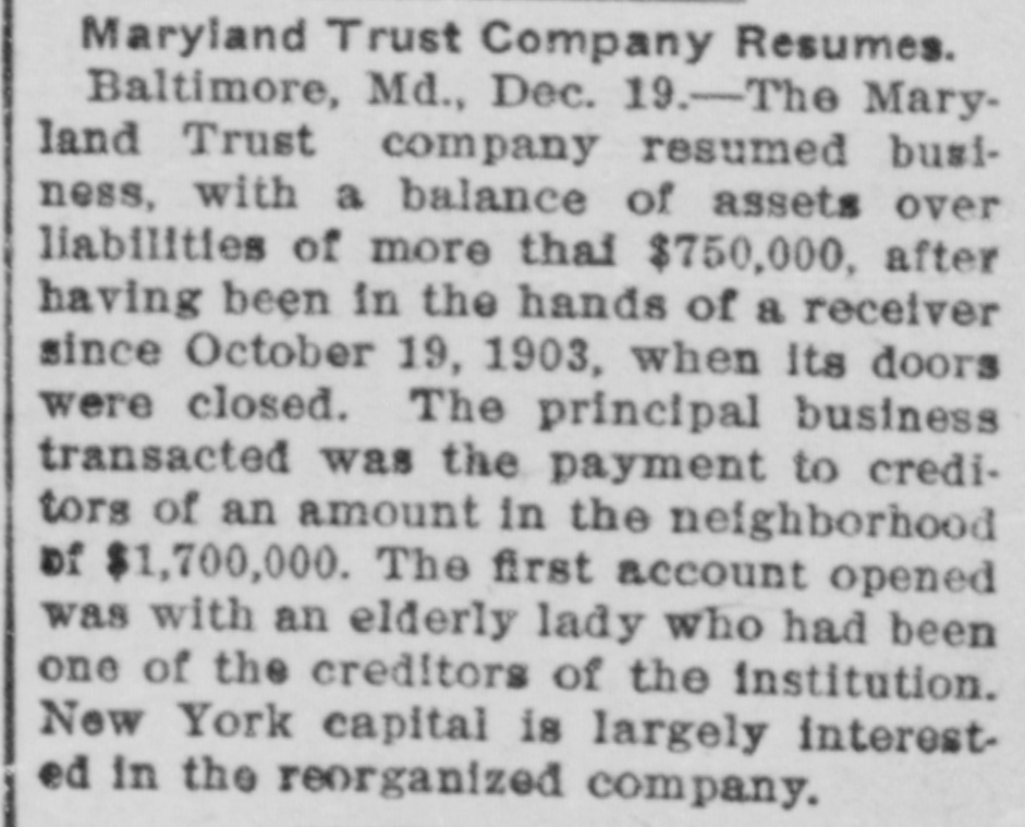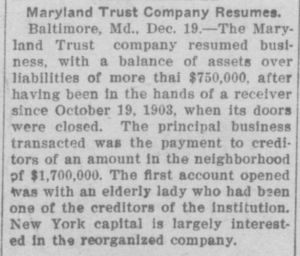 Maryland Trust Company Resumes. Baltimore, Md., Dec. 19.-The Maryland Trust company resumed business, with a balance of assets over liabilities of more thai $750,000, after having been in the hands of a receiver since October 19, 1903, when its doors were closed. The principal business transacted was the payment to creditors of an amount in the neighborhood of $1,700,000. The first account opened was with an elderly lady who had been one of the creditors of the institution. New York capital is largely interested in the reorganized company.