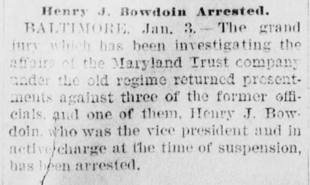 Baltimore, Jan. 3.-The grand jury which has been investigating the affairs of the Maryland Trust company under the old regime during the day returned presentments against three of the former officials. One of them, Henry J. Bowdoin, who was vice president and in active charge at the time of suspension, was arrested on a capias from the criminal court and released under a bond of $10,000. The other two have not been arrested and until they are taken into custody their names are withheld.