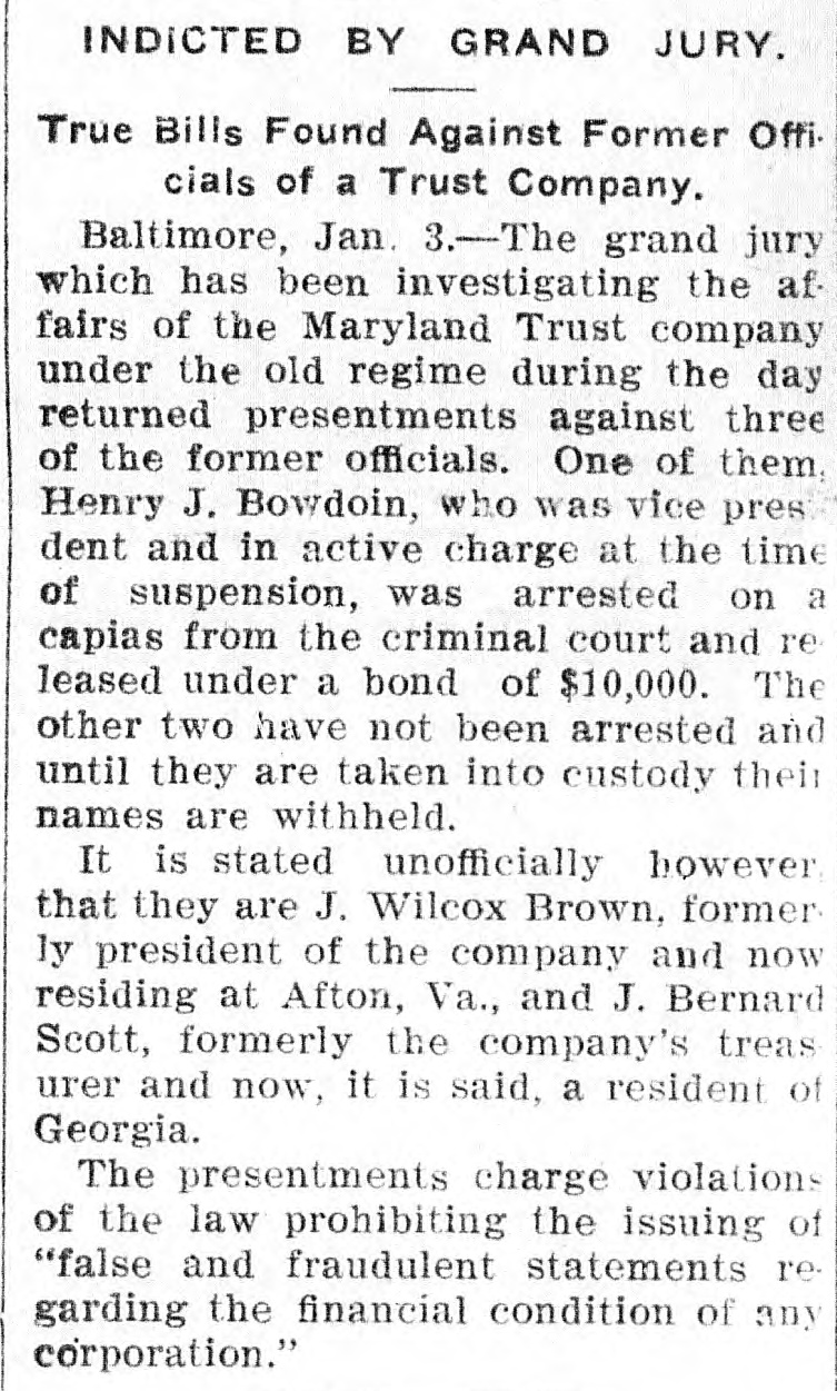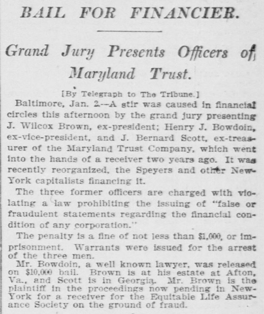 BAIL FOR FINANCIER. Grand Jury Presents Officers of Maryland Trust. [By Telegraph to The Tribune.] Baltimore, Jan. 2--A stir was caused in financial circles this afternoon by the grand jury presenting J. Wilcox Brown, ex-president; Henry J. Bowdoin, ex-vice-president, and J. Bernard Scott, ex-treasurer of the Maryland Trust Company, which went into the hands of a receiver two years ago. It was recently reorganized, the Speyers and other New York capitalists financing it. The three former officers are charged with violating a law prohibiting the issuing of "false or fraudulent statements regarding the financial condition of any corporation." The penalty is a fine of not less than $1,000, or imprisonment. Warrants were issued for the arrest of the three men. Mr. Bowdoin, a well known lawyer, was released on $10,000 bail. Brown is at his estate at Afton, Va., and Scott is in Georgia. Mr. Brown is the plaintiff in the proceedings now pending in NewYork for a receiver for the Equitable Life Assurance Society on the ground of fraud.