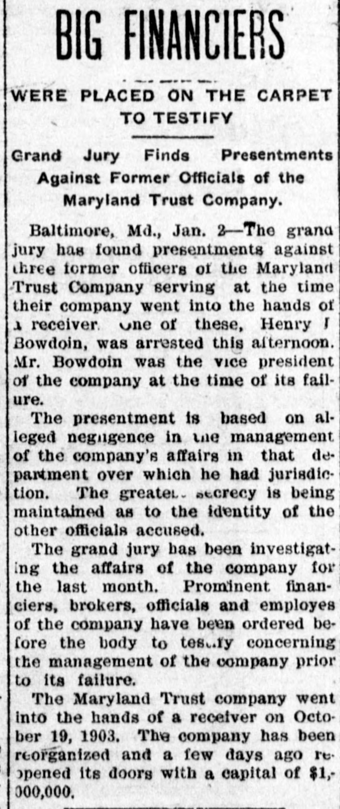 BIG FINANCIERS WERE PLACED ON THE CARPET TO TESTIFY Presentments Grand Jury Finds Against Former Officials of the Maryland Trust Company. Baltimore, Md., Jan. 2-The grand jury has found presentments against three former officers of the Maryland Trust Company serving at the time their company went into the hands of 1 receiver. one of these, Henry I Bowdoin, was arrested this afternoon. Mr. Bowdoin was the vice president of the company at the time of its failure. The presentment is based on alleged negngence in the management of the company's affairs in that department over which he had juriadiction. The greater. secrecy is being maintained as to the identity of the other officials accused. The grand jury has been investigating the affairs of the company for the last month. Prominent financiers, brokers, officials and employes of the company have been ordered before the body to test.fy concerning the management of the company prior to its failure. The Maryland Trust company went into the hands of a receiver on October 19, 1903. The company has been reorganized and a few days ago re. opened its doors with a capital of $1, 000,000.