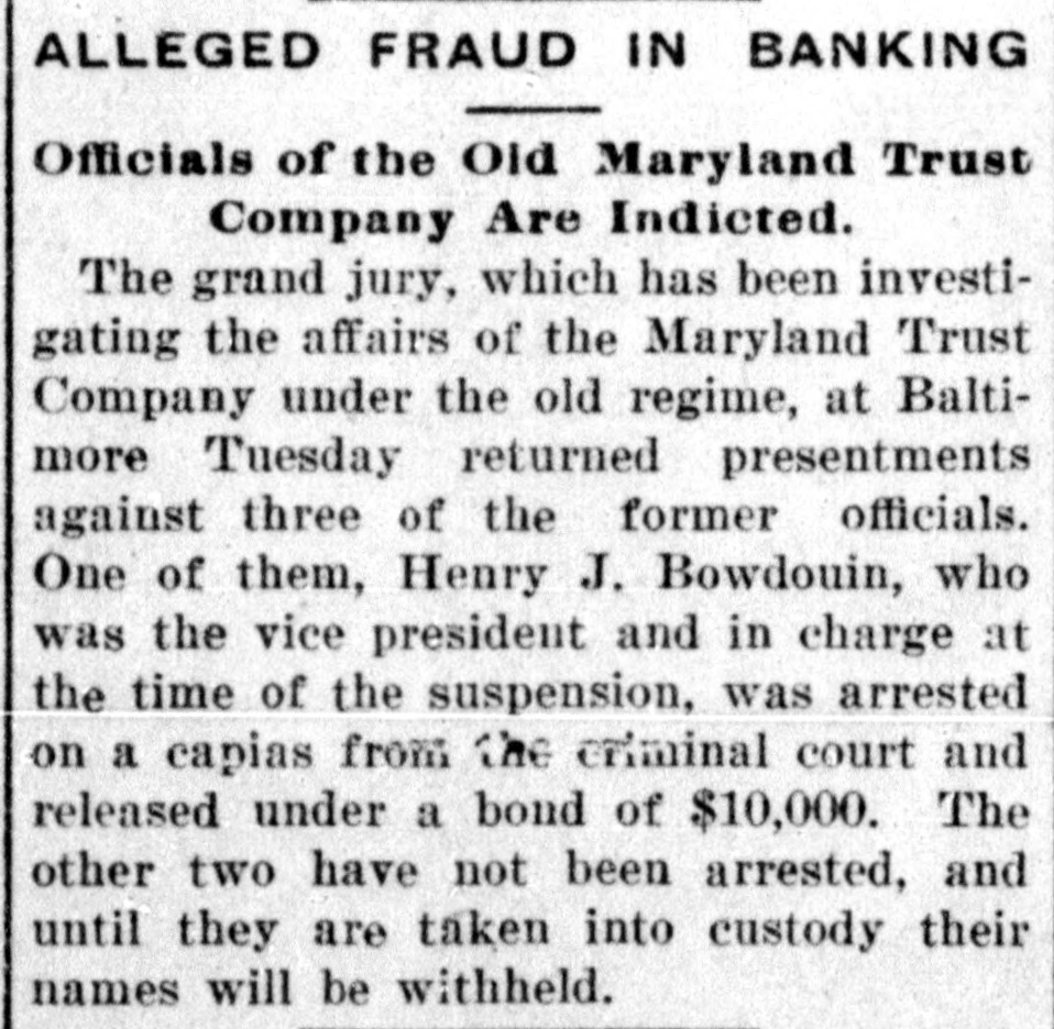 The grand jury, which has been investigating the affairs of the Maryland Trust Company under the old regime, at Baltimore Tuesday returned presentments against three of the former officials. One of them, Henry J. Bowdouin, who was the vice president and in charge at the time of the suspension, was arrested on a capias from the criminal court and released under a bond of $10,000. The other two have not been arrested, and until they are taken into custody their names will be withheld.