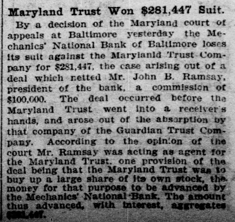 By a decision of the Maryland court of appeals at Baltimore yesterday the Me-chanics' National Bank of Baltimore loses its suit against the Maryland Trust Com-pany for $281,447, the case arising out of a deal which netted Mr. John B. Ramsay, president of the bank, a commission of $100,000. The deal occurred before the Maryland Trust went into a receiver's hands, and arose out of the absorption by that company of the Guardian Trust Com-pany. According to the opinion of the court Mr. Ramsay was acting as agent for the Maryland Trust, one provision of the deal being that the Maryland Trust was to buy up a large share of its own stock, the money for that purpose to be advanced by the Mechanics' National Bank. The amount thus advanced, with interest, aggregates