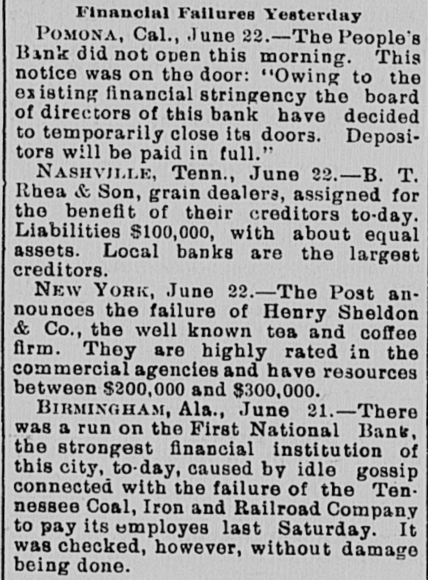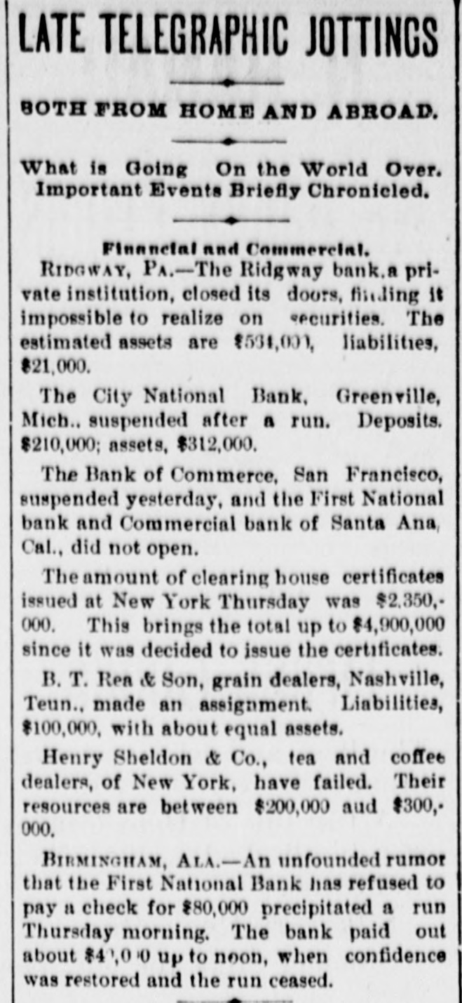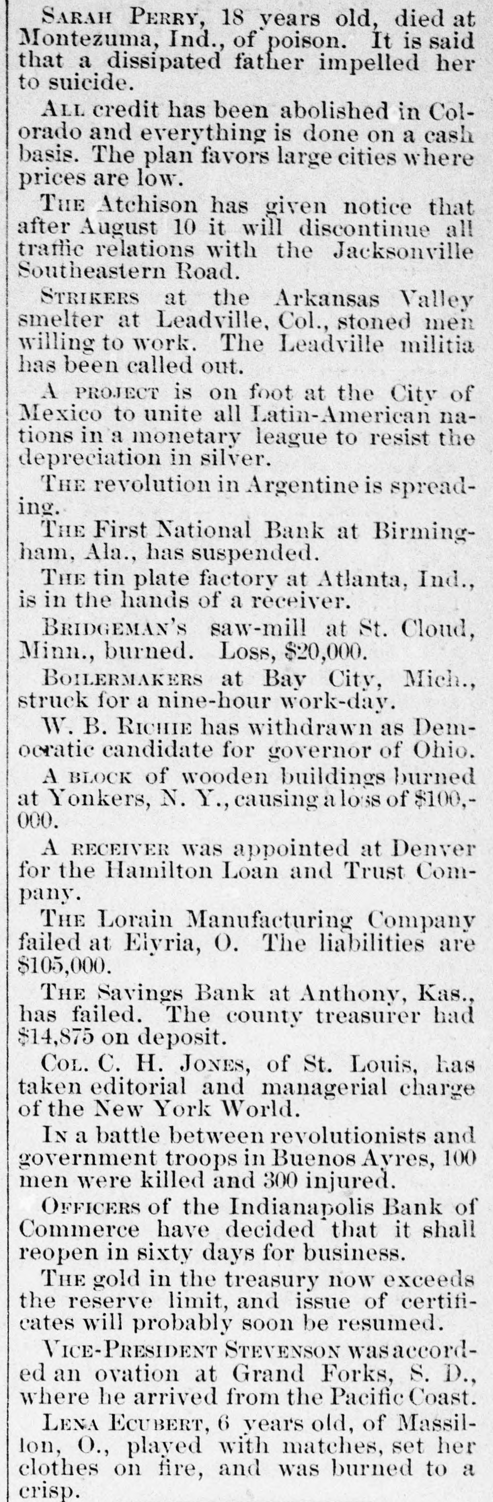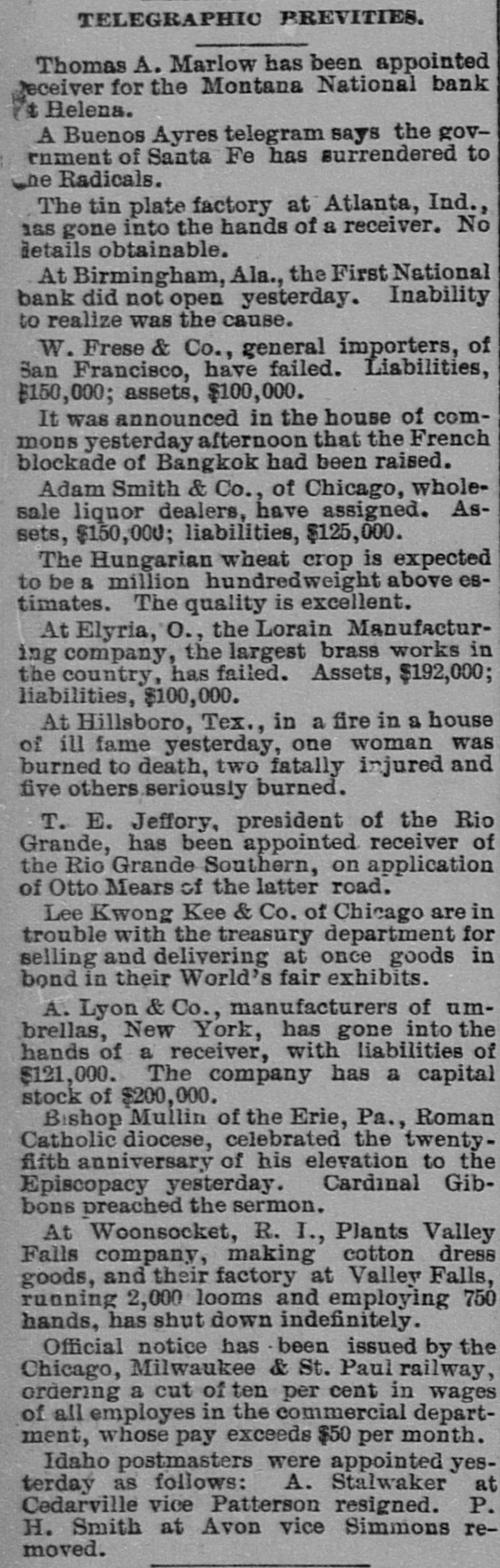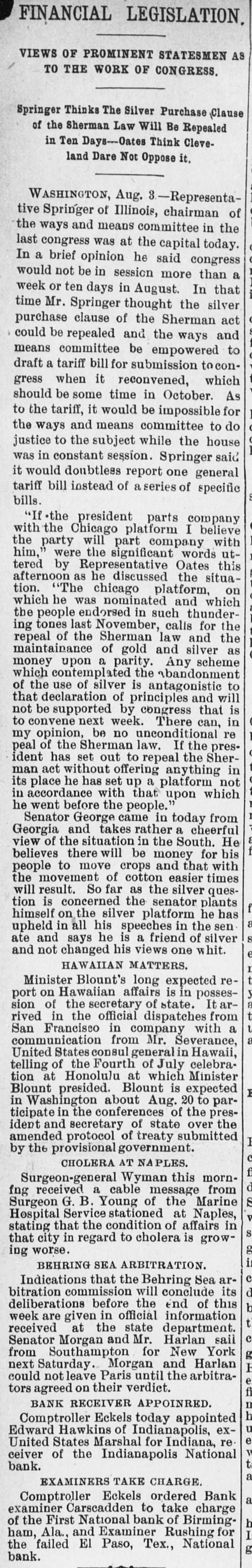 Mr. Carlisle Has Plenty of Gold. THE RESERVE MADE GOOD. There Is a Surplus in the Treasury, and Millions More Are on the Way. Special to THE MORNING CALL WASHINGTON, Aug. 1.-For the first time since April 20 last, when the gold reserve fell below the $1,000,000 mark. the reserve in amounts or is 701,370 the treasury has $791,370 been to-day made free gold. good. This The to gold gold $100,from Europe, Mexico and the West Indies, much of it being gold sent out from the United States during the late spring and early summer months. Information in treasury circles indicates that there is $10,000,000 now on its way from Europe to the United States and most of this, it is expected, will find its way, as usual, into the treasury. While the gold reserve is intact and the free gold is climbing up, the treasury net balance is declining, it is stated to-day the amount being $17,251,000. The receipts, too, for the past two days have been disappointing, business troubles throughout the country having an effect upon the Government revenue. Everything that situation. after can be a done conference Secretary being done in Carlisle New to relieve York to-day. with the eminent financiers, directed acting Secretary Curtis to send the following telegram to the 150 bank depositories throughout United States: Your authorized balance is hereby fixed at par of security. Transfer the excess. whenever practicable, to the nearest subtreasury." "This action of the Treasury Department will release to the banks about $900,000 and is intended, as far as practicable, to relieve the financial stringency prevailing in the country. The circulation statement issued by the Treasury Department to-day shows the amount of gold and silver coin and certificates, United States notes and national bank notes in circulation on August 1 was $1,611,099,117, an increase during the month of July of $17,237,606. The increase during the last twelve months was, in round tigures, $9,000,000. The per capita circulation, based on an estimated population of 67,066,000 on August 1. was $24 02. Three national bank failures were reported to Comptroller Eckels this morning. The E1 Paso National Bank at E! Paso, Tex., capital $150,000; the First National at Birmingham, Ala., capital $250,000; the Waupaya County National Bank of Waupaya, Wis., capital $50,000. The Birmingham and El Paso banks carried quite a heavy line of deposits. Thomas A. Marlow was to-day appointed receiver of the Montana National Bank at Helena. NEW YORK, Aug. 2.-Frederick D. Tappen, president of the Gallatin National Bank and chairman of the Clearing-house loan committee, said to-day that several large national banks were going to buy some of the United States 4 per cent bonds held by the savings banks and take out currency against them. "There was no syndicate nor concerted plan by the Clearing-house banks in the matter," he said. "It was simply individual action between the banks. It was expected the banks buying bonds would get them for a little less than the current market rate, because if the savings banks were compelled to put a large amount of their bonds on the open market the price would certainly be forced down to 104 or 105, and perhaps even less." This afternoon Secretary Carlisle junched with Sub Treasurer Jordan and ex-Secretary Fairchild. Later he visted the sub-treasury and customhouse. He met no bankers and said he had DO opinion to express on the financial situation or the probable action of Congress. He said he, personally, was in favor of allowing the national banks to issue circulation to the par value of the bonds deposited as security. There was no likelihood of any action by Congress on that point at the extra session. however. DENVER, Aug. 2.-T. E. Jeffrey, president of the Rio Grande, was to-day appointed receiver of the Rio Grande Southern. on application of Otto Meyers of the latter. MILWAUKEE, Aug. -An official notice has been issued by the St. Paul Railway ordering a cut of 10 per cent in the wages of all employes of the commercial department whose pay exceeds $50 per month. ELYRIA, Ohio, Aug. 2.-The Lorain Manufacturing Company, the largest brass works in the country. has failed; assets $192,000, liabilities $125,000. CHICAGO. Aug. 2.-Adam Smith & Co., wholesale liquor-dealers, have assigned. Assets $150,000. liabilities $125,000. NEW YORK, Aug. 2.-Sulzbacher, Gitterman & Wade, importers of woolens, made an assignment to-day without preferences. The business is an d-established one, having been founded in 1856. In 1878 they were estimated to be worth $1.000,000, but the business bas fallen off, and lately the capital was estimated at only $230,000. The attorneys estimate that the liabilities are $120,000. with assets nominally the same.