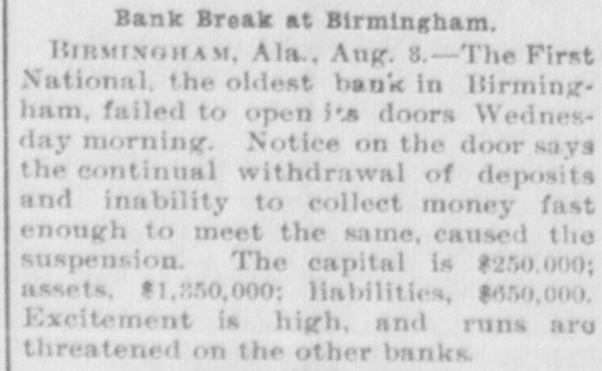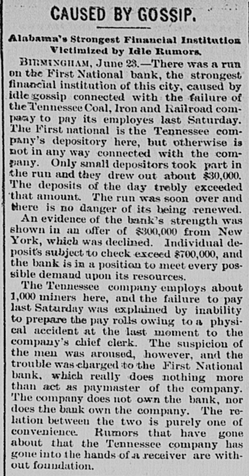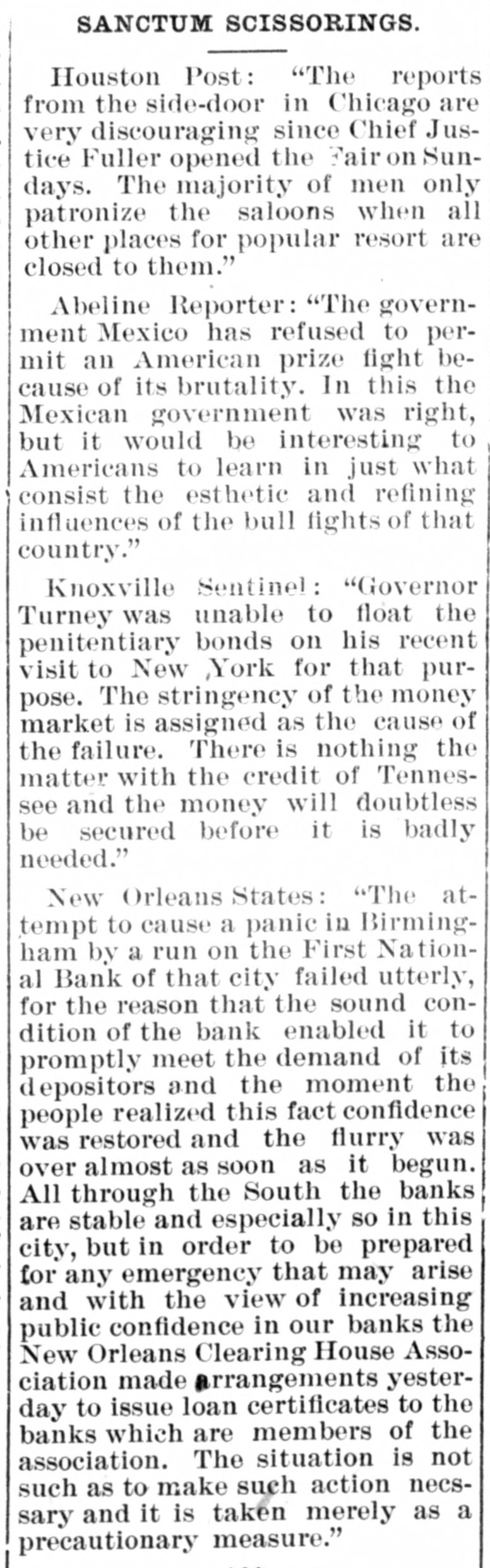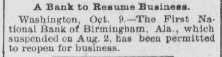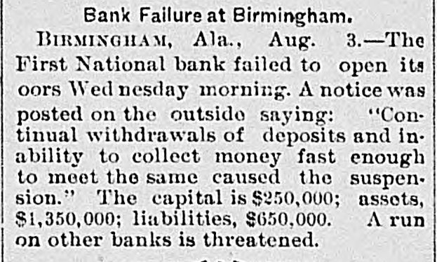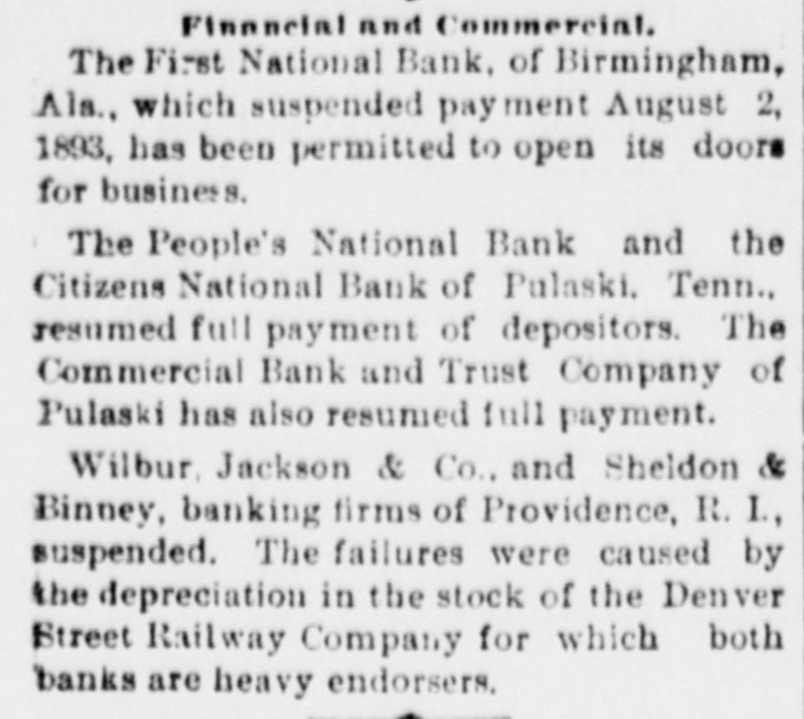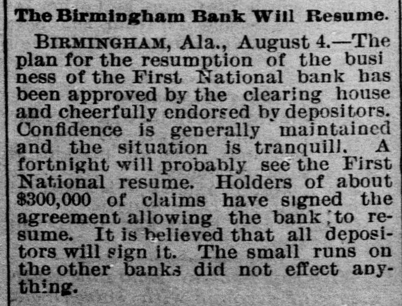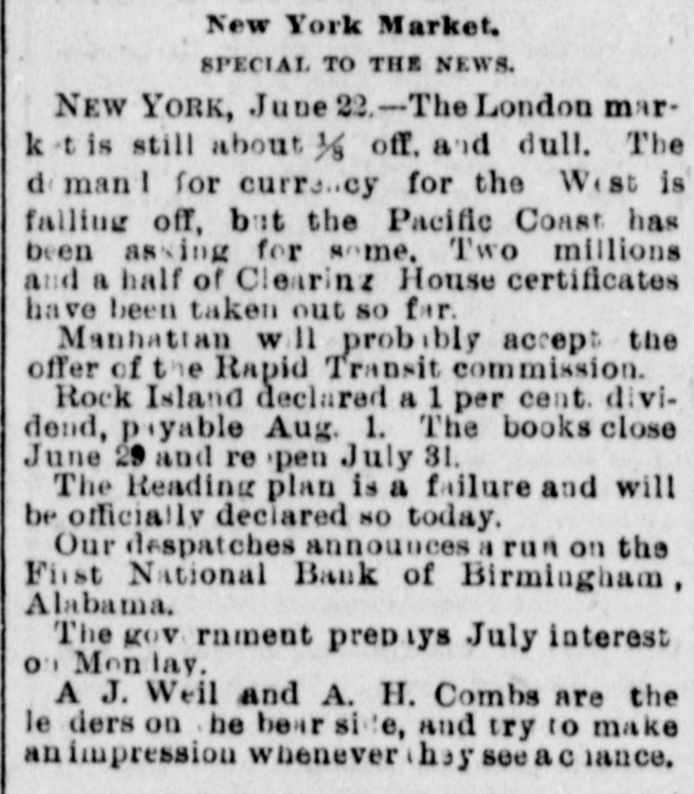 Mr. Carlisle Has Plenty of Gold. THE RESERVE MADE GOOD. There Is a Surplus in the Treasury, and Millions More Are on the Way. Special to THE MORNING CALL WASHINGTON, Aug. 1.-For the first time since April 20 last, when the gold reserve fell below the $1,000,000 mark. the reserve in amounts or is 701,370 the treasury has $791,370 been to-day made free gold. good. This The to gold gold $100,from Europe, Mexico and the West Indies, much of it being gold sent out from the United States during the late spring and early summer months. Information in treasury circles indicates that there is $10,000,000 now on its way from Europe to the United States and most of this, it is expected, will find its way, as usual, into the treasury. While the gold reserve is intact and the free gold is climbing up, the treasury net balance is declining, it is stated to-day the amount being $17,251,000. The receipts, too, for the past two days have been disappointing, business troubles throughout the country having an effect upon the Government revenue. Everything that situation. after can be a done conference Secretary being done in Carlisle New to relieve York to-day. with the eminent financiers, directed acting Secretary Curtis to send the following telegram to the 150 bank depositories throughout United States: Your authorized balance is hereby fixed at par of security. Transfer the excess. whenever practicable, to the nearest subtreasury." "This action of the Treasury Department will release to the banks about $900,000 and is intended, as far as practicable, to relieve the financial stringency prevailing in the country. The circulation statement issued by the Treasury Department to-day shows the amount of gold and silver coin and certificates, United States notes and national bank notes in circulation on August 1 was $1,611,099,117, an increase during the month of July of $17,237,606. The increase during the last twelve months was, in round tigures, $9,000,000. The per capita circulation, based on an estimated population of 67,066,000 on August 1. was $24 02. Three national bank failures were reported to Comptroller Eckels this morning. The E1 Paso National Bank at E! Paso, Tex., capital $150,000; the First National at Birmingham, Ala., capital $250,000; the Waupaya County National Bank of Waupaya, Wis., capital $50,000. The Birmingham and El Paso banks carried quite a heavy line of deposits. Thomas A. Marlow was to-day appointed receiver of the Montana National Bank at Helena. NEW YORK, Aug. 2.-Frederick D. Tappen, president of the Gallatin National Bank and chairman of the Clearing-house loan committee, said to-day that several large national banks were going to buy some of the United States 4 per cent bonds held by the savings banks and take out currency against them. "There was no syndicate nor concerted plan by the Clearing-house banks in the matter," he said. "It was simply individual action between the banks. It was expected the banks buying bonds would get them for a little less than the current market rate, because if the savings banks were compelled to put a large amount of their bonds on the open market the price would certainly be forced down to 104 or 105, and perhaps even less." This afternoon Secretary Carlisle junched with Sub Treasurer Jordan and ex-Secretary Fairchild. Later he visted the sub-treasury and customhouse. He met no bankers and said he had DO opinion to express on the financial situation or the probable action of Congress. He said he, personally, was in favor of allowing the national banks to issue circulation to the par value of the bonds deposited as security. There was no likelihood of any action by Congress on that point at the extra session. however. DENVER, Aug. 2.-T. E. Jeffrey, president of the Rio Grande, was to-day appointed receiver of the Rio Grande Southern. on application of Otto Meyers of the latter. MILWAUKEE, Aug. -An official notice has been issued by the St. Paul Railway ordering a cut of 10 per cent in the wages of all employes of the commercial department whose pay exceeds $50 per month. ELYRIA, Ohio, Aug. 2.-The Lorain Manufacturing Company, the largest brass works in the country. has failed; assets $192,000, liabilities $125,000. CHICAGO. Aug. 2.-Adam Smith & Co., wholesale liquor-dealers, have assigned. Assets $150,000. liabilities $125,000. NEW YORK, Aug. 2.-Sulzbacher, Gitterman & Wade, importers of woolens, made an assignment to-day without preferences. The business is an d-established one, having been founded in 1856. In 1878 they were estimated to be worth $1.000,000, but the business bas fallen off, and lately the capital was estimated at only $230,000. The attorneys estimate that the liabilities are $120,000. with assets nominally the same.
