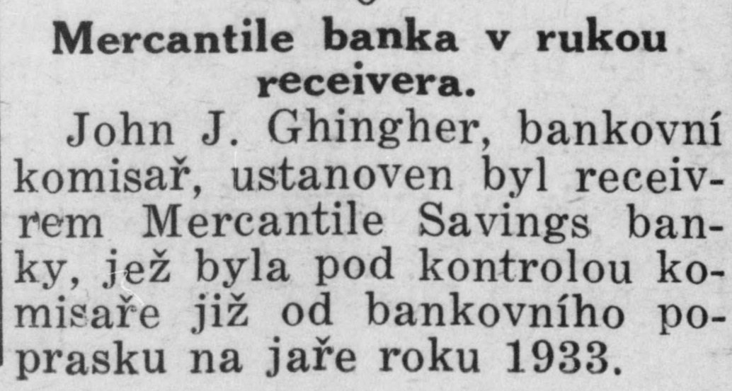 Article (in Czech) states the bank had been under the control of the banking commissioner since the bank panic in spring 1933 and that on 1935-01-04 the commissioner (John J. Ghingher) was appointed receiver. No explicit depositor run on this specific bank is described in the excerpt; sequence is suspension/control (spring 1933) followed by receivership (closure) in 1935.