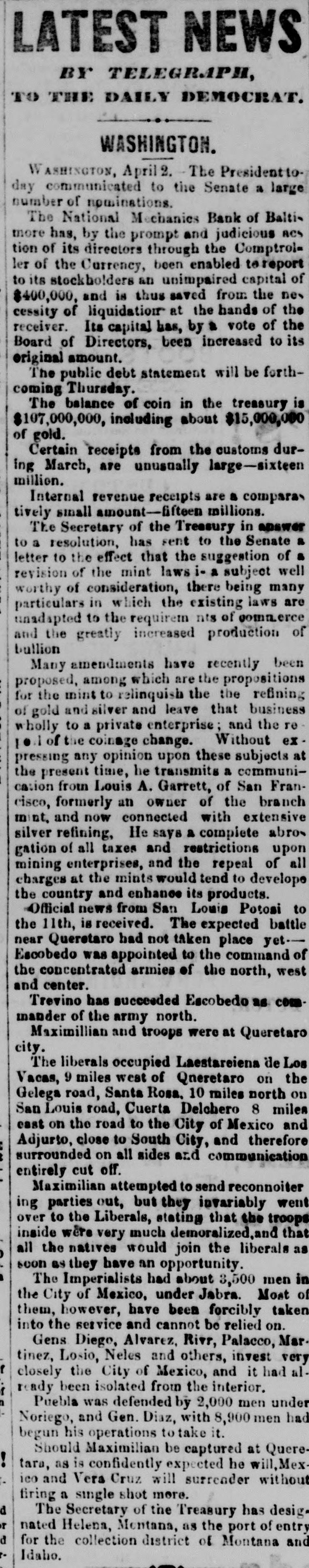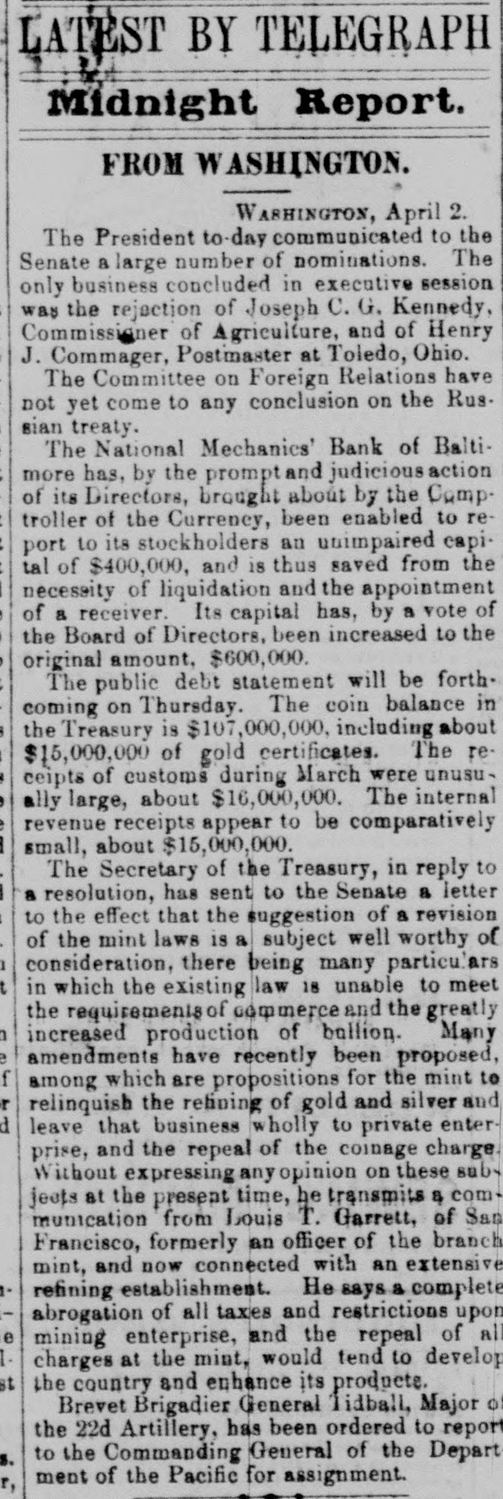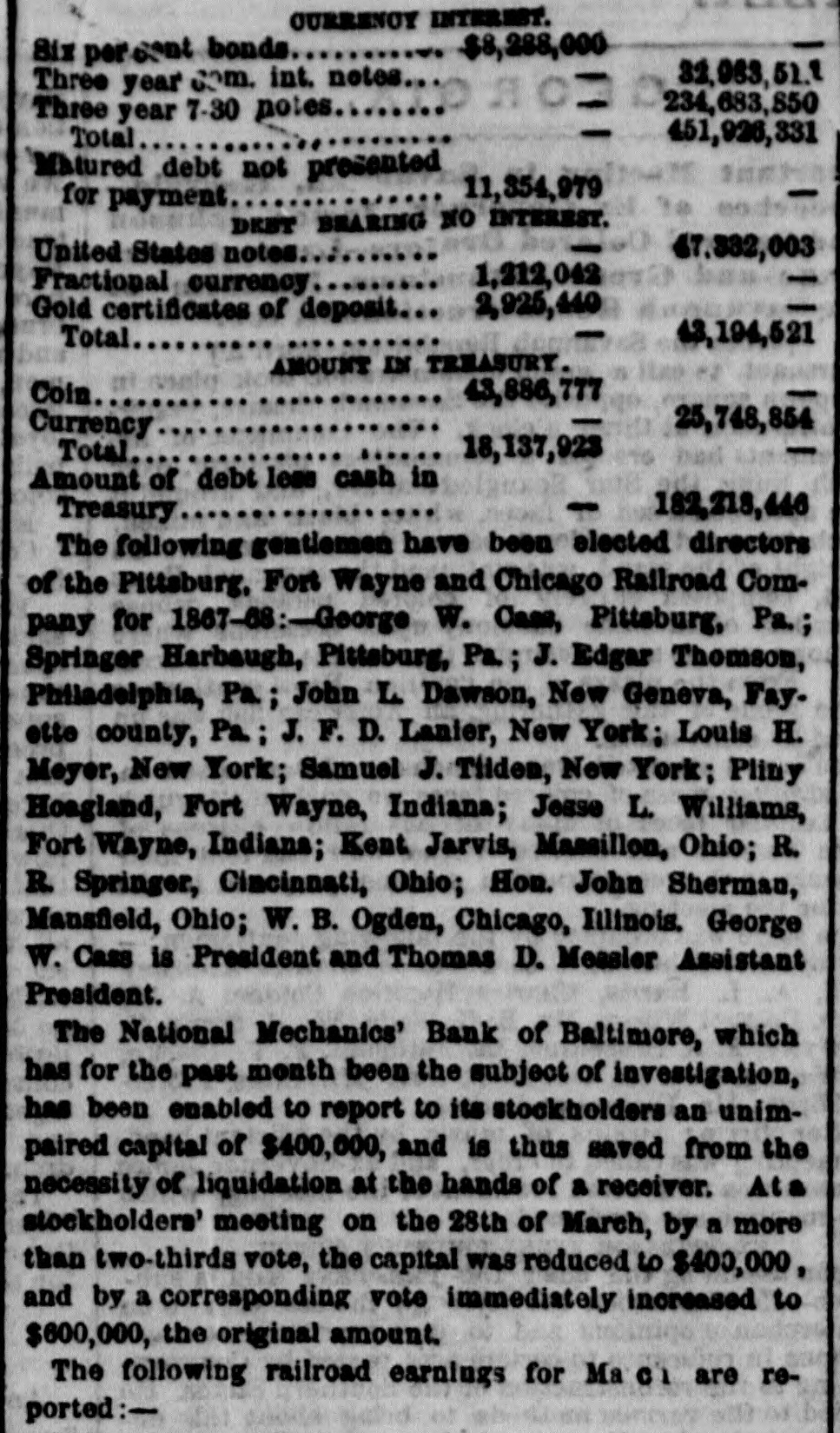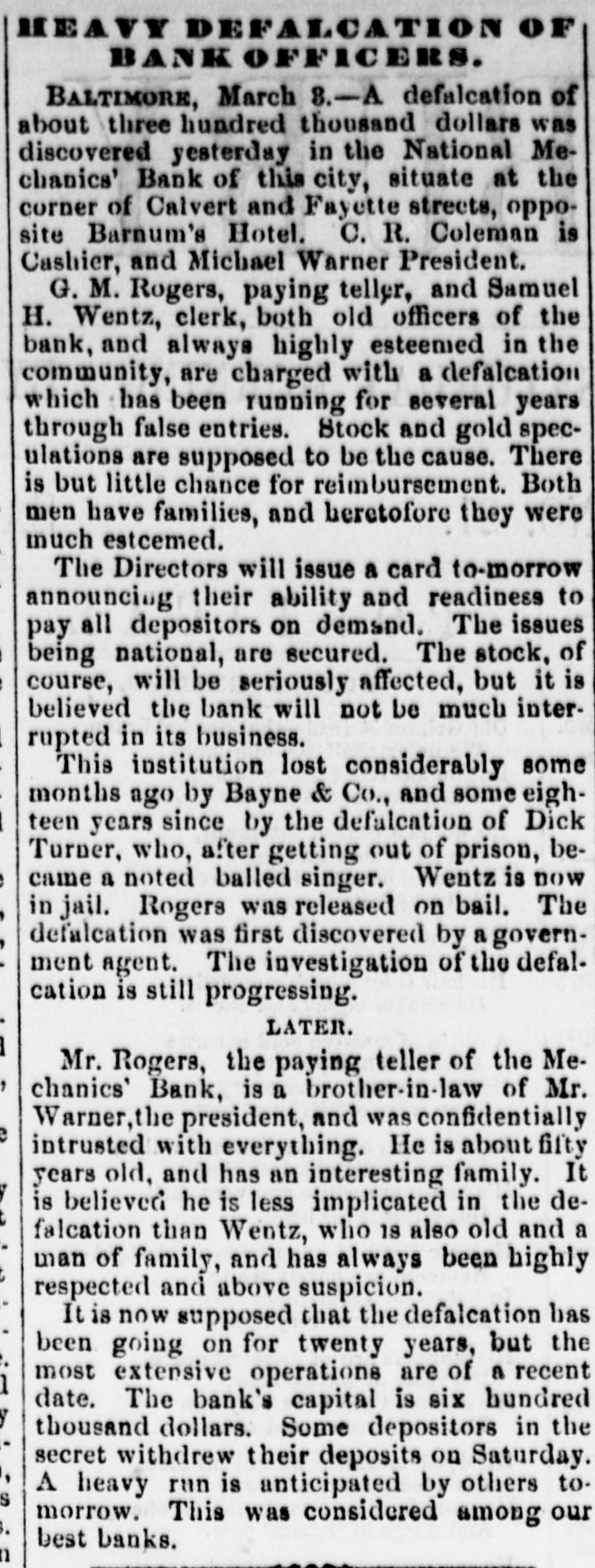 HEAVY DEFALCATION OF BANK OFFICERS. BALTIMORE, March 8.-A defulcation of about three hundred thousand dollars was discovered yesterday in the National Mechanics' Bank of this city, situate at the corner of Calvert and Fayette streets, opposite Barnum's Hotel. C. R. Coleman is Cashier, and Michael Warner President. G. M. Rogers, paying teller, and Samuel H. Wentz, clerk, both old officers of the bank, and always highly esteemed in the community, are charged with a defalcation which has been running for several years through false entries. Stock and gold speculations are supposed to be the cause. There is but little chance for reimbursement. Both men have families, and heretofore they were much estcemed. The Directors will issue a card to-morrow announcing their ability and readiness to pay all depositors on demsnd. The issues being national, are secured. The stock, of course, will be seriously affected, but it is believed the bank will not be much interrupted in its business. This institution lost considerably some months ago by Bayne & Co., and some eighteen years since by the defulcation of Dick Turner, who, after getting out of prison, became a noted balled singer. Wentz is now in jail. Rogers was released on bail. The defulcation was first discovered by a government agent. The investigation of the defalcation is still progressing. LATER. Mr. Rogers, the paying teller of the Mechanics' Bank, is a brother-in-law of Mr. Warner, the president, and was confidentially intrusted with everything. He is about fifty years old, and has an interesting family. It is believed he is less implicated in the defalcation than Wentz, who 18 also old and a man of family, and has always been highly respected and above suspicion. It is now supposed that the defalcation has been going on for twenty years, but the most extensive operations are of a recent date. The bank's capital is six hundred thousand dollars. Some depositors in the secret withdrew their deposits on Saturday. A heavy run is anticipated by others tomorrow. This was considered among our best banks.