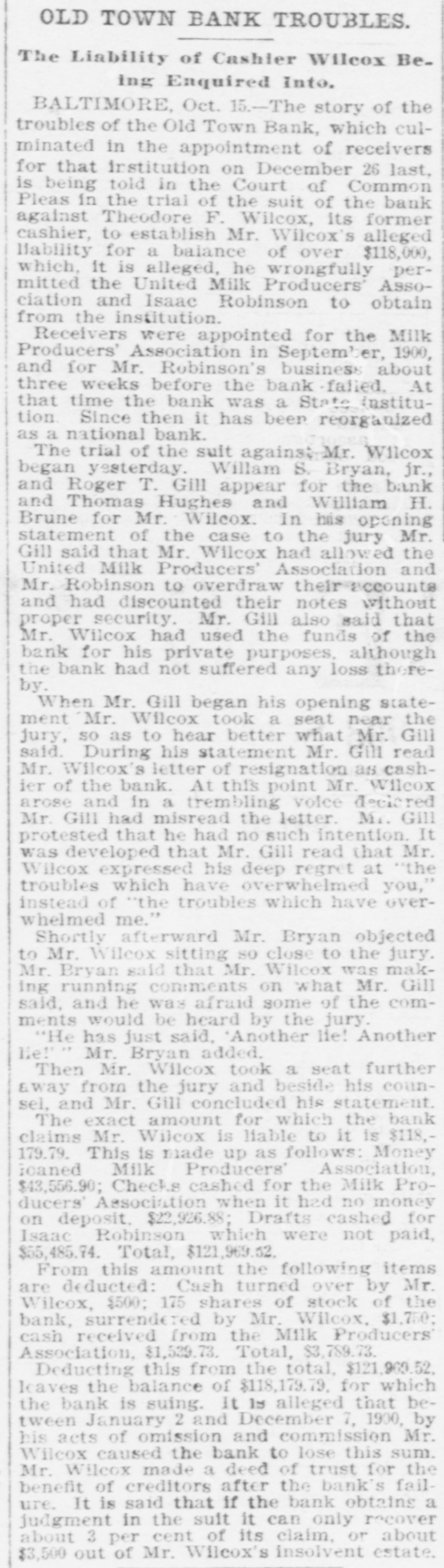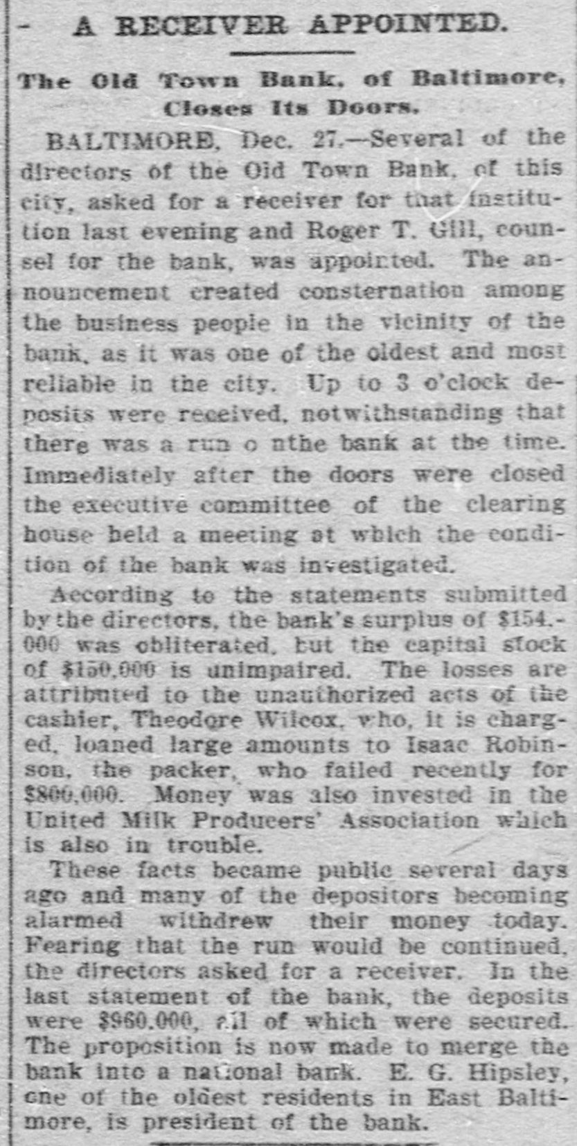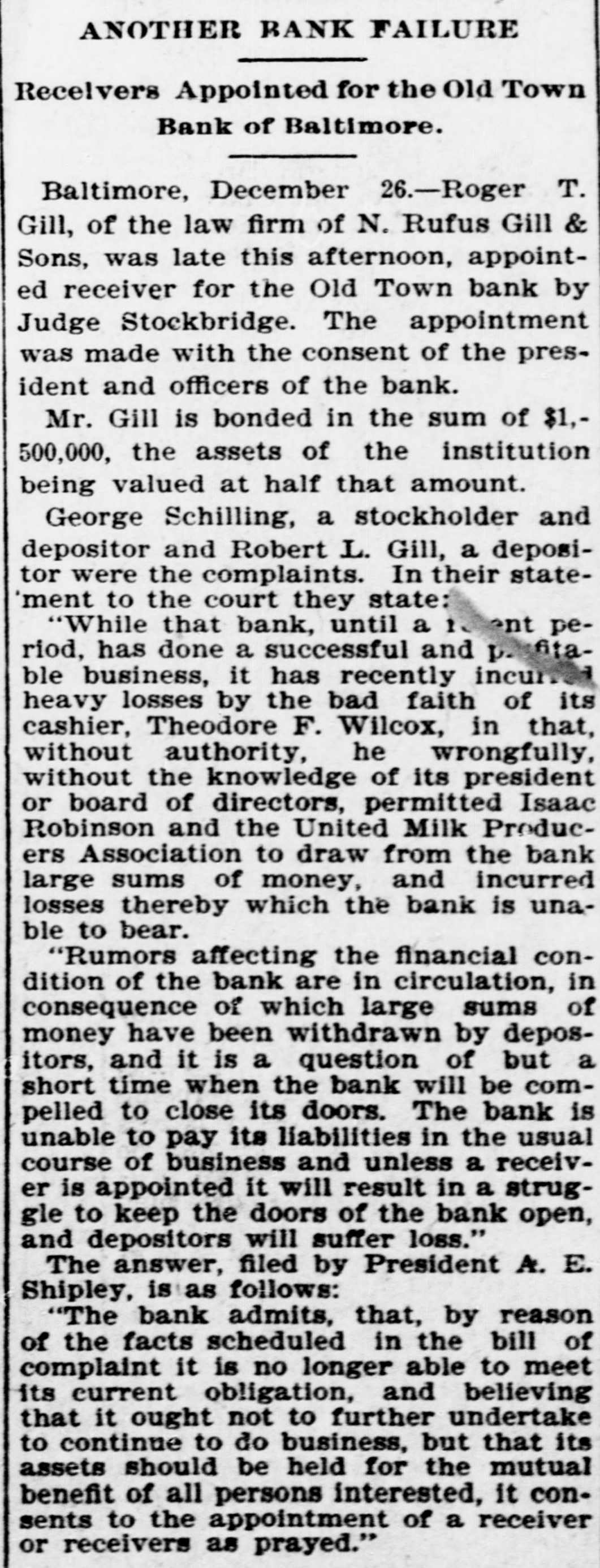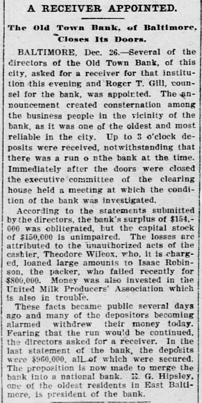 Reported to Have Incurred Heavy Losses by the Recent Failure of Two Business Concerns. RECEIVER'S BOND $1,500,000 ASSETS OF THE BANK SAID TO BE AMPLE TO PAY IN FULL. Admission by President Shipley that Current Obligations Cannot Be Met-Failure of Iron Company. BALTIMORE, Dec. 26.-Roger T. Gill, of the law firm of N. Rufus Gill & Sons, was late this afternoon appointer receiver for the Old Town Bank by Judge Stockbridge. The appointment was made with the consent of the president and officers of the bank. Mr. Gill bonded in the sum of $1,500,000, the assets of the institution being valued at half that amount. George Schilling, a stockholder and depositor, and Robert L. Gill, a depositor, were the complainants. In their statement to the court they said: "While the bank, until a recent period, has, done a successful and profitable business, it has recently incurred heavy losses by the bad faith of its cashier, Theodore F. Wilcox, in that, without authority, he wrongfully, without the knowledge of its president or board of directors, permitted Isaac Robinson and the United Milk Producers' Assoclation to draw from the bank large sums of money, and incurred / losses thereby which the bank is unable to bear. Rumors affecting the financial condition of the bank are in circulation, in consequence of which large sums of money have been withdrawn by depositors, and it is a question of but a short time when the bank will be compelled to close its doors. The bank is unable to pay its liabilities in the usual course of business, and unless a receiver is appointed it will result in a struggle to keep the doors of the bank open, and depositors will suffer loss." The answer, filed by President E. G. Shipley, is as follows: "The bank admits that, by reason of the facts stated in the bill of complaint, it is no longer able to meet its current obligations, and, believing that it cught not to further undertake to continue to do business, but that its assets should be held for the mutual benefit of all persons interested, it consents to the appointment of a receiver or receivers, as prayed." Both the firms mentioned in the bill of complaint are in receivers' hands. The bank was chartered by special act of the Legislature in 1858. Its authorized capital was $150,000. The president is E. G. Hipsley. The condition of the bank at close of business Sept. 5 was as follows: -Resources. -