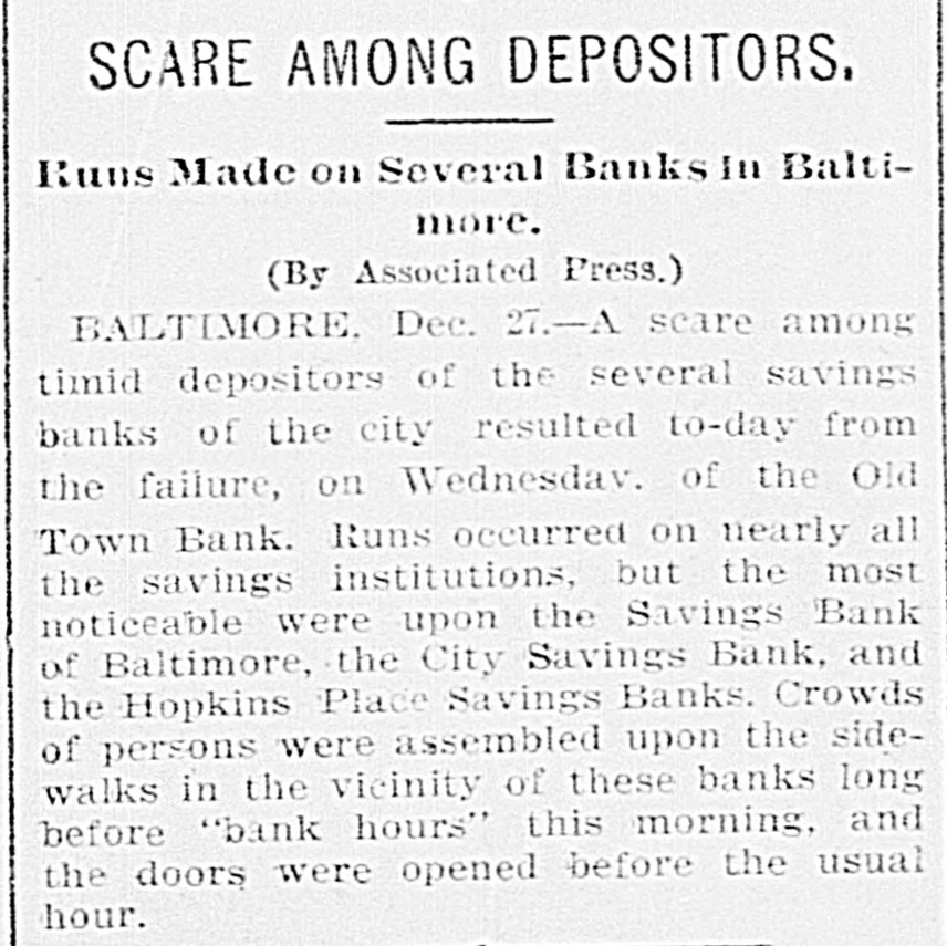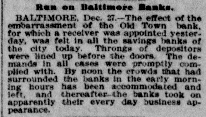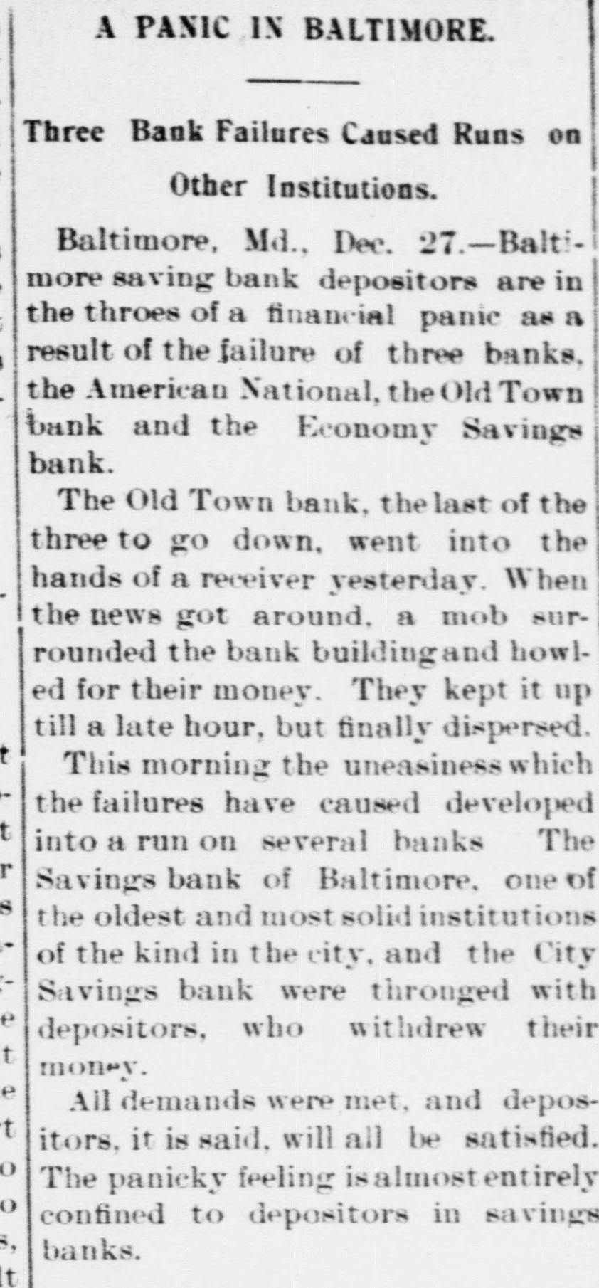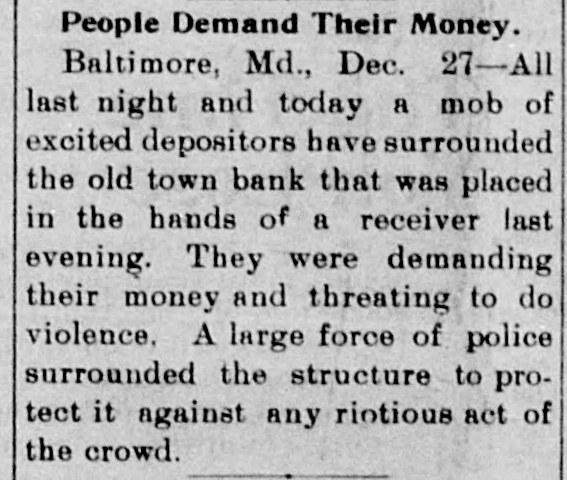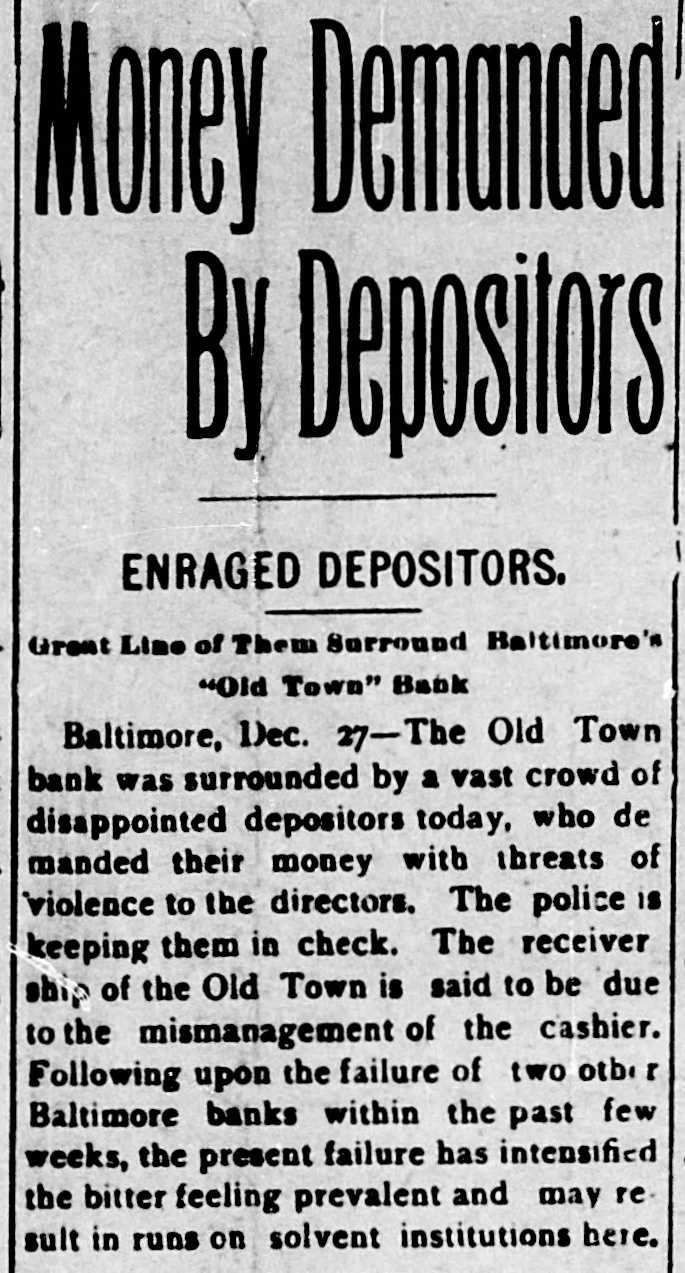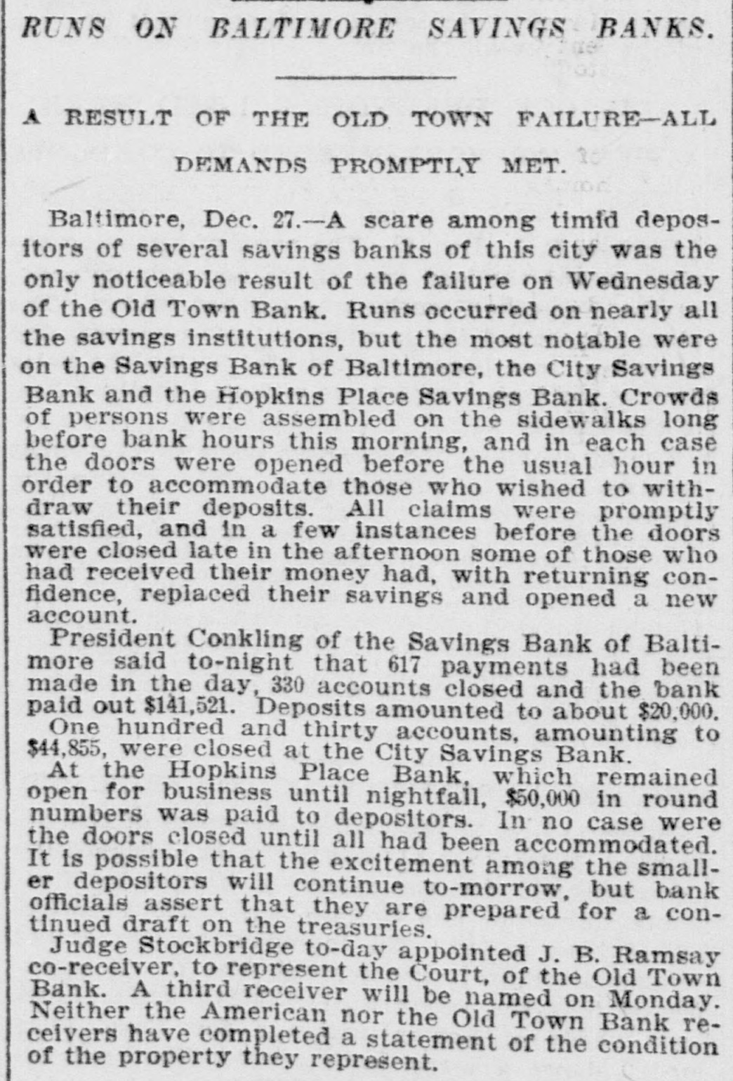 Reported to Have Incurred Heavy Losses by the Recent Failure of Two Business Concerns. RECEIVER'S BOND $1,500,000 ASSETS OF THE BANK SAID TO BE AMPLE TO PAY IN FULL. Admission by President Shipley that Current Obligations Cannot Be Met-Failure of Iron Company. BALTIMORE, Dec. 26.-Roger T. Gill, of the law firm of N. Rufus Gill & Sons, was late this afternoon appointer receiver for the Old Town Bank by Judge Stockbridge. The appointment was made with the consent of the president and officers of the bank. Mr. Gill bonded in the sum of $1,500,000, the assets of the institution being valued at half that amount. George Schilling, a stockholder and depositor, and Robert L. Gill, a depositor, were the complainants. In their statement to the court they said: "While the bank, until a recent period, has, done a successful and profitable business, it has recently incurred heavy losses by the bad faith of its cashier, Theodore F. Wilcox, in that, without authority, he wrongfully, without the knowledge of its president or board of directors, permitted Isaac Robinson and the United Milk Producers' Assoclation to draw from the bank large sums of money, and incurred / losses thereby which the bank is unable to bear. Rumors affecting the financial condition of the bank are in circulation, in consequence of which large sums of money have been withdrawn by depositors, and it is a question of but a short time when the bank will be compelled to close its doors. The bank is unable to pay its liabilities in the usual course of business, and unless a receiver is appointed it will result in a struggle to keep the doors of the bank open, and depositors will suffer loss." The answer, filed by President E. G. Shipley, is as follows: "The bank admits that, by reason of the facts stated in the bill of complaint, it is no longer able to meet its current obligations, and, believing that it cught not to further undertake to continue to do business, but that its assets should be held for the mutual benefit of all persons interested, it consents to the appointment of a receiver or receivers, as prayed." Both the firms mentioned in the bill of complaint are in receivers' hands. The bank was chartered by special act of the Legislature in 1858. Its authorized capital was $150,000. The president is E. G. Hipsley. The condition of the bank at close of business Sept. 5 was as follows: -Resources. -