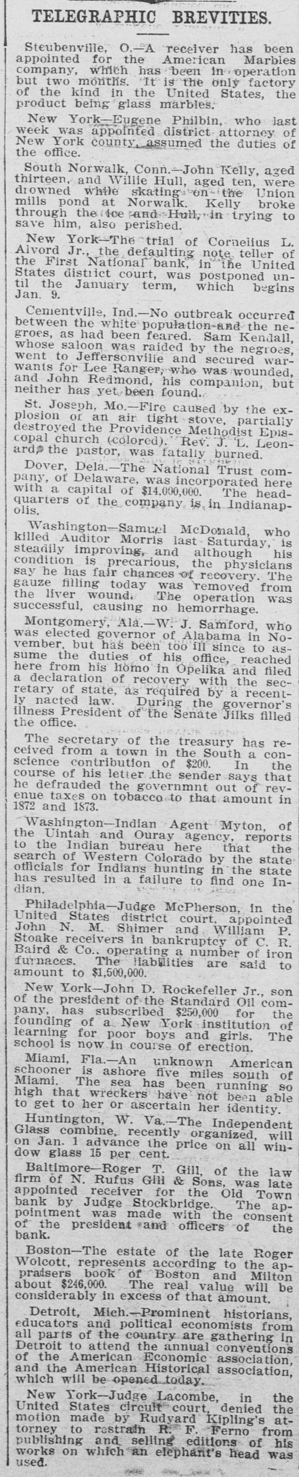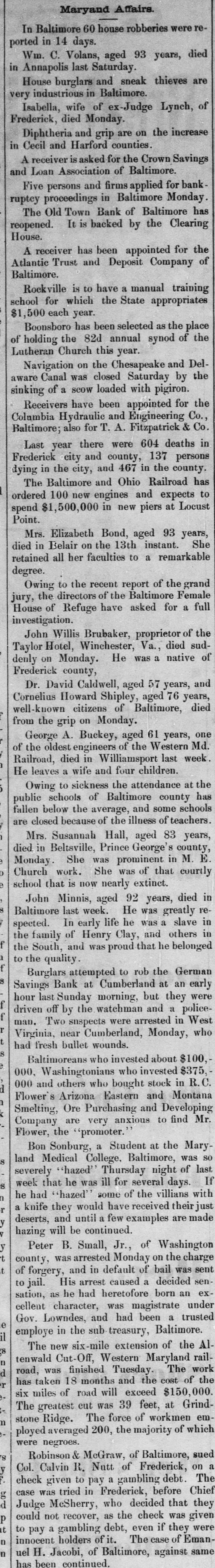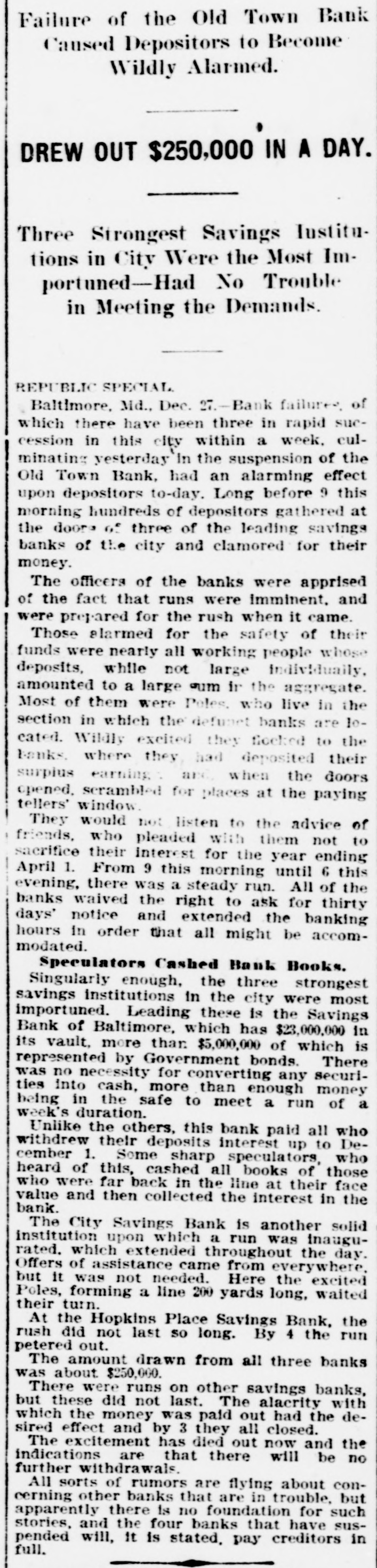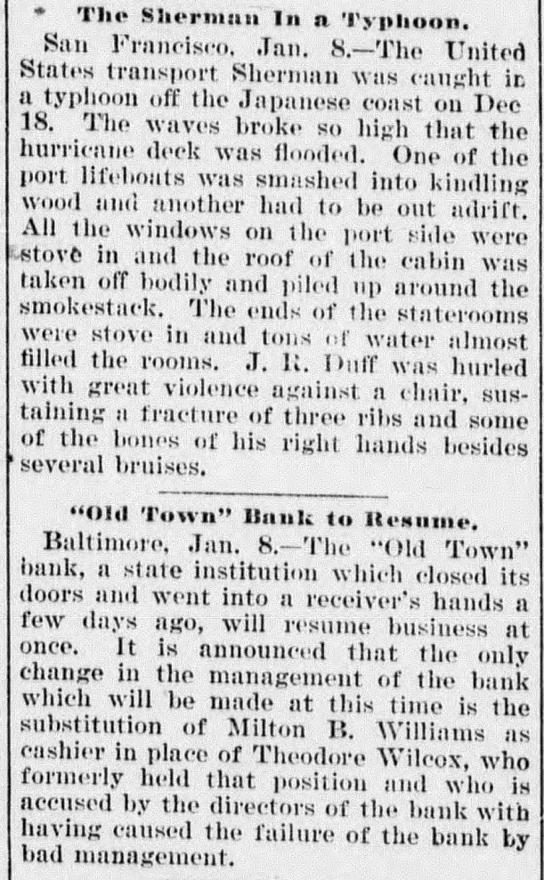 Reported to Have Incurred Heavy Losses by the Recent Failure of Two Business Concerns. RECEIVER'S BOND $1,500,000 ASSETS OF THE BANK SAID TO BE AMPLE TO PAY IN FULL. Admission by President Shipley that Current Obligations Cannot Be Met-Failure of Iron Company. BALTIMORE, Dec. 26.-Roger T. Gill, of the law firm of N. Rufus Gill & Sons, was late this afternoon appointer receiver for the Old Town Bank by Judge Stockbridge. The appointment was made with the consent of the president and officers of the bank. Mr. Gill bonded in the sum of $1,500,000, the assets of the institution being valued at half that amount. George Schilling, a stockholder and depositor, and Robert L. Gill, a depositor, were the complainants. In their statement to the court they said: "While the bank, until a recent period, has, done a successful and profitable business, it has recently incurred heavy losses by the bad faith of its cashier, Theodore F. Wilcox, in that, without authority, he wrongfully, without the knowledge of its president or board of directors, permitted Isaac Robinson and the United Milk Producers' Assoclation to draw from the bank large sums of money, and incurred / losses thereby which the bank is unable to bear. Rumors affecting the financial condition of the bank are in circulation, in consequence of which large sums of money have been withdrawn by depositors, and it is a question of but a short time when the bank will be compelled to close its doors. The bank is unable to pay its liabilities in the usual course of business, and unless a receiver is appointed it will result in a struggle to keep the doors of the bank open, and depositors will suffer loss." The answer, filed by President E. G. Shipley, is as follows: "The bank admits that, by reason of the facts stated in the bill of complaint, it is no longer able to meet its current obligations, and, believing that it cught not to further undertake to continue to do business, but that its assets should be held for the mutual benefit of all persons interested, it consents to the appointment of a receiver or receivers, as prayed." Both the firms mentioned in the bill of complaint are in receivers' hands. The bank was chartered by special act of the Legislature in 1858. Its authorized capital was $150,000. The president is E. G. Hipsley. The condition of the bank at close of business Sept. 5 was as follows: -Resources. -
