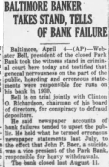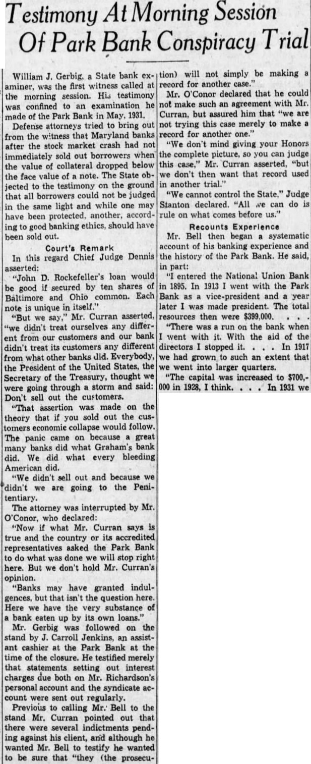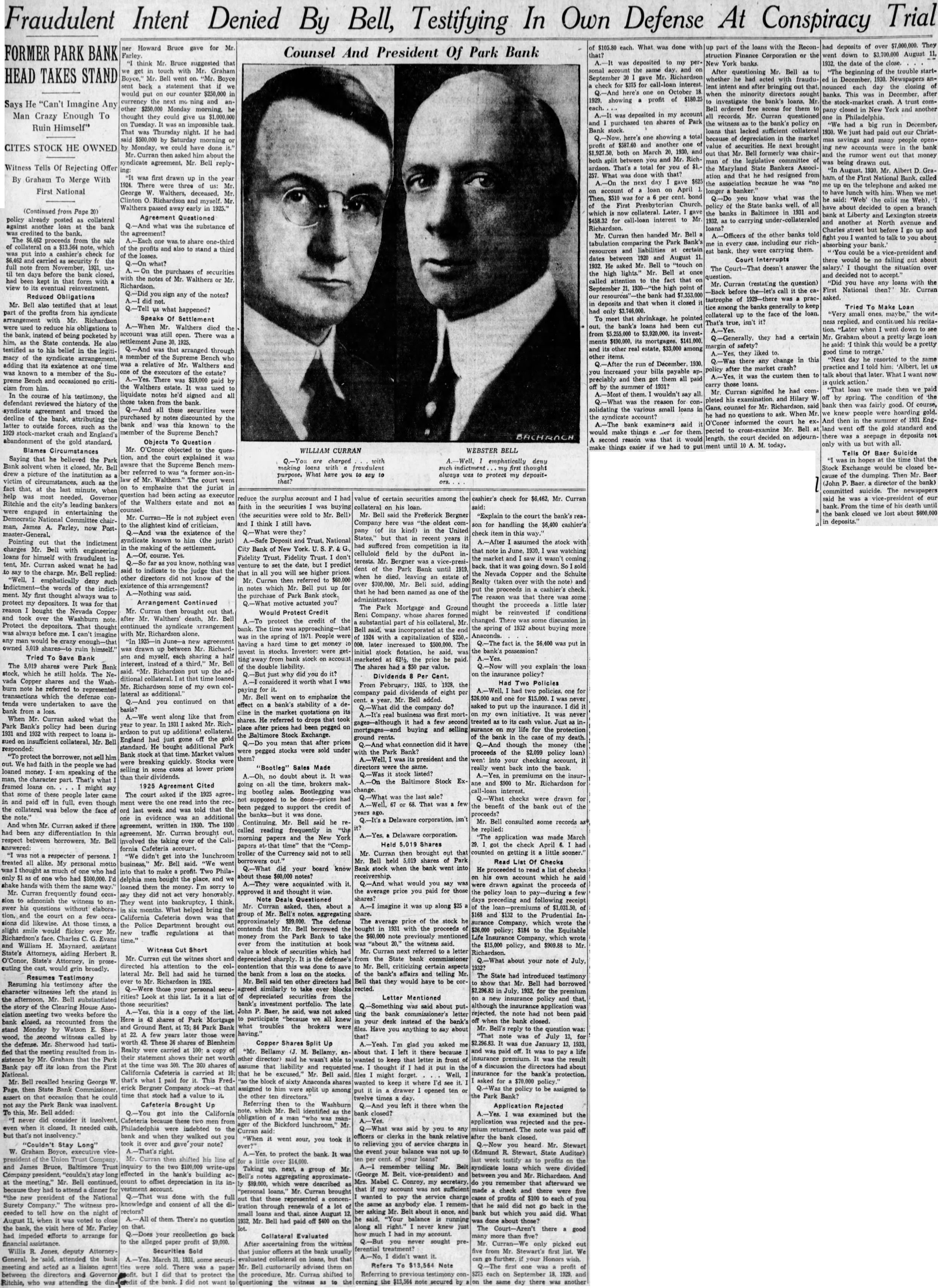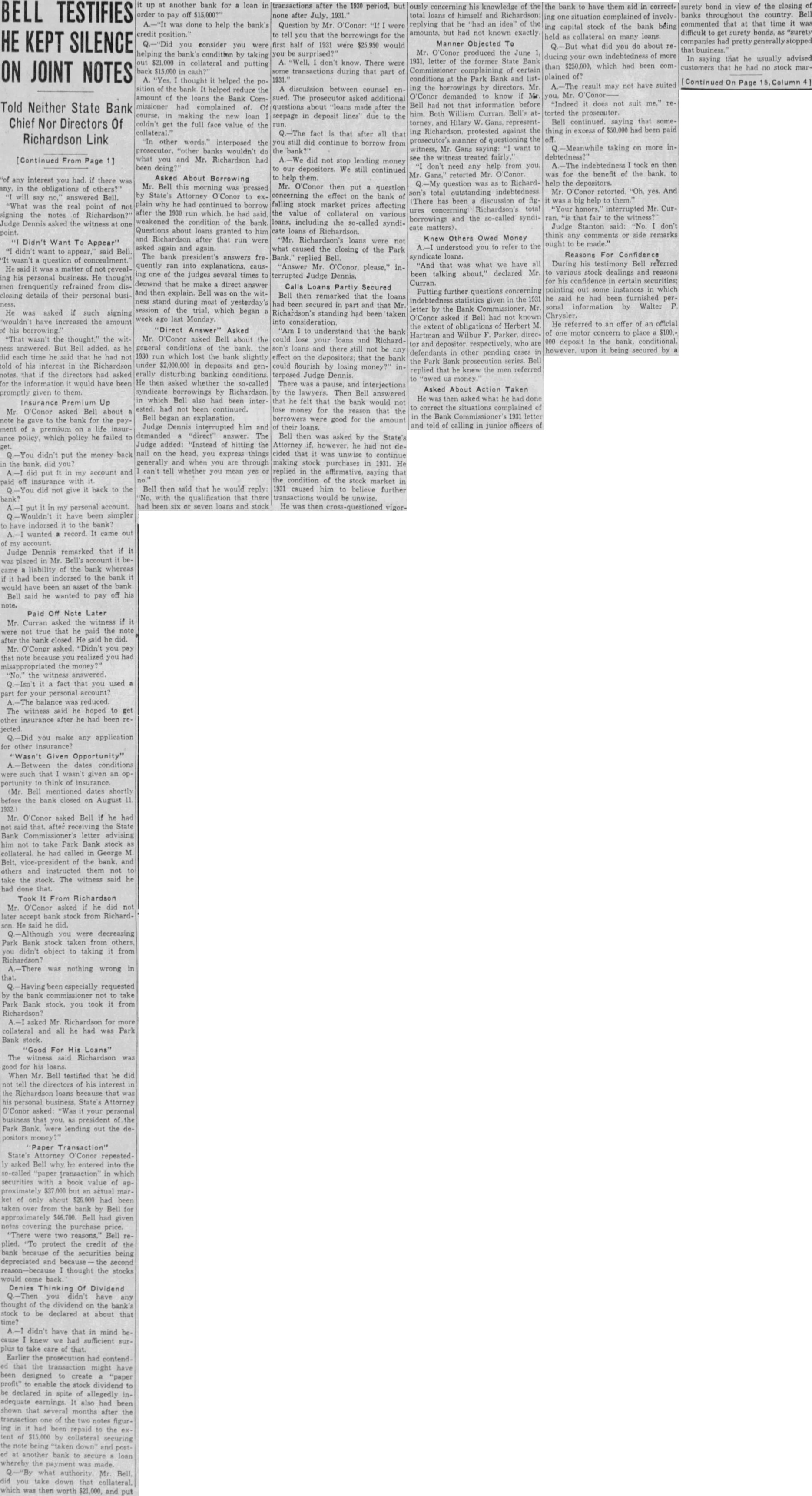Application Rejected was examined but the application rejected and the mium returned. The was paid the bank closed. heard Mr. Stewart (Edmund State Auditor) week testify profits on syndicate loans which divided Mr. And you that afterward we check were five of profits $100 each he said did not but which you did. What about The Court-Aren't there had account. than you never sought Curran-We only picked ferential five from Mr. Stewart's first didn't your Honors wish. Refers To Note profit Referring previous testimony each September 1929. the $13,564 secured the same day there another each. What was done with deposited to my account the and gave Mr. Richardson September check for $375 for call-loan here's October profit of $180.25 showing deposited in my account ten shares of Park purchased here's one showing total another on March 1930, split you and Mr. Richardson. That's total for you 257. What done with that? day $625 the gave loan on April $510 for per which collateral. Later, call-loan interest to Mr. $458.32 for Richardson. then handed Mr. Mr. Curran the Park Bank's tabulation liabilities certain resources dates between 1920 August 11. 1932. He asked Mr. Bell "touch the high lights." Mr. Bell once called attention the fact that September point bank deposits and that when closed had only $3,746,000. that shrinkage, he pointed the loans had cut from to $3,920,000. its invest$490,000. its mortgages, and its estate, $33,000 among items. run of December, increased your bills payable preciably then got them all paid summer them. wouldn't say the reason for solidating the various small loans the syndicate account? examiners said would make things for them. second reason was that make things easier if we had to part of the loans with the Reconstruction Finance Corporation or New York After questioning Mr. Bell as whether acted fraudulent intent and bringing out when the minority directors investigate the bank's loans, Mr Bell ordered free access for them all Mr. Curran questioned the witness the bank's policy loans that lacked collateral depreciation in the market value of He brought that Mr. Bell formerly was chairman of the the State Bankers Associand that he had resigned the because he was longer banker. what was the you policy the the banks in Baltimore in 1931 carrying of the other banks told including richin every they were carrying them. Court Interrupts doesn't answer the The Mr. Curran (restating the question) before the-let's call the catastrophe 1929-there pracamong the banks generally the of the loan. collateral That's true, isn't they had certain safety? they liked there change in this any policy after the crash? the custom then those signified he had comMr. Curran pleted his Hilary for Mr. said Gans, counsel ask. When Mr. he questions O'Conor informed the court he Mr. Bell pected cross-examine the court decided adjournlength, until today. of $7,000,000. They had deposits over went down $3,700,000 August the date of the close. beginning of the trouble startDecember, 1930. Newspapers announced closing banks. This in December, after the crash. trust closed New York and another big in December, 1930. had out our Christsavings many people ing new were the bank the rumor went out that money being drawn out. Mr. Albert GraFirst National Bank, called me up the telephone asked with him met he said: 'Web' (he calis me have about decided to open branch bank Liberty Lexington streets and another North avenue and Charles street but before fight wanted talk your could vice-president and there would no falling about salary.' thought the situation decided not "Did have loans with the any First National then? Mr. Curran asked.