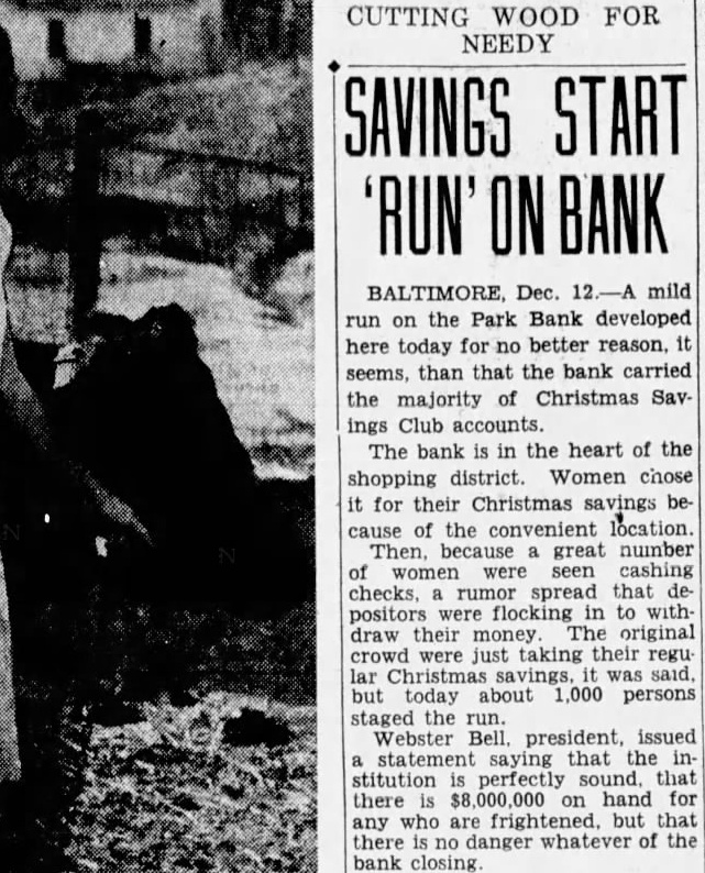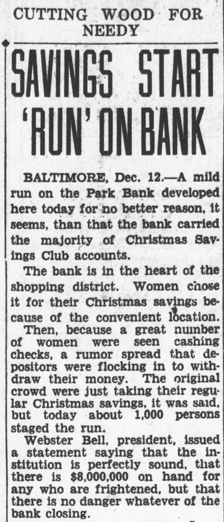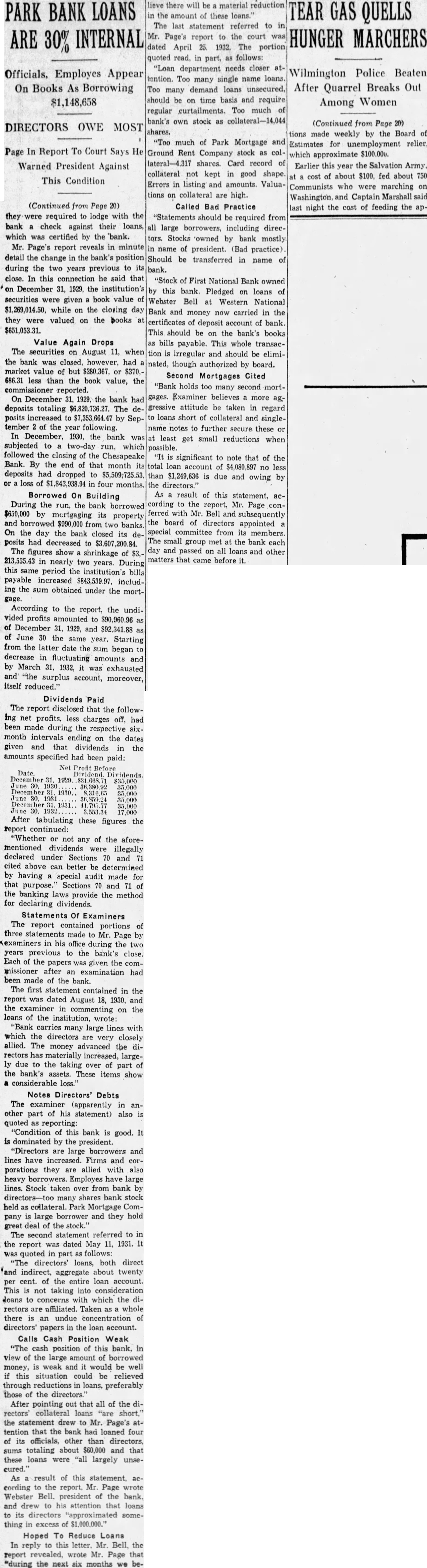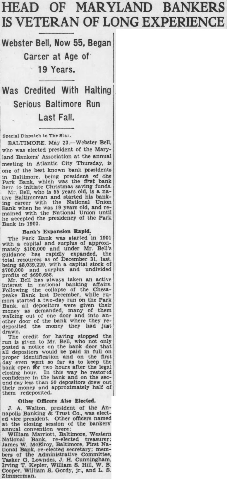 Application Rejected was examined but the application rejected and the mium returned. The was paid the bank closed. heard Mr. Stewart (Edmund State Auditor) week testify profits on syndicate loans which divided Mr. And you that afterward we check were five of profits $100 each he said did not but which you did. What about The Court-Aren't there had account. than you never sought Curran-We only picked ferential five from Mr. Stewart's first didn't your Honors wish. Refers To Note profit Referring previous testimony each September 1929. the $13,564 secured the same day there another each. What was done with deposited to my account the and gave Mr. Richardson September check for $375 for call-loan here's October profit of $180.25 showing deposited in my account ten shares of Park purchased here's one showing total another on March 1930, split you and Mr. Richardson. That's total for you 257. What done with that? day $625 the gave loan on April $510 for per which collateral. Later, call-loan interest to Mr. $458.32 for Richardson. then handed Mr. Mr. Curran the Park Bank's tabulation liabilities certain resources dates between 1920 August 11. 1932. He asked Mr. Bell "touch the high lights." Mr. Bell once called attention the fact that September point bank deposits and that when closed had only $3,746,000. that shrinkage, he pointed the loans had cut from to $3,920,000. its invest$490,000. its mortgages, and its estate, $33,000 among items. run of December, increased your bills payable preciably then got them all paid summer them. wouldn't say the reason for solidating the various small loans the syndicate account? examiners said would make things for them. second reason was that make things easier if we had to part of the loans with the Reconstruction Finance Corporation or New York After questioning Mr. Bell as whether acted fraudulent intent and bringing out when the minority directors investigate the bank's loans, Mr Bell ordered free access for them all Mr. Curran questioned the witness the bank's policy loans that lacked collateral depreciation in the market value of He brought that Mr. Bell formerly was chairman of the the State Bankers Associand that he had resigned the because he was longer banker. what was the you policy the the banks in Baltimore in 1931 carrying of the other banks told including richin every they were carrying them. Court Interrupts doesn't answer the The Mr. Curran (restating the question) before the-let's call the catastrophe 1929-there pracamong the banks generally the of the loan. collateral That's true, isn't they had certain safety? they liked there change in this any policy after the crash? the custom then those signified he had comMr. Curran pleted his Hilary for Mr. said Gans, counsel ask. When Mr. he questions O'Conor informed the court he Mr. Bell pected cross-examine the court decided adjournlength, until today. of $7,000,000. They had deposits over went down $3,700,000 August the date of the close. beginning of the trouble startDecember, 1930. Newspapers announced closing banks. This in December, after the crash. trust closed New York and another big in December, 1930. had out our Christsavings many people ing new were the bank the rumor went out that money being drawn out. Mr. Albert GraFirst National Bank, called me up the telephone asked with him met he said: 'Web' (he calis me have about decided to open branch bank Liberty Lexington streets and another North avenue and Charles street but before fight wanted talk your could vice-president and there would no falling about salary.' thought the situation decided not "Did have loans with the any First National then? Mr. Curran asked.