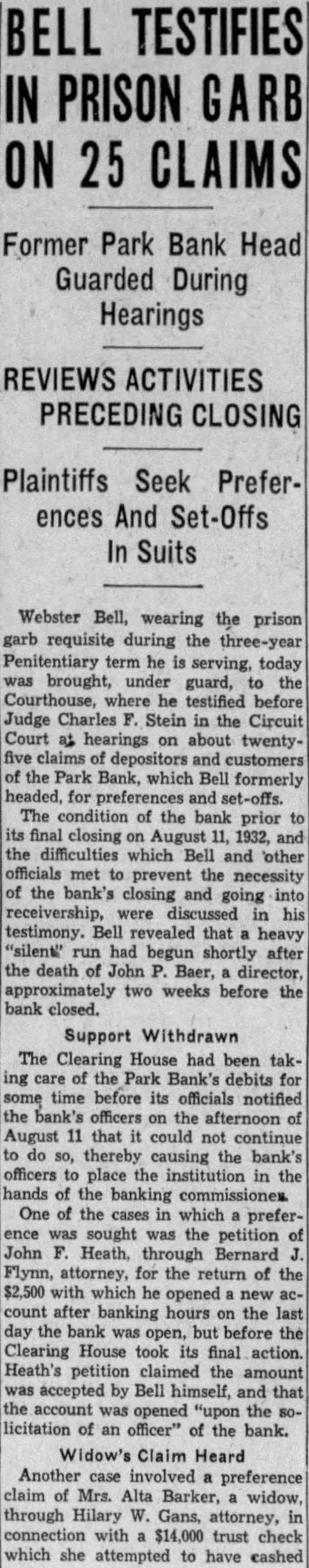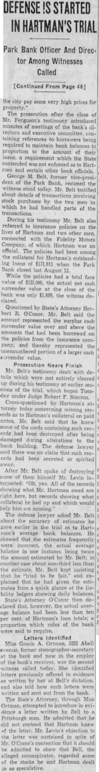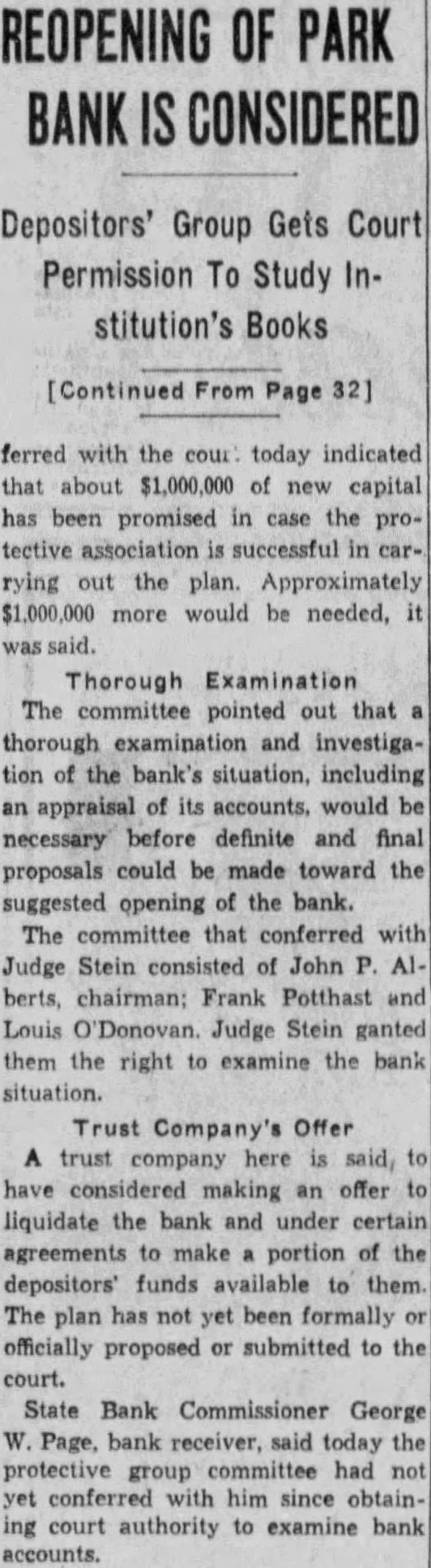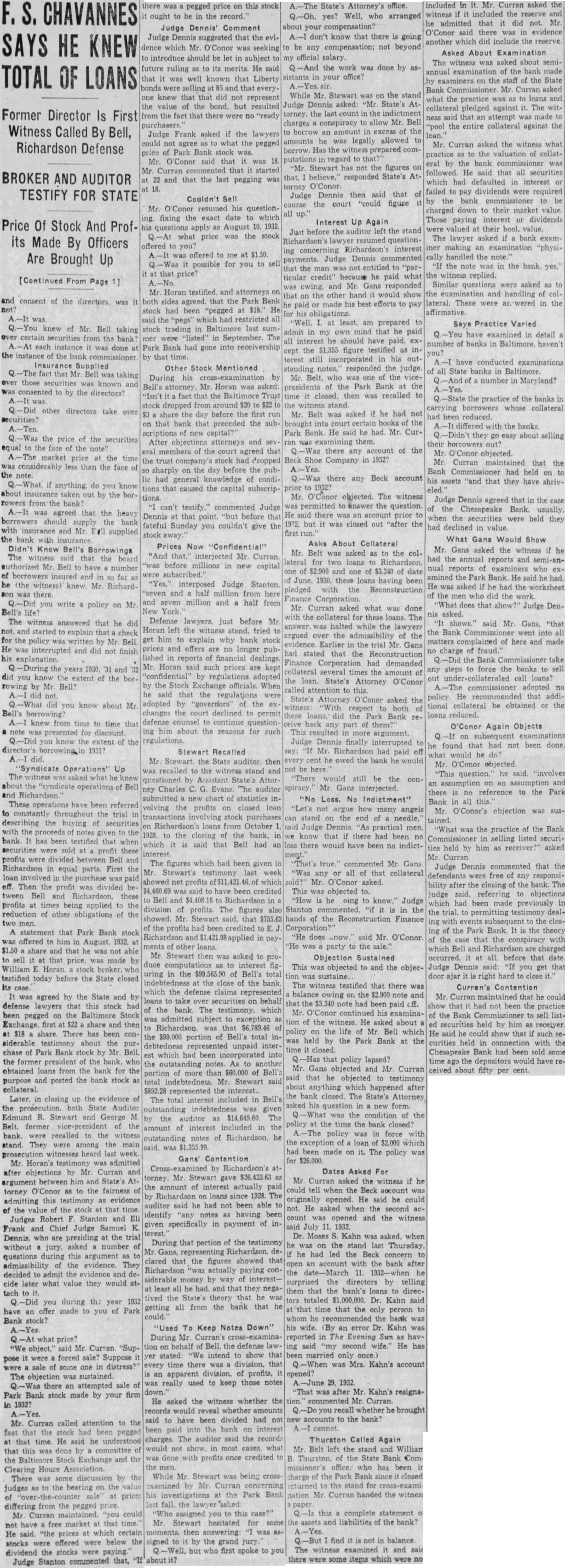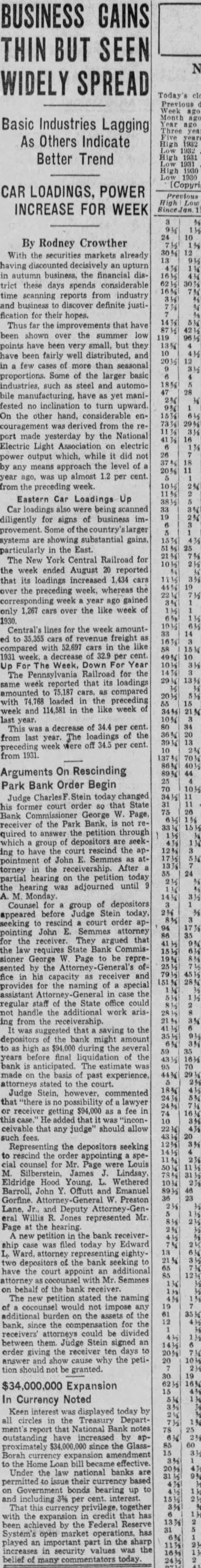 BUSINESS GAINS THIN BUT SEEN WIDELY SPREAD Basic Industries Lagging As Others Indicate Better Trend CAR LOADINGS, POWER INCREASE FOR WEEK By Rodney Crowther With the securities markets already having discounted decisively an upturn in autumn business, the financial district these days spends considerable time scanning reports from industry and business to discover definite justification for their hopes. Thus far the improvements that have been shown over the summer low points have been very small, but they have been fairly well distributed, and in few cases of more than seasonal proportions. Some of the larger basic industries, such as steel and automobile manufacturing, have as yet manifested no inclination to turn upward. On the other hand, considerable encouragement was derived from the report made yesterday by the National Electric Light Association on electric power output which, while it did not by any means approach the level of year ago, was up almost 1.2 per cent. from the preceding week. Eastern Car Loadings Up Car loadings also were being diligently for signs of business improvement. Some f the country' larger systems are showing substantial gains, particularly in the East. The New York Central Railroad for the week ended August 20 reported that its loadings increased 1,434 cars over the preceding week, whereas the corresponding week year ago gained only 1,267 cars over the like week of Central's lines for the week amounted to 35,355 cars of revenue freight as compared with 52,697 cars in the like 1931 week, decrease of 32.9 per cent. Up For The Week, Down For Year The Pennsylvania Railroad for the same week reported that its loadings amounted to 75,187 cars, as compared with 74,768 loaded in the preceding week and 114,581 in the like week of last year. This was decrease of 34.4 per cent. from last year. The loadings of the preceding week were off 34.5 per cent from 1931. Arguments On Rescinding Park Bank Order Begin Judge CharlesF Stein today changed his former court order SQ that State Bank George W. Page, receiver of the Park Bank, is not required to answer the petition through which group of depositors are seeking to have the court rescind the appointment of John E. Semmes as attorney in the After partial hearing on the petition today the hearing was adjourned until 9 A. M. Monday. Counsel for group of depositors appeared before Judge Stein today, seeking to rescind a court order appointing John E. Semmes attorney for the receiver. They argued that the law requires State Bank Commissioner George W. Page to be represented by the Attorney General's office in his capacity as receiver and provides for the naming of special assistant Attorney-General in case the regular staff of the State office could not handle the additional work arising from the receivership. was suggested that saving to the depositors of the bank might amount to as high as $94,000 during the several years before final liquidation of the bank is anticipated. The estimate was made on the basis of past experience, attorneys stated to the court Judge Stein, however, commented that "there possibility of lawyer or receiver getting $94,000 as fee in this case. He added that it was "inconceivable that any judge" should allow such fees. Representing the depositors seeking to rescind the order appointing special counsel for Mr. Page were Louis M. Silberstein, James J. Lindsay. Eldridge Hood Young, L. Wethered Barroll, John Y. Offutt and Emanuel Gorfine. General W. Preston Lane, Jr., and Deputy Attorney -General Willis R. Jones represented Mr Page at the hearing A new petition in the bank receivership case was filed today by Edward L. Ward. attorney representing eightytwo depositors of the bank seeking to have the court appoint an additional attorney as cocounsel with Mr. Semmes on behalf of the bank receiver. The new petition stated the naming of cocounsel would not impose any additional burden on the assets of the bank, since the for the receivers' could be divided between them. Judge Stein signed an order giving the receiver ten days to answer and show cause why the petition should not be granted. $34,000,000 Expansion In Currency Noted Keen interest was displayed today by all circles in the Treasury Department's report that National Bank notes outstanding have increased by approximately $34,000,000 since the Glass- 85 Borah curren endment 15 to the Home Loan bill became effective. Under the law national banks are permitted to issue their currency based on Government bonds bearing up to and including 3% per cent. interest. That this currency privilege, together 3% with the expansion in credit that has 13% been achieved by the Federal Reserve 31 System's open market operations. has played an important part in the sharp increases in security values was the belief of many today