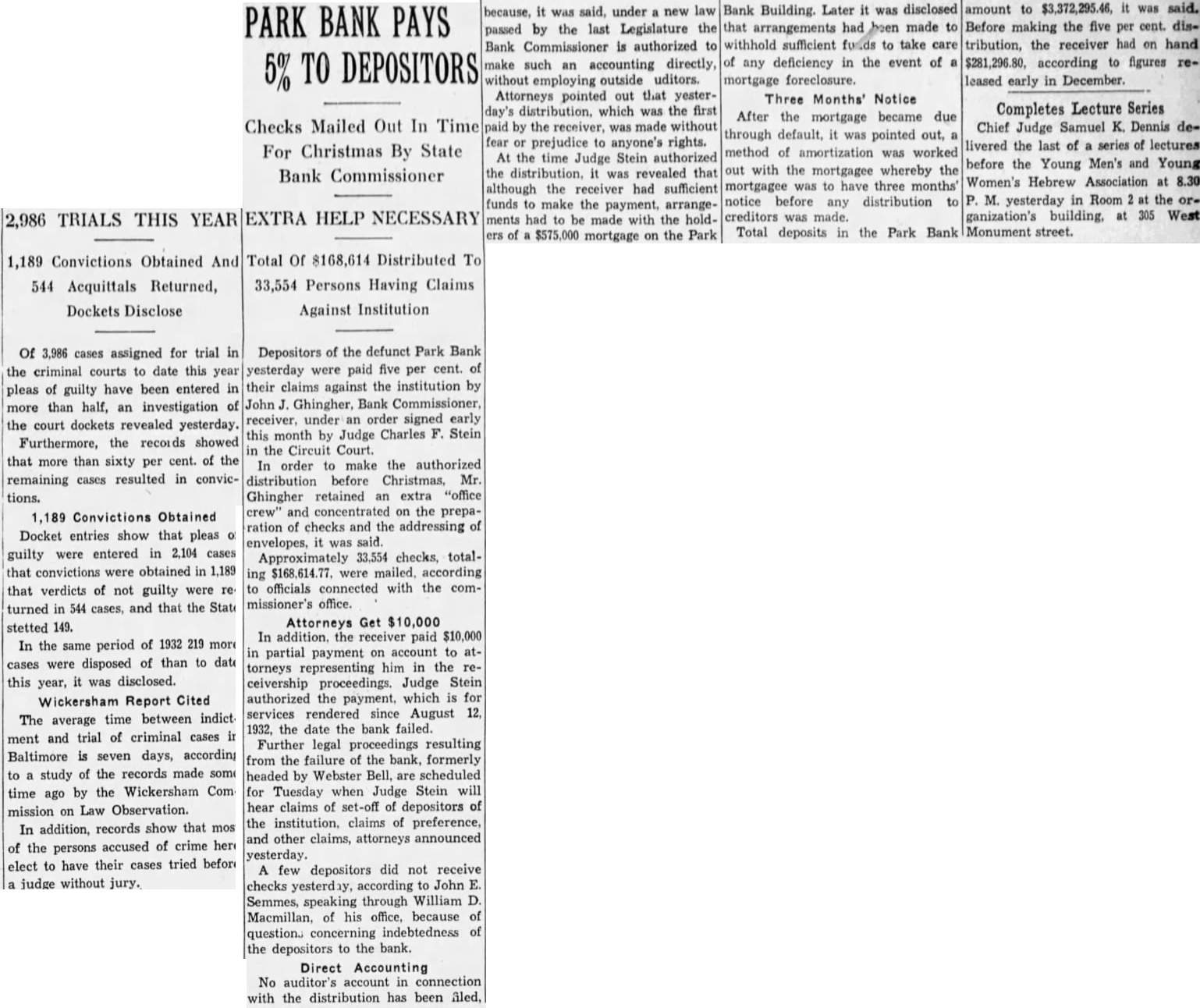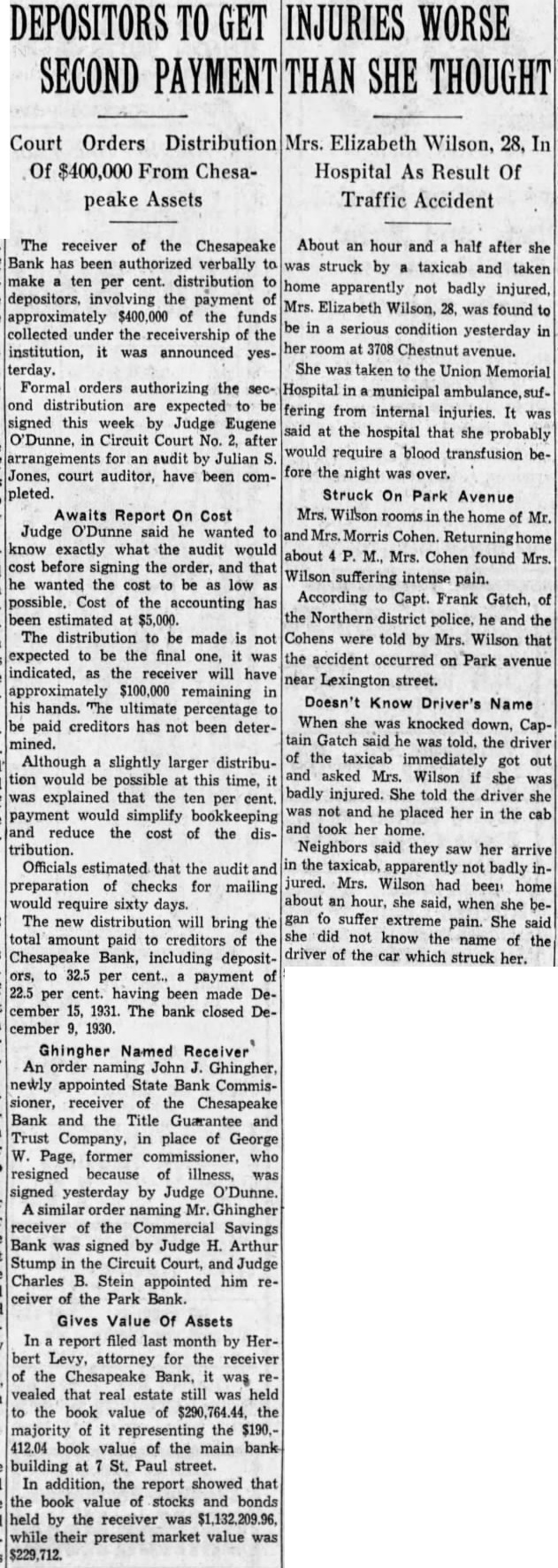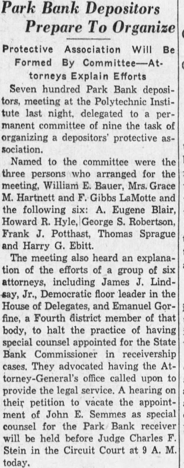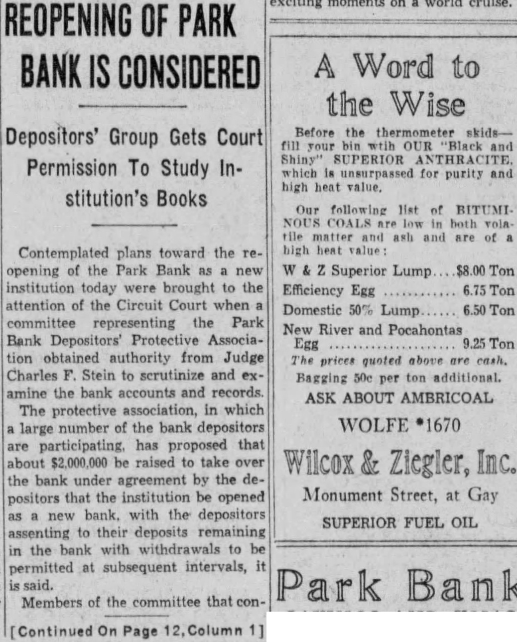 BUSINESS GAINS THIN BUT SEEN WIDELY SPREAD Basic Industries Lagging As Others Indicate Better Trend CAR LOADINGS, POWER INCREASE FOR WEEK By Rodney Crowther With the securities markets already having discounted decisively an upturn in autumn business, the financial district these days spends considerable time scanning reports from industry and business to discover definite justification for their hopes. Thus far the improvements that have been shown over the summer low points have been very small, but they have been fairly well distributed, and in few cases of more than seasonal proportions. Some of the larger basic industries, such as steel and automobile manufacturing, have as yet manifested no inclination to turn upward. On the other hand, considerable encouragement was derived from the report made yesterday by the National Electric Light Association on electric power output which, while it did not by any means approach the level of year ago, was up almost 1.2 per cent. from the preceding week. Eastern Car Loadings Up Car loadings also were being diligently for signs of business improvement. Some f the country' larger systems are showing substantial gains, particularly in the East. The New York Central Railroad for the week ended August 20 reported that its loadings increased 1,434 cars over the preceding week, whereas the corresponding week year ago gained only 1,267 cars over the like week of Central's lines for the week amounted to 35,355 cars of revenue freight as compared with 52,697 cars in the like 1931 week, decrease of 32.9 per cent. Up For The Week, Down For Year The Pennsylvania Railroad for the same week reported that its loadings amounted to 75,187 cars, as compared with 74,768 loaded in the preceding week and 114,581 in the like week of last year. This was decrease of 34.4 per cent. from last year. The loadings of the preceding week were off 34.5 per cent from 1931. Arguments On Rescinding Park Bank Order Begin Judge CharlesF Stein today changed his former court order SQ that State Bank George W. Page, receiver of the Park Bank, is not required to answer the petition through which group of depositors are seeking to have the court rescind the appointment of John E. Semmes as attorney in the After partial hearing on the petition today the hearing was adjourned until 9 A. M. Monday. Counsel for group of depositors appeared before Judge Stein today, seeking to rescind a court order appointing John E. Semmes attorney for the receiver. They argued that the law requires State Bank Commissioner George W. Page to be represented by the Attorney General's office in his capacity as receiver and provides for the naming of special assistant Attorney-General in case the regular staff of the State office could not handle the additional work arising from the receivership. was suggested that saving to the depositors of the bank might amount to as high as $94,000 during the several years before final liquidation of the bank is anticipated. The estimate was made on the basis of past experience, attorneys stated to the court Judge Stein, however, commented that "there possibility of lawyer or receiver getting $94,000 as fee in this case. He added that it was "inconceivable that any judge" should allow such fees. Representing the depositors seeking to rescind the order appointing special counsel for Mr. Page were Louis M. Silberstein, James J. Lindsay. Eldridge Hood Young, L. Wethered Barroll, John Y. Offutt and Emanuel Gorfine. General W. Preston Lane, Jr., and Deputy Attorney -General Willis R. Jones represented Mr Page at the hearing A new petition in the bank receivership case was filed today by Edward L. Ward. attorney representing eightytwo depositors of the bank seeking to have the court appoint an additional attorney as cocounsel with Mr. Semmes on behalf of the bank receiver. The new petition stated the naming of cocounsel would not impose any additional burden on the assets of the bank, since the for the receivers' could be divided between them. Judge Stein signed an order giving the receiver ten days to answer and show cause why the petition should not be granted. $34,000,000 Expansion In Currency Noted Keen interest was displayed today by all circles in the Treasury Department's report that National Bank notes outstanding have increased by approximately $34,000,000 since the Glass- 85 Borah curren endment 15 to the Home Loan bill became effective. Under the law national banks are permitted to issue their currency based on Government bonds bearing up to and including 3% per cent. interest. That this currency privilege, together 3% with the expansion in credit that has 13% been achieved by the Federal Reserve 31 System's open market operations. has played an important part in the sharp increases in security values was the belief of many today