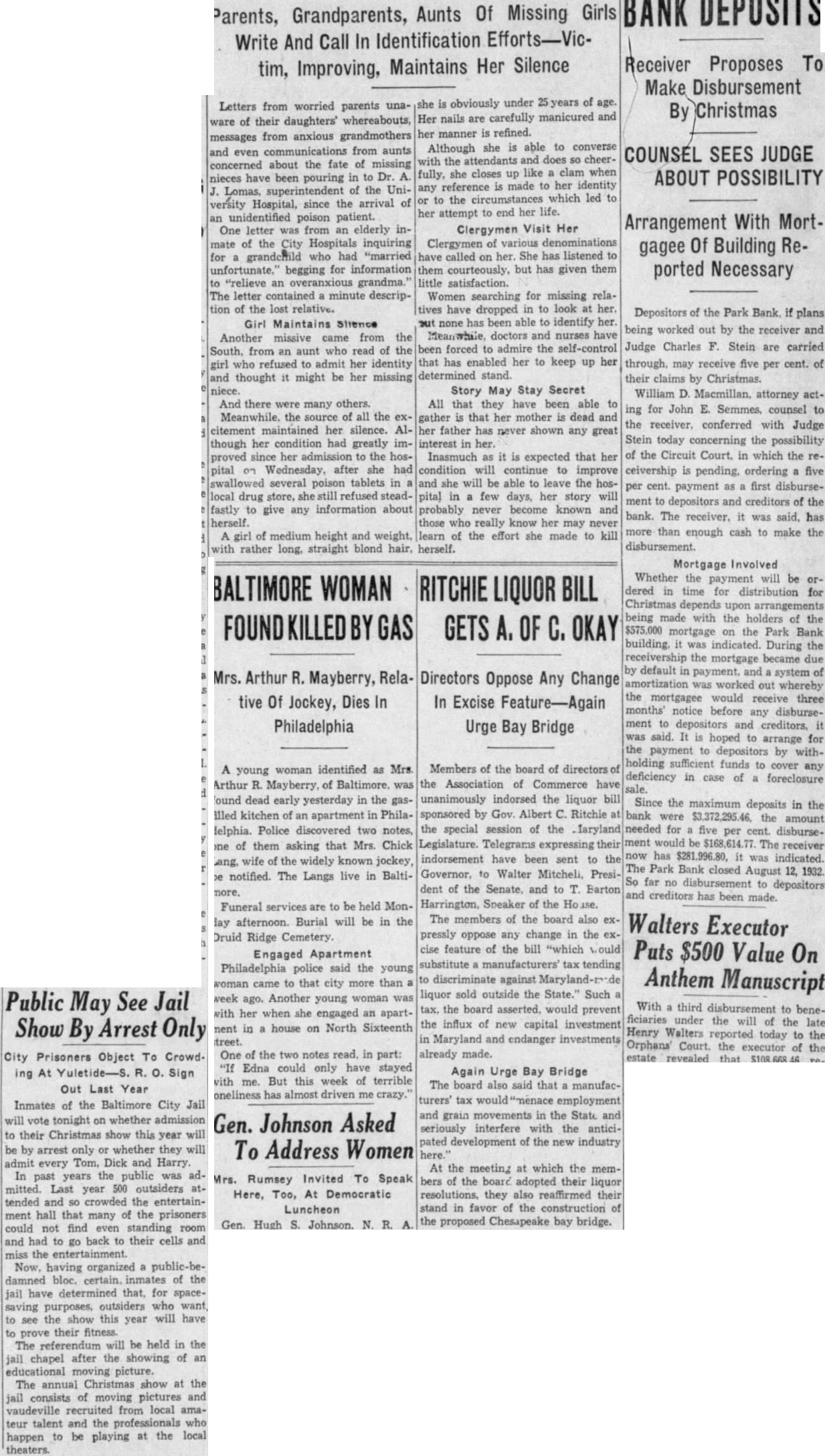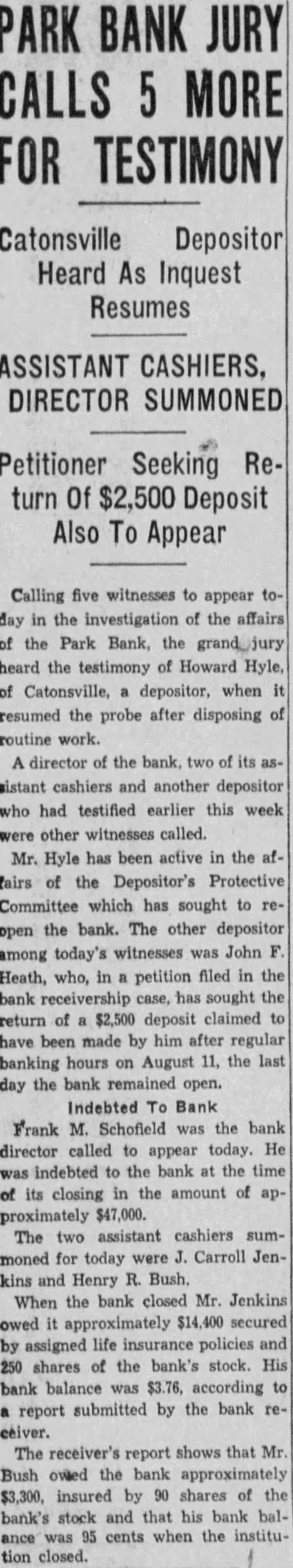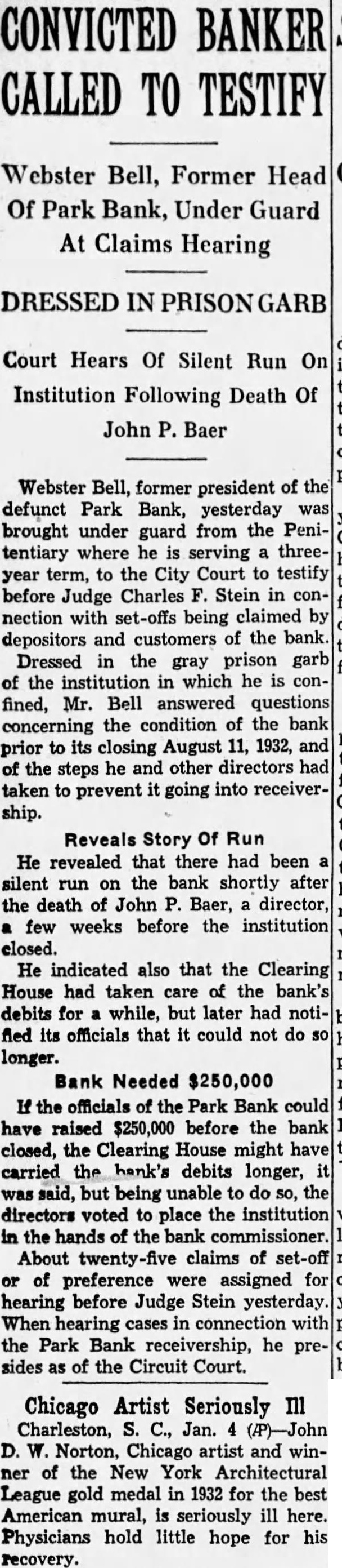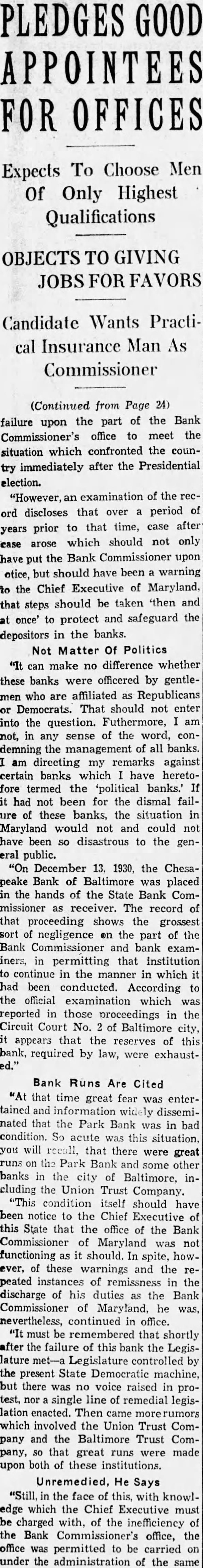 BUSINESS GAINS THIN BUT SEEN WIDELY SPREAD Basic Industries Lagging As Others Indicate Better Trend CAR LOADINGS, POWER INCREASE FOR WEEK By Rodney Crowther With the securities markets already having discounted decisively an upturn in autumn business, the financial district these days spends considerable time scanning reports from industry and business to discover definite justification for their hopes. Thus far the improvements that have been shown over the summer low points have been very small, but they have been fairly well distributed, and in few cases of more than seasonal proportions. Some of the larger basic industries, such as steel and automobile manufacturing, have as yet manifested no inclination to turn upward. On the other hand, considerable encouragement was derived from the report made yesterday by the National Electric Light Association on electric power output which, while it did not by any means approach the level of year ago, was up almost 1.2 per cent. from the preceding week. Eastern Car Loadings Up Car loadings also were being diligently for signs of business improvement. Some f the country' larger systems are showing substantial gains, particularly in the East. The New York Central Railroad for the week ended August 20 reported that its loadings increased 1,434 cars over the preceding week, whereas the corresponding week year ago gained only 1,267 cars over the like week of Central's lines for the week amounted to 35,355 cars of revenue freight as compared with 52,697 cars in the like 1931 week, decrease of 32.9 per cent. Up For The Week, Down For Year The Pennsylvania Railroad for the same week reported that its loadings amounted to 75,187 cars, as compared with 74,768 loaded in the preceding week and 114,581 in the like week of last year. This was decrease of 34.4 per cent. from last year. The loadings of the preceding week were off 34.5 per cent from 1931. Arguments On Rescinding Park Bank Order Begin Judge CharlesF Stein today changed his former court order SQ that State Bank George W. Page, receiver of the Park Bank, is not required to answer the petition through which group of depositors are seeking to have the court rescind the appointment of John E. Semmes as attorney in the After partial hearing on the petition today the hearing was adjourned until 9 A. M. Monday. Counsel for group of depositors appeared before Judge Stein today, seeking to rescind a court order appointing John E. Semmes attorney for the receiver. They argued that the law requires State Bank Commissioner George W. Page to be represented by the Attorney General's office in his capacity as receiver and provides for the naming of special assistant Attorney-General in case the regular staff of the State office could not handle the additional work arising from the receivership. was suggested that saving to the depositors of the bank might amount to as high as $94,000 during the several years before final liquidation of the bank is anticipated. The estimate was made on the basis of past experience, attorneys stated to the court Judge Stein, however, commented that "there possibility of lawyer or receiver getting $94,000 as fee in this case. He added that it was "inconceivable that any judge" should allow such fees. Representing the depositors seeking to rescind the order appointing special counsel for Mr. Page were Louis M. Silberstein, James J. Lindsay. Eldridge Hood Young, L. Wethered Barroll, John Y. Offutt and Emanuel Gorfine. General W. Preston Lane, Jr., and Deputy Attorney -General Willis R. Jones represented Mr Page at the hearing A new petition in the bank receivership case was filed today by Edward L. Ward. attorney representing eightytwo depositors of the bank seeking to have the court appoint an additional attorney as cocounsel with Mr. Semmes on behalf of the bank receiver. The new petition stated the naming of cocounsel would not impose any additional burden on the assets of the bank, since the for the receivers' could be divided between them. Judge Stein signed an order giving the receiver ten days to answer and show cause why the petition should not be granted. $34,000,000 Expansion In Currency Noted Keen interest was displayed today by all circles in the Treasury Department's report that National Bank notes outstanding have increased by approximately $34,000,000 since the Glass- 85 Borah curren endment 15 to the Home Loan bill became effective. Under the law national banks are permitted to issue their currency based on Government bonds bearing up to and including 3% per cent. interest. That this currency privilege, together 3% with the expansion in credit that has 13% been achieved by the Federal Reserve 31 System's open market operations. has played an important part in the sharp increases in security values was the belief of many today