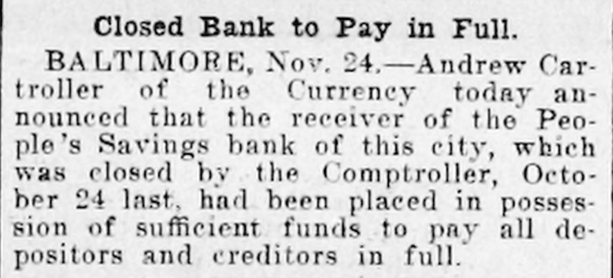 Closed Bank to Pay in Full. BALTIMORE, Nov. 24.-Andrew Cartroller of the Currency today announced that the receiver of the People's Savings bank of this city, which was closed by the Comptroller, October 24 last, had been placed in possession of sufficient funds to pay all depositors and creditors in full.