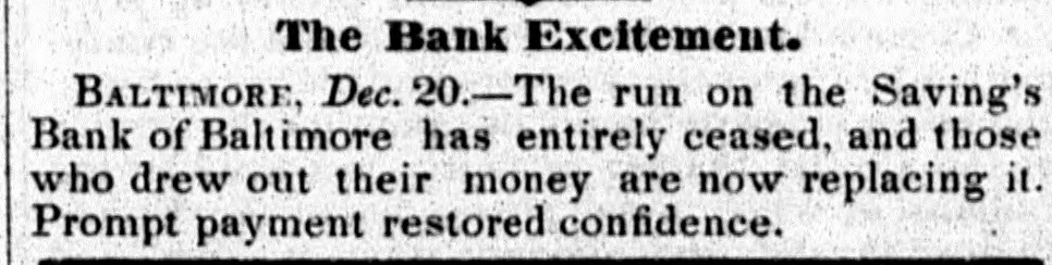 The run on the Saving's Bank of Baltimore has entirely ceased, and those who drew out their money are now replacing it. Prompt payment restored confidence.