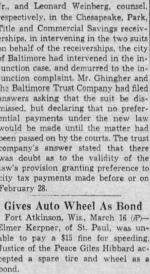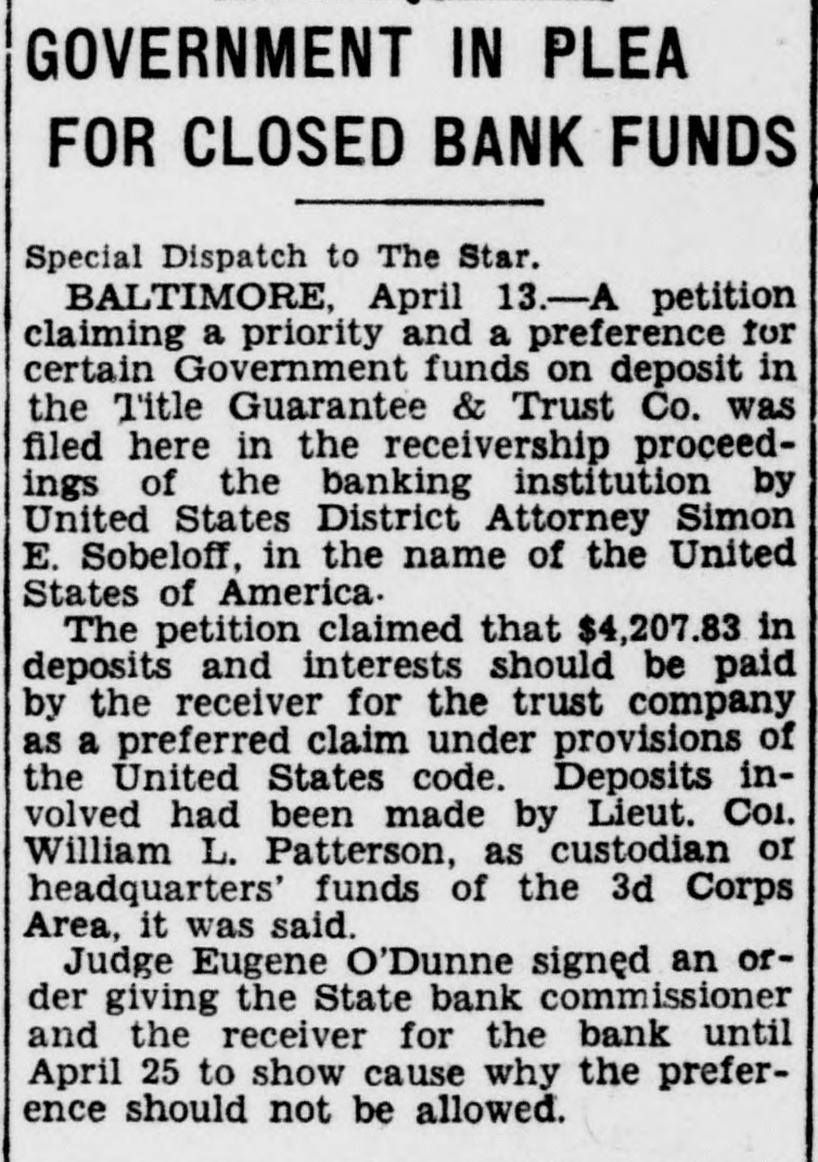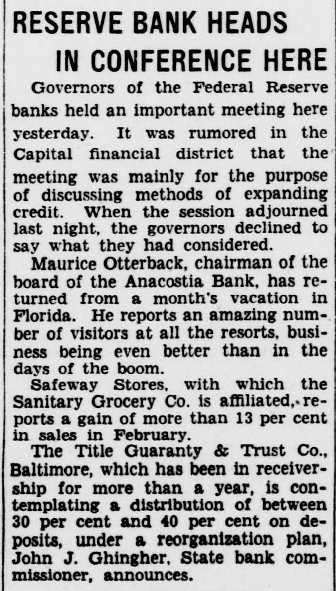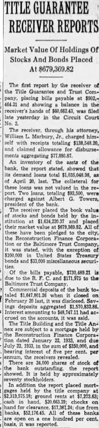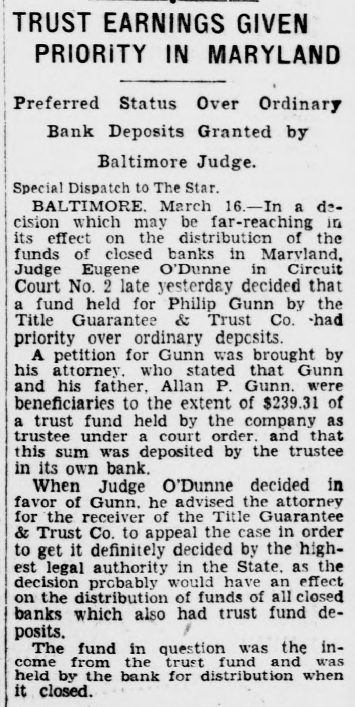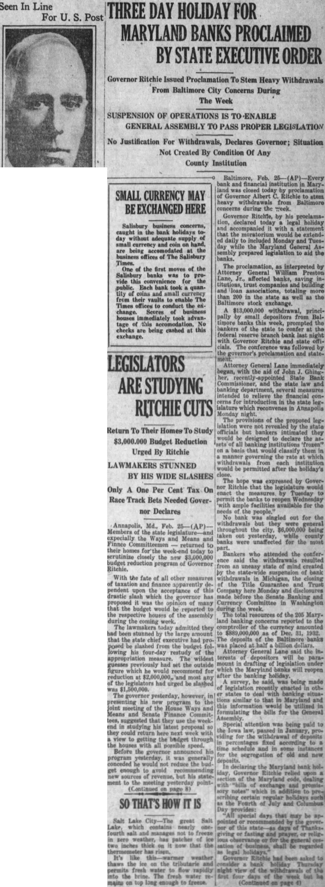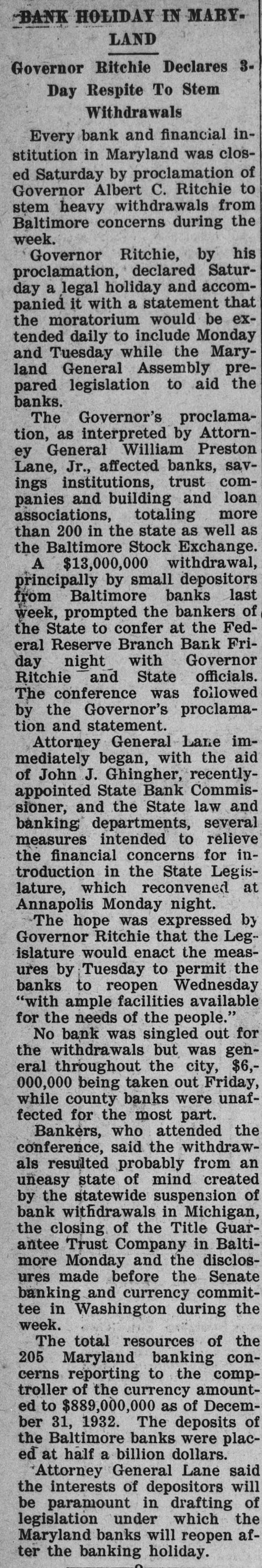 Seen In Line THREE DAY HOLIDAY For Post MARYLAND BANKS PROCLAIMED BY STATE EXECUTIVE Governor Ritchie Issued Proclamation Stem Heavy Withdrawals From Baltimore City Concerns During The Week SUSPENSION OF OPERATIONS IS TO-ENABLE GENERAL ASSEMBLY TO PASS PROPER LEGISLATION No Justification For Withdrawals, Declares Governor; Situation Not Created By Condition Of Any County Institution Baltimore, Feb. bank and financial institution Maryland was closed today by proclamation of Governor Albert Ritchie to stem heavy withdrawals from Baltimore concerns during the week. Governor Ritchfe, by his proclamation, declared today legal holiday accompanied with statement that the moratorium would be extended daily to included Monday and Tuesday while the Maryland General Assembly prepared legislation to aid the banks. The proclamation, as interpreted by Attorney General William Preston Lane, affected banks, saving intitutions, trust companies and building and loan totaling more than 200 in the state as well the Baltimore stock exchange. A $13,000,000 withdrawal, principally by small depositors from Baltimore banks this week, prompted the bankers of the state to confer at the federal reserve branch bank last night with Governor Ritchie and state officials. The was followed the governor's proclamation and stateAttorney General Lane immediately began, with the aid of John Ghingher, State Bank and the state law and banking several intended to relieve the financial cerns for introduction in the state islature which reconvenes in Annapolis Monday night. The provisions of the proposed legislation were not revealed by the state officials but bankers intimated they would designed to declare the all banking institutions basis that would classify them in manner governing the rate which withdrawals from each institution would be permitted after the holiday's close. The hope was expressed by Governor Ritchie that the legislature would enact the measures. by Tuesday permit the banks to reopen with ample facilities available for the needs of the people." No bank was singled out for the withdrawals but they were general throughout the city, being taken out yesterday, while county banks were unaffected for the most part. Bankers who attended the conference said the withdrawals resulted from an uneasy state of mind created the state-wide suspension of bank in Michigan, the closing the Title Guarantee and Trust Company here Monday and made before the Senate Banking and Currency Committee in Washington during the week. The total resources of the Maryland banking concerns reported to the the currency of Dec. 31, The deposits the Baltimore banks was placed half billion Attorney General Lane said the terests depositors will be paramount in drafting of legislation under which the Maryland banks will reopen after the banking holiday. survey, he said, was being made legislation recently enacted in othstates to deal with banking situations similar to that in and this information would be utilized formulating the bills for the General Assembly. Special attention was being paid the Iowa law, passed in January, providing for the of fixed according schedule and in some the segregation of old and new declaring the Maryland bank iday, Ritchie relied section of the code, dealing exchange and notes" which in addition scribing certain regular holidays the Fourth of July and Columbus Day special days that may be pointed by this days fasting and prayer, sation of business, shall regarded legal Governor Ritchie had asked consider bank holiday night of first days the (Continued page