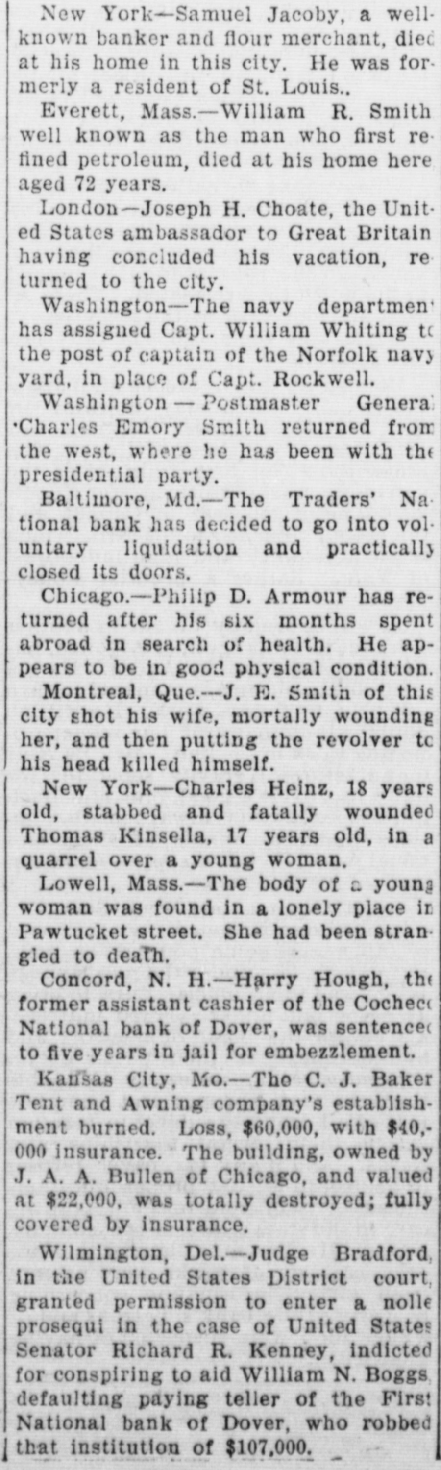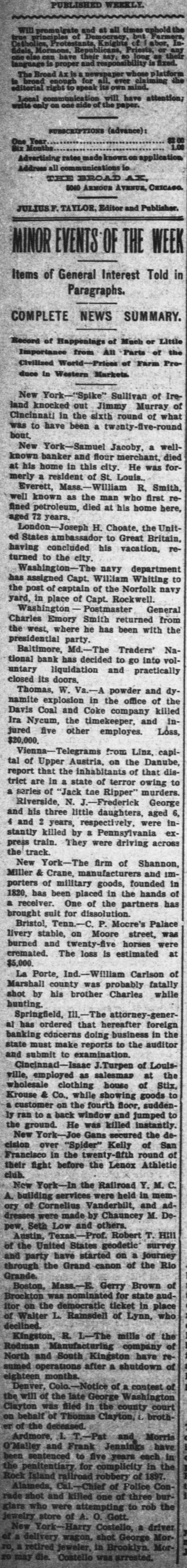 PUBLISHED all uphold the long as their language one else can is proper have their and responsibility say, so is fixed. The Broad Ax is for newspaper all, ever whose claiming platform the is editorial broad right enough to speak its own mind. Local communication will have attention; write only on one side of the paper. FUBSCRIPTIONS (advance): One Year 1.00 Bix Months. Advertising rates made known on application Address all communications is . THE BROAD AX, 5040 ARMOUR AVENUE, CHICAGO. JULIUSF. TAYLOR, Editor and Publisher. MINOR EVENTS OF THE WEEK Items of General Interest Told in Paragraphs. COMPLETE NEWS SUMMARY. Record of Happenings of Much or Little Importance from All Parts of the Civilized World-Prices of Farm Produce in Western Markets. New York-"Spike" Sullivan of Ireland knocked out Jimmy Murray of Cincinnati in the sixth round of what was to have been a twenty-five-round bout. New York-Samuel Jacoby, a wellknown banker and flour merchant, died at his home in this city. He was formerly a resident of St. Louis., Everett, Mass.-William R. Smith, well known as the man who first refined petroleum, died at his home here, aged 72 years. London-Joseph H. Choate, the United States ambassador to Great Britain, having concluded his vacation, returned to the city. Washington-The navy department has assigned Capt. William Whiting to the post of captain of the Norfolk navy yard, in place of Capt. Rockwell. Washington Postmaster General Charles Emory Smith returned from the west, where he has been with the presidential party. Baltimore, Md.-The Traders' National bank has decided to go into voluntary liquidation and practically closed its doors. Thomas, W. Va.-A powder and dynamite explosion in the office of the Davis Coal and Coke company killed Ira Nycum, the timekeeper, and injured five other employes. Loss, $20,000. Vienna-Telegrams from Linz, capital of Upper Austria, on the Danube, report that the inhabitants of that district are in a state of terror owing to a series of "Jack tae Ripper" murders. Riverside, N. J.-Frederick George and his three little daughters, aged 6, 4 and 2 years, respectively, were instantly killed by a Pennsylvania express train. They were driving across the track. New York-The firm of Shannon, Miller & Crane, manufacturers and importers of military goods, founded in 1820, has been placed in the hands of a receiver. One of the partners has brought suit for dissolution. Bristol, Tenn.-C. P. Mocre's Palace livery stable, on Moore street, was burned and twenty-five horses were cremated. The loss is estimated at $5,000. La Porte, Ind.-William Carlson of Marshall county was probably fatally shot by his brother Charles while hunting. Springfield, Ill.-The attorney-general has ordered that hereafter foreign banking concerns doing business in the state must make reports to the auditor and submit to examination. Cincinnadi-Isaac J.Turpen of Louisville, employed as salesmar at the wholesale clothing house of Stix, Krouse & Co., while showing goods to a customer on the fourth floor, suddenBy ran to a back window and jumped to the ground. He was killed instantly. New York-Joe Gans secured the decision over "Spider" Kelly of San Francisco in the twenty-Afth round of their fight before the Lenox Athletic club. New York-In the Railroad Y. M. C. A. building services were held in memof Cornelius Vanderbilt, and addresses ory were made by Chauncey M. Depew, Seth Low and others. Austin, Texas.-Prof. Robert T. Hill of the United States geodetic survey and party have started on a journey through the Grand canon of the Rio Grande. Boston, Mass.-E. Gerry Brown of Brockton was nominated for state auditor on the democratic ticket in place of Walter L. Ramsdell of Lynn, who declined. Kingston, R. L-The mills of the Rodman Manufacturing company of North and South Kingston have resumed operations after a shutdown of eighteen months. Denver, Colo.-Notice of a contest of the will of the late George Washington Clayton was filed in the county court on behalf of Thomas Clayton, brother of the deceased. Ardmore, 1. T.-Pat and Morris O'Malley and Frank Jennings have been sentenced to five years each in the penitentiary for complicity in the Rock Island railroad robbery of 1897. Alameda, Cal-Chief of Police Conrade shot and killed one of three bur- the