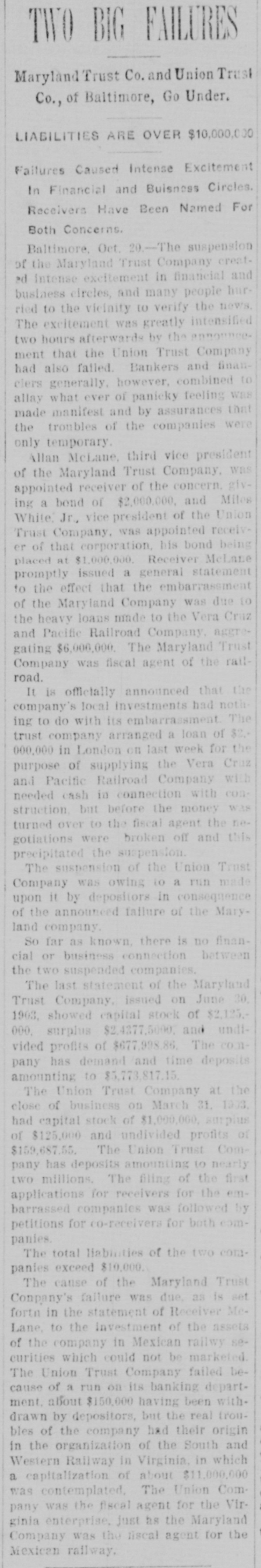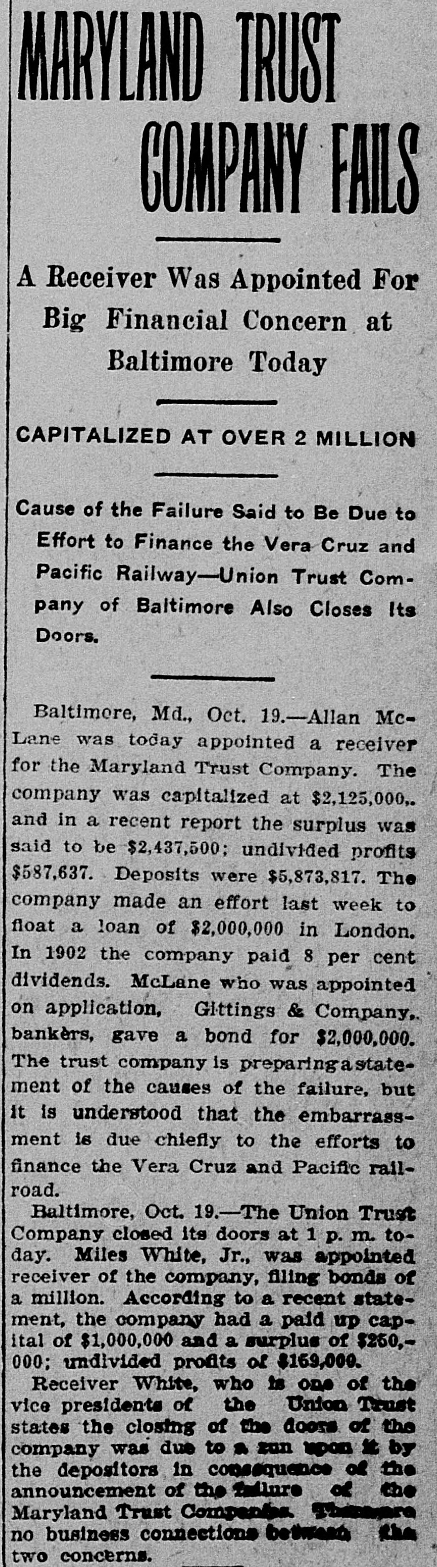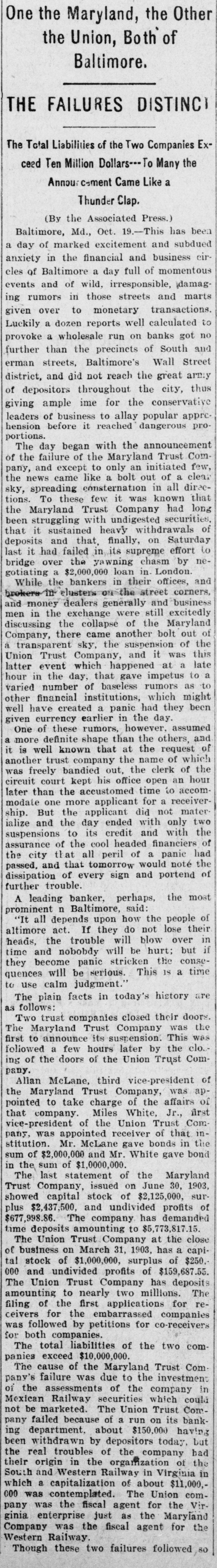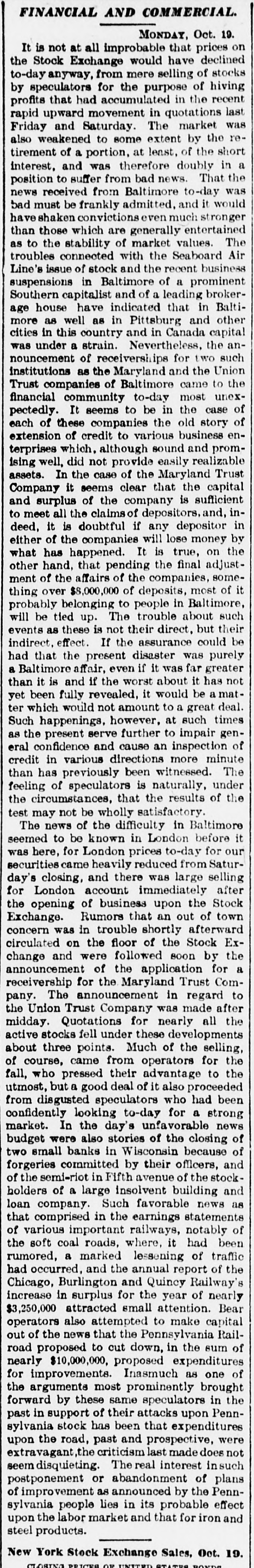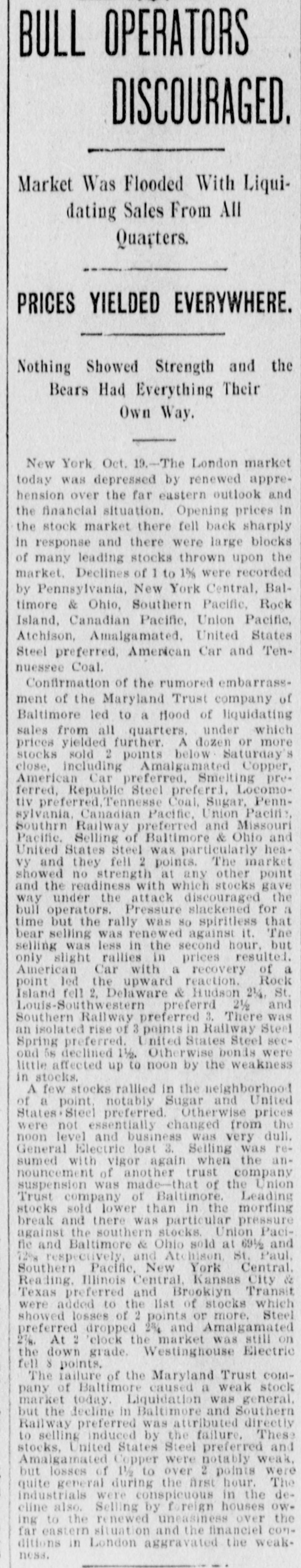 BULL OPERATORS DISCOURAGED. Market Was Flooded With Liquidating Sales From All Quarters. PRICES YIELDED EVERYWHERE. Nothing Showed Strength and the Bears Had Everything Their Own Way. New York Oct. 19.-The London market today was depressed by renewed apprehension over the far eastern outlook and the financial situation. Opening prices in the stock market there fell back sharply in response and there were large blocks of many leading stocks thrown upon the market. Declines of 1 to 1% were recorded by Pennsylvania, New York Central, Baltimore & Ohio, Southern Pacific, Rock Island, Canadian Pacific, Union Pacific, Atchison, Amalgamated. United States Steel preferred, American Car and Tennuessee Coal. Confirmation of the rumored embarrassment of the Maryland Trust company of Baltimore led to a flood of liquidating sales from all quarters, under which prices yielded further. A dozen or more stocks sold 2 points below Saturday's close, including Amalgamated Copper, American Car preferred. Smelting preferred, Republic Steel preferrd, Locomotiv preferred Tennesse Coal, Sugar, Pennsylvania, Canadian Pacific, Union Pacific, Southrn Railway preferred and Missouri Pacific. Selling of Baltimore & Ohio and United States Steel was particularly heavy and they fell 2 points. The market showed no strength at any other point and the readiness with which stocks gave way under the attack discouraged the bull operators. Pressure slackened for a time but the rally was 80 spiritiess that bear selling was renewed against it. The selling was less in the second hour, but only slight rallies in prices resulted. American Car with a recovery of a point led the upward reaction. Rock Island fell 2, Delaware & Hudson 214, St. Louis-Southwestern preferrd 2½ and Southern Railway preferred 3. There was an isolated rise of 3 points in Railway Steel Spring preferred. United States Steel second 58 declined 1½. Otherwise bonds were little affected up to noon by the weakness in stocks. A few stocks rallied in the neighborhood of a point, notably Sugar and United States:Steel preferred. Otherwise prices were not essentially changed from the noon level and business was very dull. General Electric lost 3. Selling was resumed with vigor again when the announcement of another trust company suspension was made-that of the Union Trust company of Baltimore. Leading stocks sold lower than in the morning break and there was particular pressure against the southern stocks. Union Pacifie and Baltimore & Ohio sold at 69% and 72% respectively, and Atchison St. Paul, Southern Pacific, New York Central. Reading. Illinois Central Kansas City & Texas preferred and Brooklyn Transit were added to the list of stocks which showed losses of 2 points or more. Steel preferred dropped 2% and Amalgamated 2½. At 2 clock the market was still on the down grade. Westinghouse Electric fell 8 points. The failure of the Maryland Trust company of Baltimore caused a weak stock market today. Liquidation was general. but the decline in Baltimore and Southern Railway preferred was attributed directly to selling induced by the failure. These stocks, United States Steel preferred and Amalgamated Copper were notably weak, but losses of 1½ to over 2 points were quite general during the first hour. The industrials were conspicuous in the decline also. Selling by foreign houses owing to the renewed uneasiness over the far eastern situation and the financiel conditions in London aggravated the weakness.