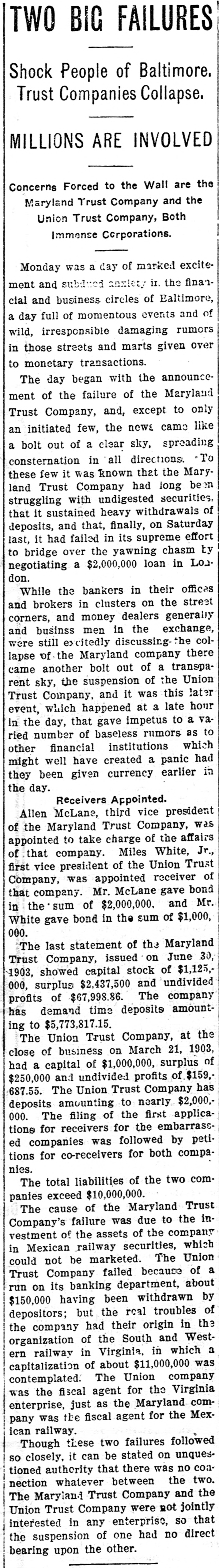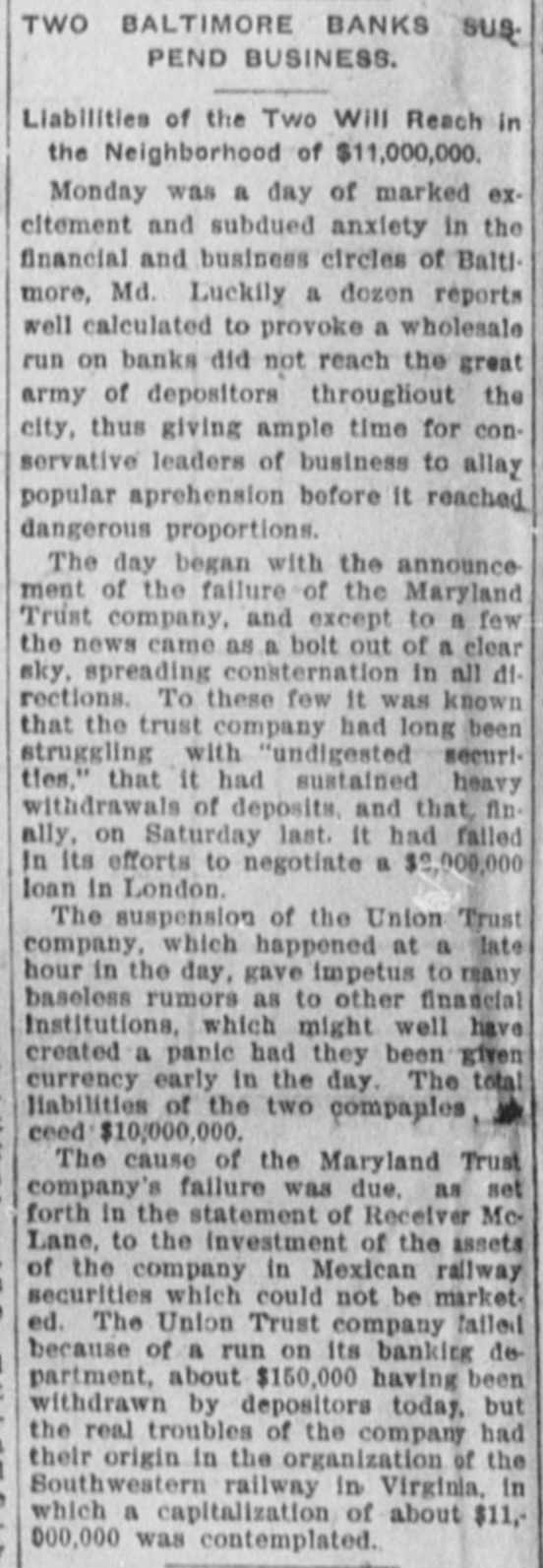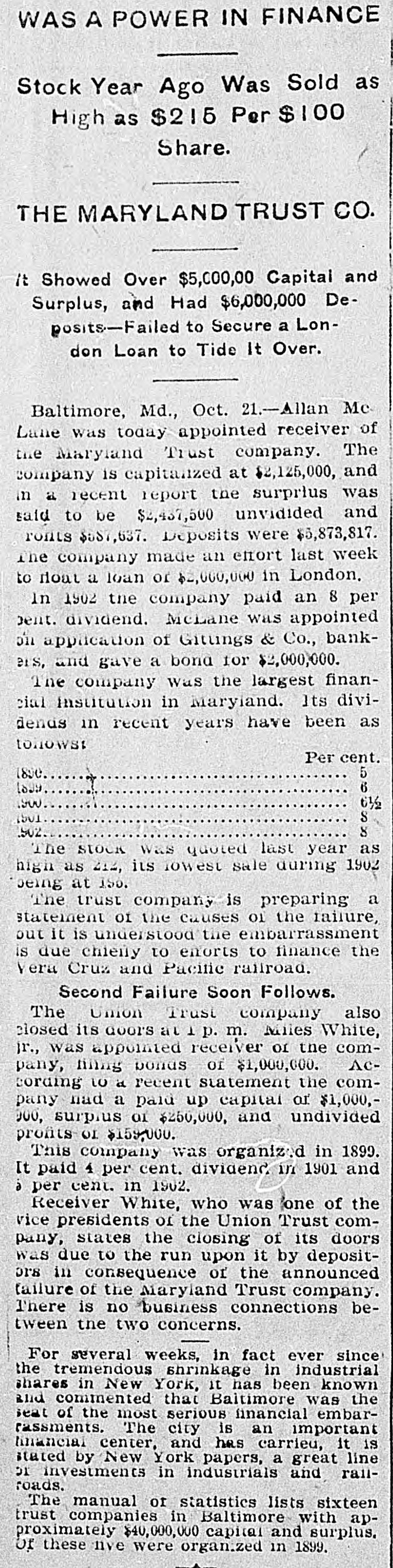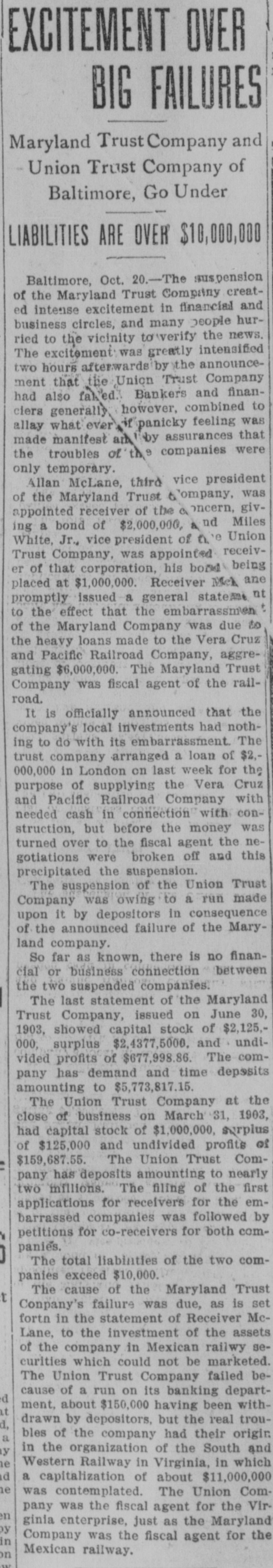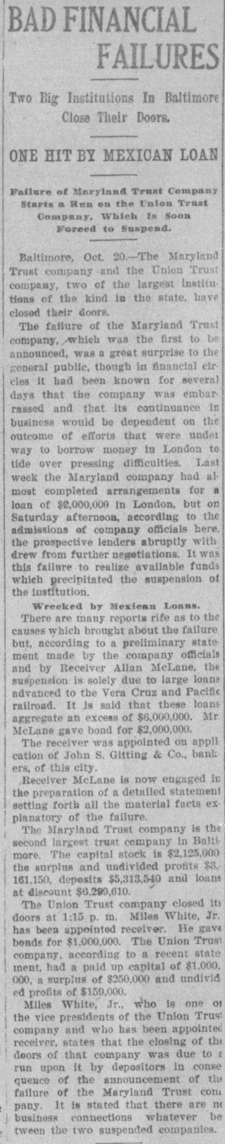 BULL OPERATORS DISCOURAGED. Market Was Flooded With Liquidating Sales From All Quarters. PRICES YIELDED EVERYWHERE. Nothing Showed Strength and the Bears Had Everything Their Own Way. New York Oct. 19.-The London market today was depressed by renewed apprehension over the far eastern outlook and the financial situation. Opening prices in the stock market there fell back sharply in response and there were large blocks of many leading stocks thrown upon the market. Declines of 1 to 1% were recorded by Pennsylvania, New York Central, Baltimore & Ohio, Southern Pacific, Rock Island, Canadian Pacific, Union Pacific, Atchison, Amalgamated. United States Steel preferred, American Car and Tennuessee Coal. Confirmation of the rumored embarrassment of the Maryland Trust company of Baltimore led to a flood of liquidating sales from all quarters, under which prices yielded further. A dozen or more stocks sold 2 points below Saturday's close, including Amalgamated Copper, American Car preferred. Smelting preferred, Republic Steel preferrd, Locomotiv preferred Tennesse Coal, Sugar, Pennsylvania, Canadian Pacific, Union Pacific, Southrn Railway preferred and Missouri Pacific. Selling of Baltimore & Ohio and United States Steel was particularly heavy and they fell 2 points. The market showed no strength at any other point and the readiness with which stocks gave way under the attack discouraged the bull operators. Pressure slackened for a time but the rally was 80 spiritiess that bear selling was renewed against it. The selling was less in the second hour, but only slight rallies in prices resulted. American Car with a recovery of a point led the upward reaction. Rock Island fell 2, Delaware & Hudson 214, St. Louis-Southwestern preferrd 2½ and Southern Railway preferred 3. There was an isolated rise of 3 points in Railway Steel Spring preferred. United States Steel second 58 declined 1½. Otherwise bonds were little affected up to noon by the weakness in stocks. A few stocks rallied in the neighborhood of a point, notably Sugar and United States:Steel preferred. Otherwise prices were not essentially changed from the noon level and business was very dull. General Electric lost 3. Selling was resumed with vigor again when the announcement of another trust company suspension was made-that of the Union Trust company of Baltimore. Leading stocks sold lower than in the morning break and there was particular pressure against the southern stocks. Union Pacifie and Baltimore & Ohio sold at 69% and 72% respectively, and Atchison St. Paul, Southern Pacific, New York Central. Reading. Illinois Central Kansas City & Texas preferred and Brooklyn Transit were added to the list of stocks which showed losses of 2 points or more. Steel preferred dropped 2% and Amalgamated 2½. At 2 clock the market was still on the down grade. Westinghouse Electric fell 8 points. The failure of the Maryland Trust company of Baltimore caused a weak stock market today. Liquidation was general. but the decline in Baltimore and Southern Railway preferred was attributed directly to selling induced by the failure. These stocks, United States Steel preferred and Amalgamated Copper were notably weak, but losses of 1½ to over 2 points were quite general during the first hour. The industrials were conspicuous in the decline also. Selling by foreign houses owing to the renewed uneasiness over the far eastern situation and the financiel conditions in London aggravated the weakness.