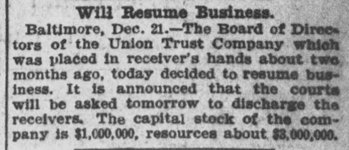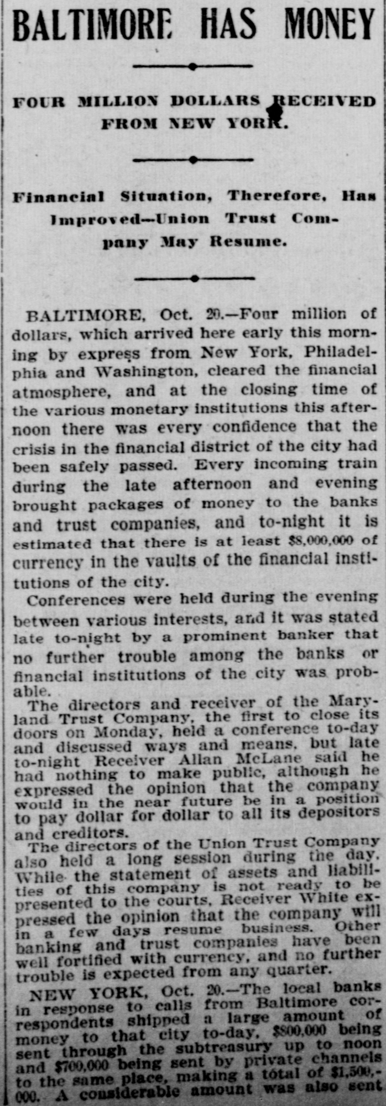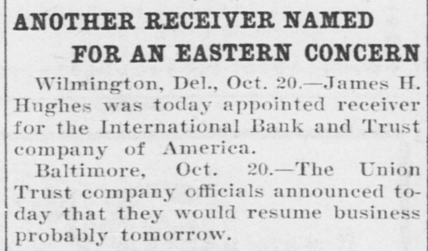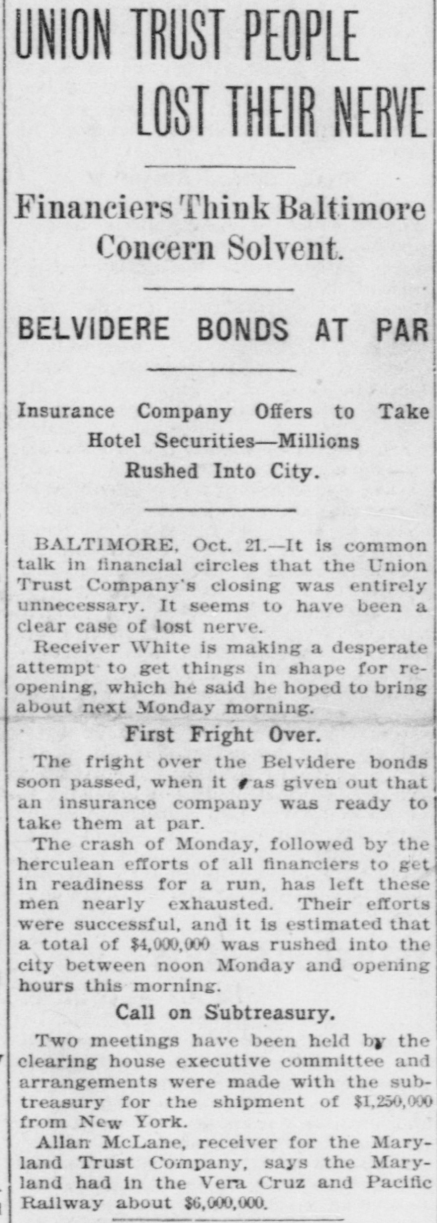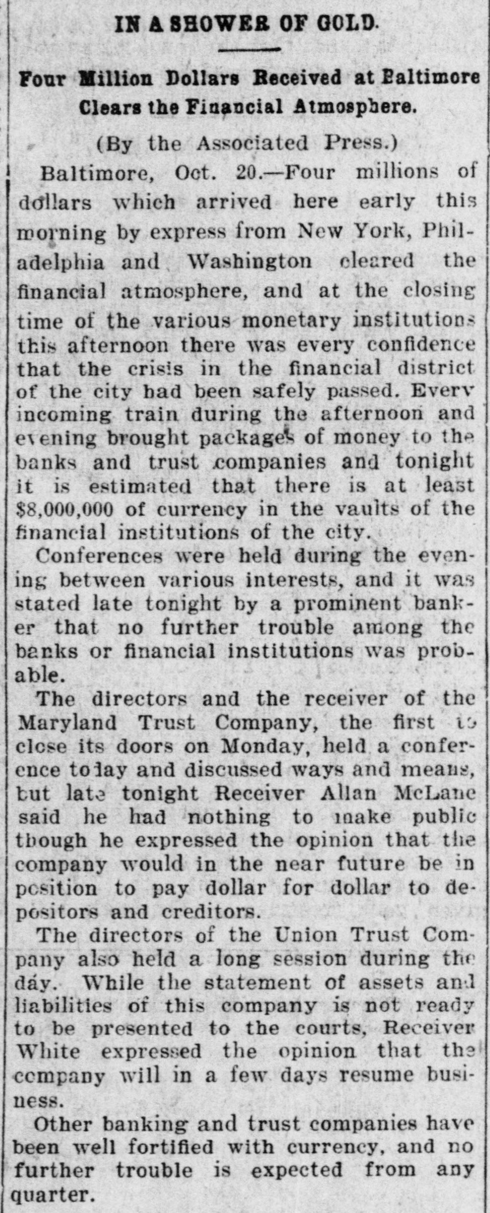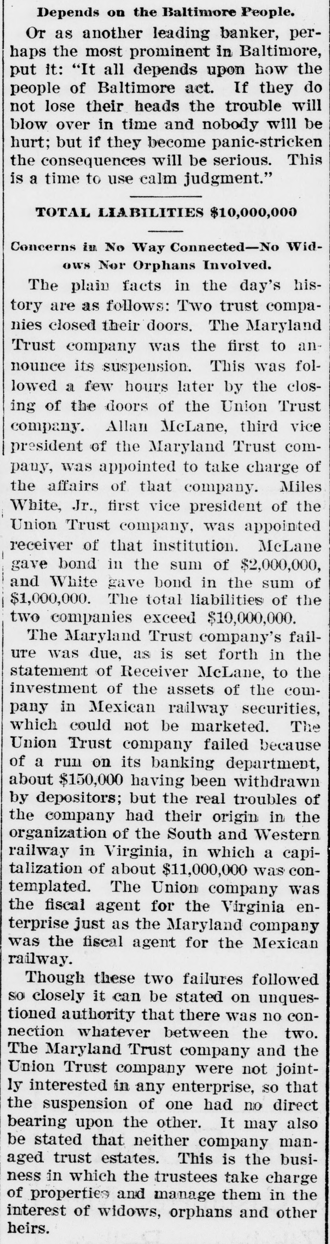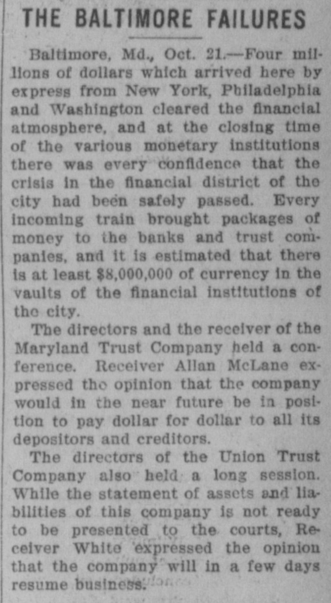 BULL OPERATORS DISCOURAGED. Market Was Flooded With Liquidating Sales From All Quarters. PRICES YIELDED EVERYWHERE. Nothing Showed Strength and the Bears Had Everything Their Own Way. New York Oct. 19.-The London market today was depressed by renewed apprehension over the far eastern outlook and the financial situation. Opening prices in the stock market there fell back sharply in response and there were large blocks of many leading stocks thrown upon the market. Declines of 1 to 1% were recorded by Pennsylvania, New York Central, Baltimore & Ohio, Southern Pacific, Rock Island, Canadian Pacific, Union Pacific, Atchison, Amalgamated. United States Steel preferred, American Car and Tennuessee Coal. Confirmation of the rumored embarrassment of the Maryland Trust company of Baltimore led to a flood of liquidating sales from all quarters, under which prices yielded further. A dozen or more stocks sold 2 points below Saturday's close, including Amalgamated Copper, American Car preferred. Smelting preferred, Republic Steel preferrd, Locomotiv preferred Tennesse Coal, Sugar, Pennsylvania, Canadian Pacific, Union Pacific, Southrn Railway preferred and Missouri Pacific. Selling of Baltimore & Ohio and United States Steel was particularly heavy and they fell 2 points. The market showed no strength at any other point and the readiness with which stocks gave way under the attack discouraged the bull operators. Pressure slackened for a time but the rally was 80 spiritiess that bear selling was renewed against it. The selling was less in the second hour, but only slight rallies in prices resulted. American Car with a recovery of a point led the upward reaction. Rock Island fell 2, Delaware & Hudson 214, St. Louis-Southwestern preferrd 2½ and Southern Railway preferred 3. There was an isolated rise of 3 points in Railway Steel Spring preferred. United States Steel second 58 declined 1½. Otherwise bonds were little affected up to noon by the weakness in stocks. A few stocks rallied in the neighborhood of a point, notably Sugar and United States:Steel preferred. Otherwise prices were not essentially changed from the noon level and business was very dull. General Electric lost 3. Selling was resumed with vigor again when the announcement of another trust company suspension was made-that of the Union Trust company of Baltimore. Leading stocks sold lower than in the morning break and there was particular pressure against the southern stocks. Union Pacifie and Baltimore & Ohio sold at 69% and 72% respectively, and Atchison St. Paul, Southern Pacific, New York Central. Reading. Illinois Central Kansas City & Texas preferred and Brooklyn Transit were added to the list of stocks which showed losses of 2 points or more. Steel preferred dropped 2% and Amalgamated 2½. At 2 clock the market was still on the down grade. Westinghouse Electric fell 8 points. The failure of the Maryland Trust company of Baltimore caused a weak stock market today. Liquidation was general. but the decline in Baltimore and Southern Railway preferred was attributed directly to selling induced by the failure. These stocks, United States Steel preferred and Amalgamated Copper were notably weak, but losses of 1½ to over 2 points were quite general during the first hour. The industrials were conspicuous in the decline also. Selling by foreign houses owing to the renewed uneasiness over the far eastern situation and the financiel conditions in London aggravated the weakness.