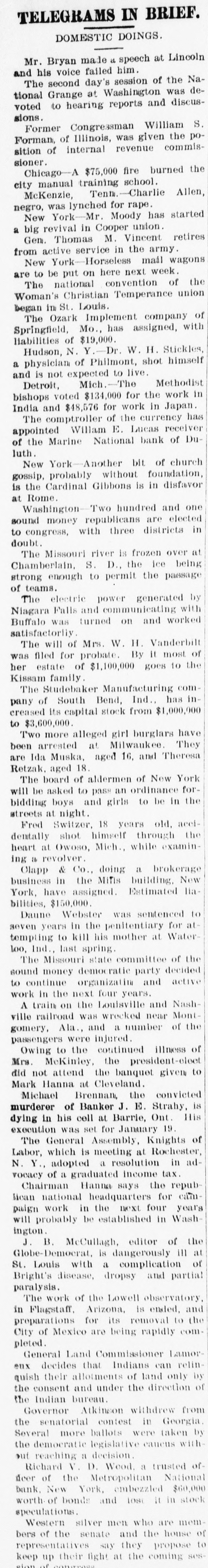 At New Castle, Cal., the Cooperative Fruit company failed for $100.000. Three masked men held up the Union Pacific fast mail near Uintah, Utah, and the mail car was robbed. In South Dakota an organized effor C is being made to boycott the hard coal combine throughout the northwest by inducing as many consumers as possible to substitute corn for fuel. At Red Key, Ind., Mrs. Col. Vernon gave her two small children a dose of poison and then poisoned herself. No cause is known for the deed. John B. Hamilton, surgeon-general of the United States marine hospital, stationed in Chicago, sent in his resignation to President Cleveland. Masked men looted the little town of Peryear, Tenn., and then started fires in many places, but they were extinguished with small loss. On the Garfield park track in Chicago James Michael, the Welshman, broke the world's five-mile record, his time being 9:17 1-5. William Smith, George Harris and Charles Jones were killed and two citizens were wounded during an attempt to rob the bank at Meeker. Cal. At Duluth, Minn., the Marine national bank suspended with heavy liabilities. The oldest financial institution in Rockford, III., the Second national bank, closed its doors, having gone into voluntary liquidation. At Columbus, Ga., J. A. White shot and killed Richard M. Adams and William Jackson, police officers who were trying to arrest him, and was himself shot dead. By a wreck on the Florida Central road near Swansea, Ga., Baggage Master Lines and Mail Clerk Thomas was pinned down in the debris and burned to death. At Baltimore, Md., the Manchester Cigar Manufacturing company failed for $100,000. It is reported that if Spain does not put down the insurrection in Cuba by March 1 next it is the intention of the government to give up the struggle and to let the island go. The Fifteenth infantry, U. S. A., left for Fort Bayard, N. M., after a residence of six years at Fort Sheridan, near Chicago. Col. Robert H. Hall, of the Fourth infantry, succeeds Col. Crofton as commandant of Fort Sheridan. At the age of 69 years Thomas White Ferry, ex-United States senator, died at his residence in Grand Haven, Mich., from cerebral apoplexy. J. S. Miller, a farmer living four miles north of Linden, Wash., lost his house by fire and six children were burned to death. Near Piedmont, Mo., John Imboden. aged 23, killed his sister, brother and an old man named Jacob Wilhelm who made his home with the Imbodens. George McKerrow, of Wisconsin, was elected president at the session in Chicago of the International Association of Farmers' Institutes. At the annual meeting in Manchester, la., J. II. Brigham, of Delta, 0, president of the National Grange, said that there are now nearly 100,000,000 members, and 27,000 granges in the United States. At a political meeting in Shelbyville, Ind., an anvil burst and balf of it was blown through a window in the residence of John Lansing, fatally injuring two children who were sleeping in the room. At Indianapolis, Ind., Rev. John W. Milam, pastor of the Madison Avenue M. E. church, and his wife have both been declared insane. Overwork on illness on her nort were