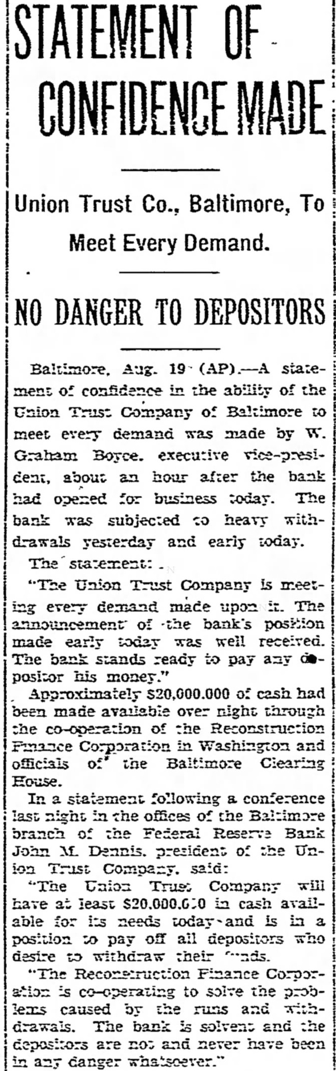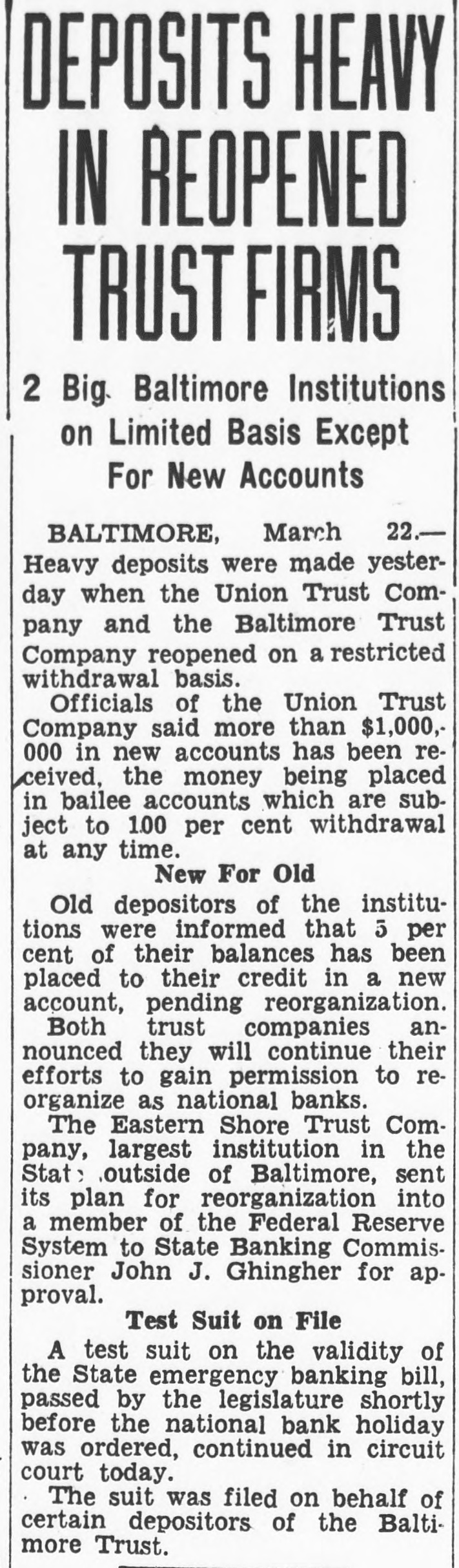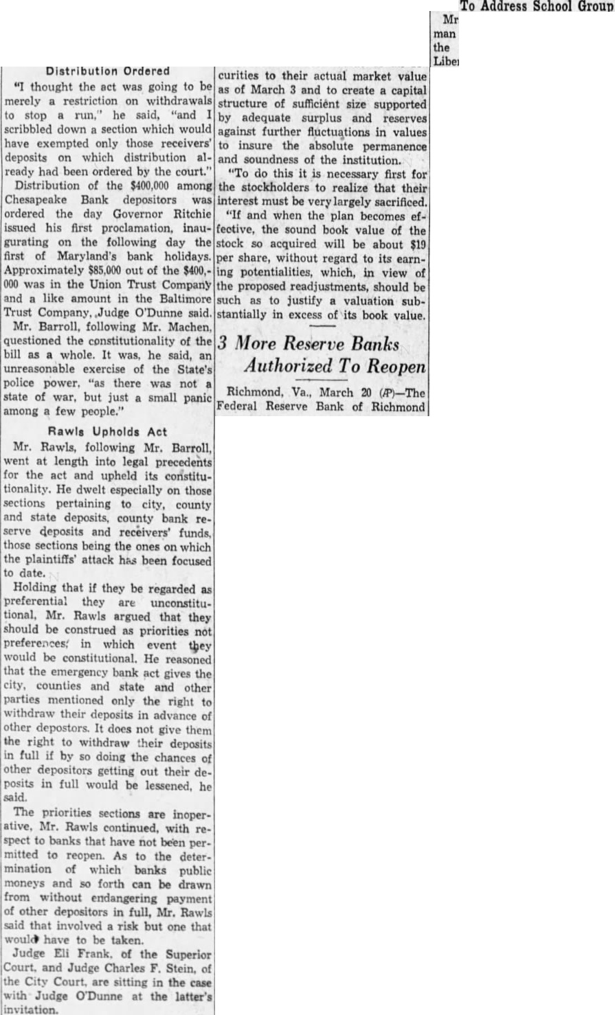 $6,000,000 Available Approximately $6,000,000 of deposits will be made available without restriction for the use of depositors on the day of reopening, according to estimates which previously have been nounced by Benjamin H. Brewster, president of the trust company. Mr. Brewster absent from the day and could not be reached for Notices were mailed last night the subscribers the $500,000 tal notes asking for by Friday. This will enable the trust to give notice to the Federal pany Reserve Bank at Richmond this week that the additional capital has actually The capital was specified by the Federal Reserve Board Washington, following several hearings on the application, condition membership.