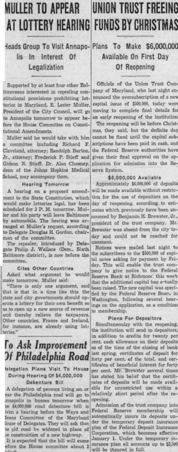 Supported by least four other Baltimoreans interested in repealing constitutional provisions prohibiting lotteries in Maryland, E. Lester Muller, President of the City Council, will Annapolis tomorrow to appear fore the House Committee on Constitutional Amendments. Muller said he would take with him committee including Richard Cleveland, attorney; Barton, Jr., attorney; Frederick Stieff and Gideon N. Stieff. Dr. Alan Chesney, dean of the Johns Hopkins Medical School, may accompany them. Hearing Tomorrow hearing on proposed amendment the State Constitution, which would legal, has for Muller and his party will leave Baltimore by The hearing was ranged at Muller's Delegate Douglas H. Gordon, chairof the committee. The repealer, introduced by Delegate Philip Wallace (Dem., Sixth Baltimore district), is now before the committee.