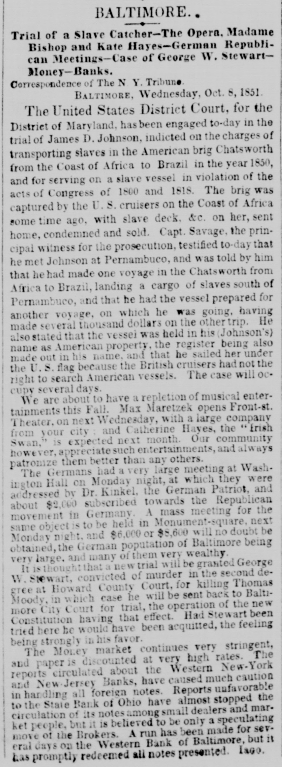 BALTIMORE, Trial of a Slave Catcher-The Opera, Madame Bishop and Kate Hayes-German Republican Meetings-Case of George W. StewartMoney-Banks. Correspondence of The N Y. Tribune BALTIMORE, Wednesday, Oct. 8, 1851. The United States District Court, for the District of Maryland, has been engaged to-day in the trial of James D. Johnson, indicted on the charges of transporting slaves in the American brig Chatsworth from the Coast of Africa to Brazil in the year 1850, and for serving on a slave vessel in violation of the acts of Congress of 1800 and 1818. The brig was captured by the U.S. cruisers on the Coast of Africa some time ago, with slave deck. &c. on her, sent home, condemned and sold. Capt. Savage, the principal witness for the prosecution, testified to-day that he met Johnson at Pernambuco, and was told by him that he had made one voyage in the Chatsworth from Africa to Brazil, landing a cargo of slaves south of Pernambuco, and that he had the vessel prepared for another voyage, on which he was going, having made several thousand dollars on the other trip. He also stated that the vessel was held in his (Johnson's) name as American property, the register being also made out in his name, and that he sailed her under the U.S flag because the British cruisers had not the right to search American vessels. The case will oc. cupy several days. We are about to have a repletion of musical entertainments this Fall. Max Maretzek opens Front-st. Theater, on next Wednesday, with a large company from your city and Catherine Hayes, the " rish Swan," is expected next month. Our community however, appreciate such entertainments, and always patronize them better than any others. The Germans had a very large meeting at Wash. ington Hall on Monday night, at which they were addressed by Dr. Kinkel, the German Patriot, and about $2,000 subscribed towards the Republican movement in Germany. A mass meeting for the same object is to be held in Monument-square. next Monday night. and $6,000 or $8,600 will no doubt be obtained, the German poputation of Baltimore being very large. and many of them very wealthy. It is thought that a new trial will be granted George W. Stewart, convicted of murder in the second degree at Howard County Court, for killing Thomas Moody, in which case he will be sent back to Baltimore City Court for trial, the operation of the new Constitution having that effect. Had Stewart been tried here he would have been acquitted, the feeling being strongly in his favor. The Money market continues very stringent, and paper is discounted at very high rates. The reports circulated about the Western New-York and New-Jersey Banks, have caused much caution in handling all foreign notes. Reports unfavorable to the State Bank of Ohio have almost stopped the circulation of its notes among small dealers and market people, but it is believed to be only a speculating move of the Brokers. A run has been made for several days on the Western Bank of Baltimore, but it has promptly redeemed all notes presented. Iago.